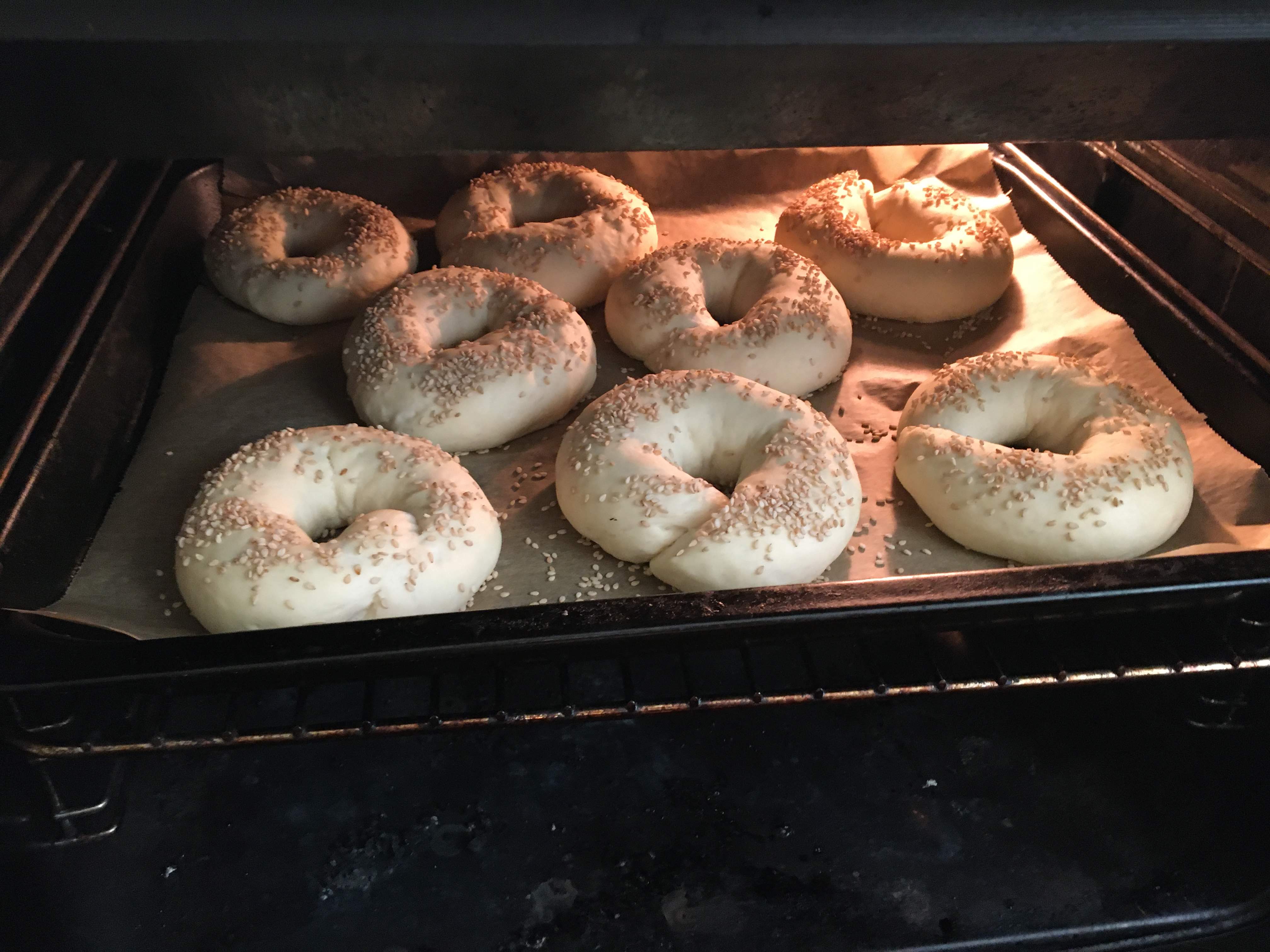 Boiling: Boil the water with the salt in a saucepan. Carefully place 2-3 pieces of bagels at a time into the boiling water. Let simmer for about 4 minutes. Turn them once in the meantime.