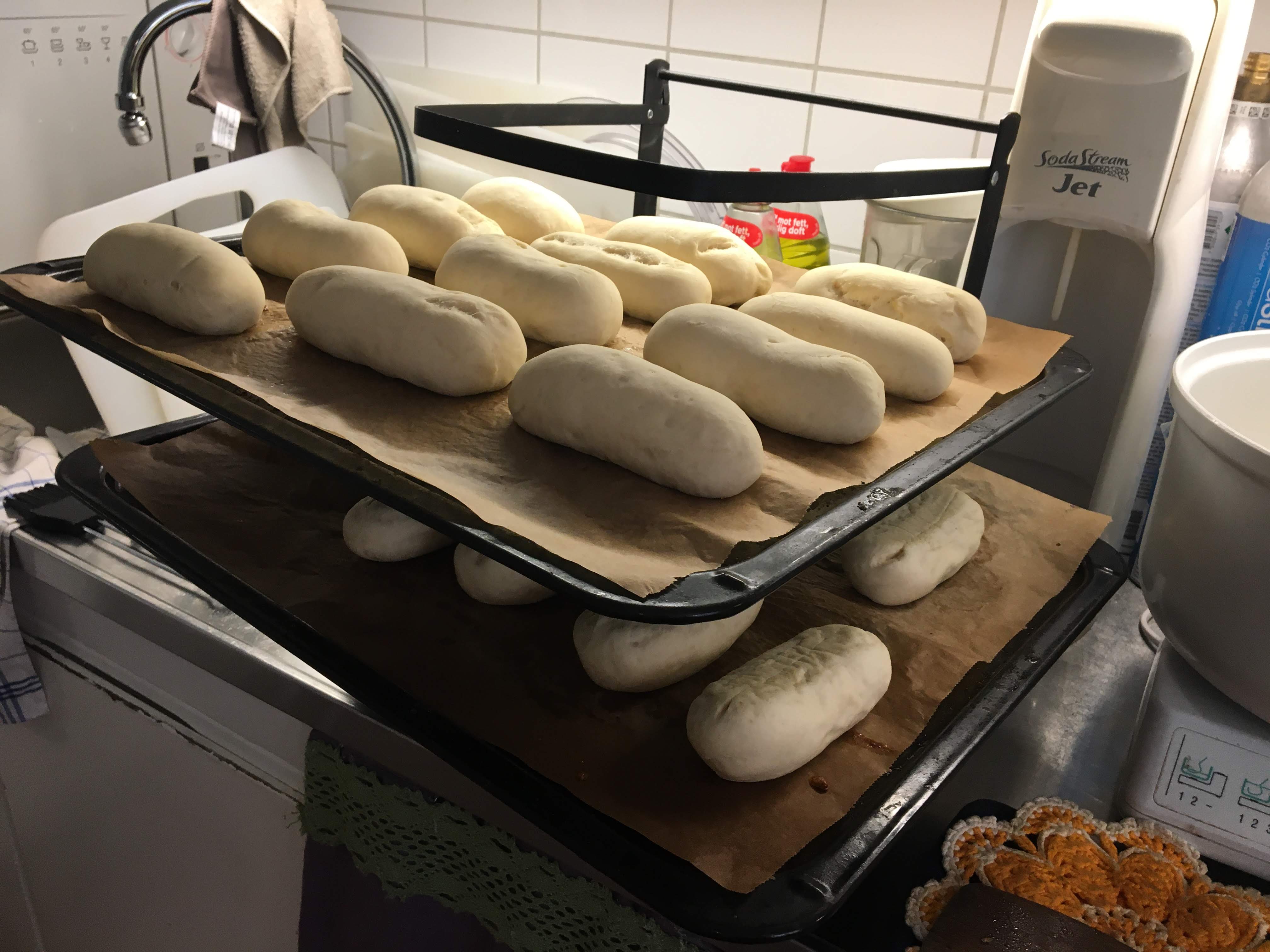 Lay the lengths or buns on a sheet, lubricated or with baking sheet paper and allow to rise for about 25 minutes under the baking cloth.