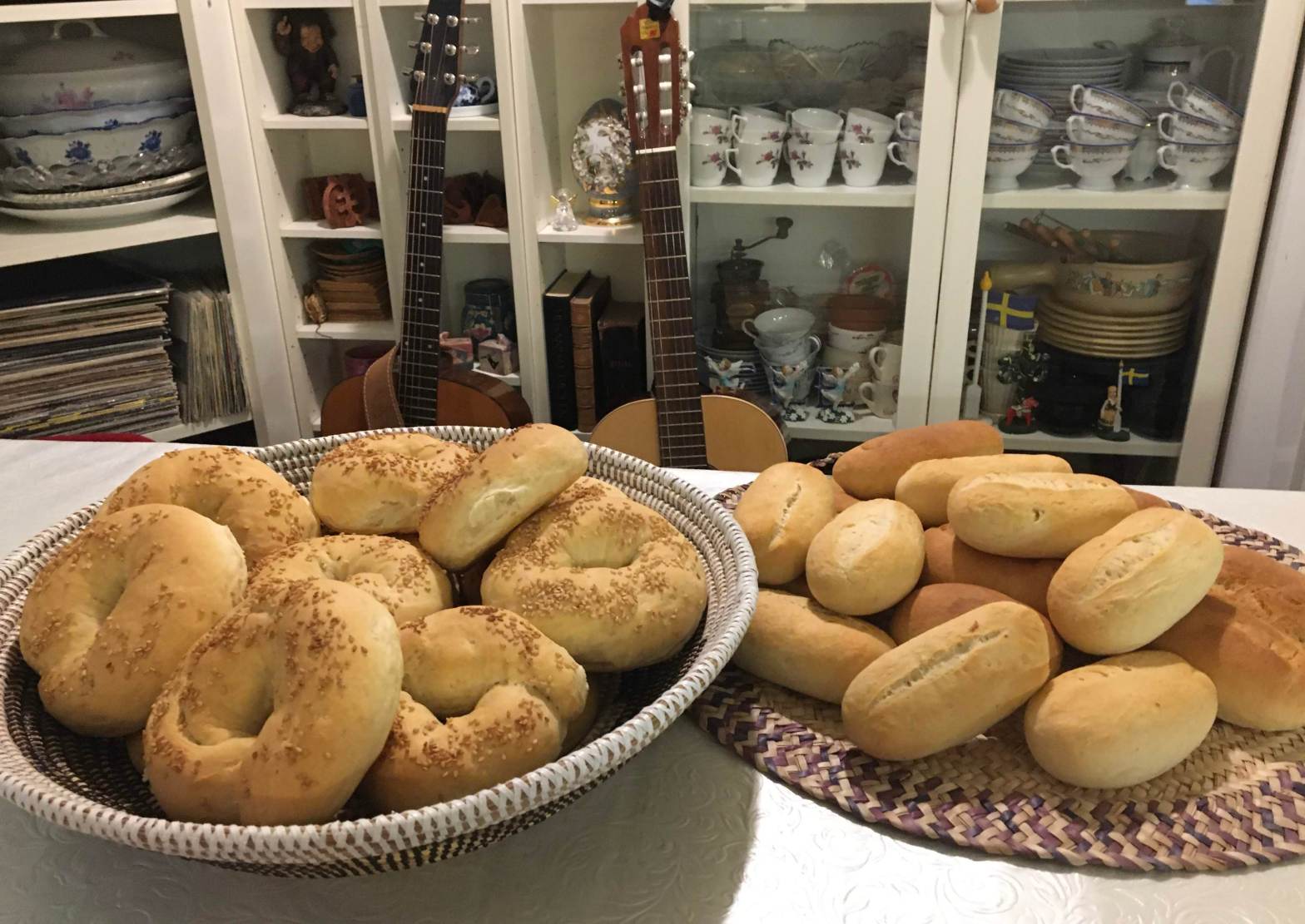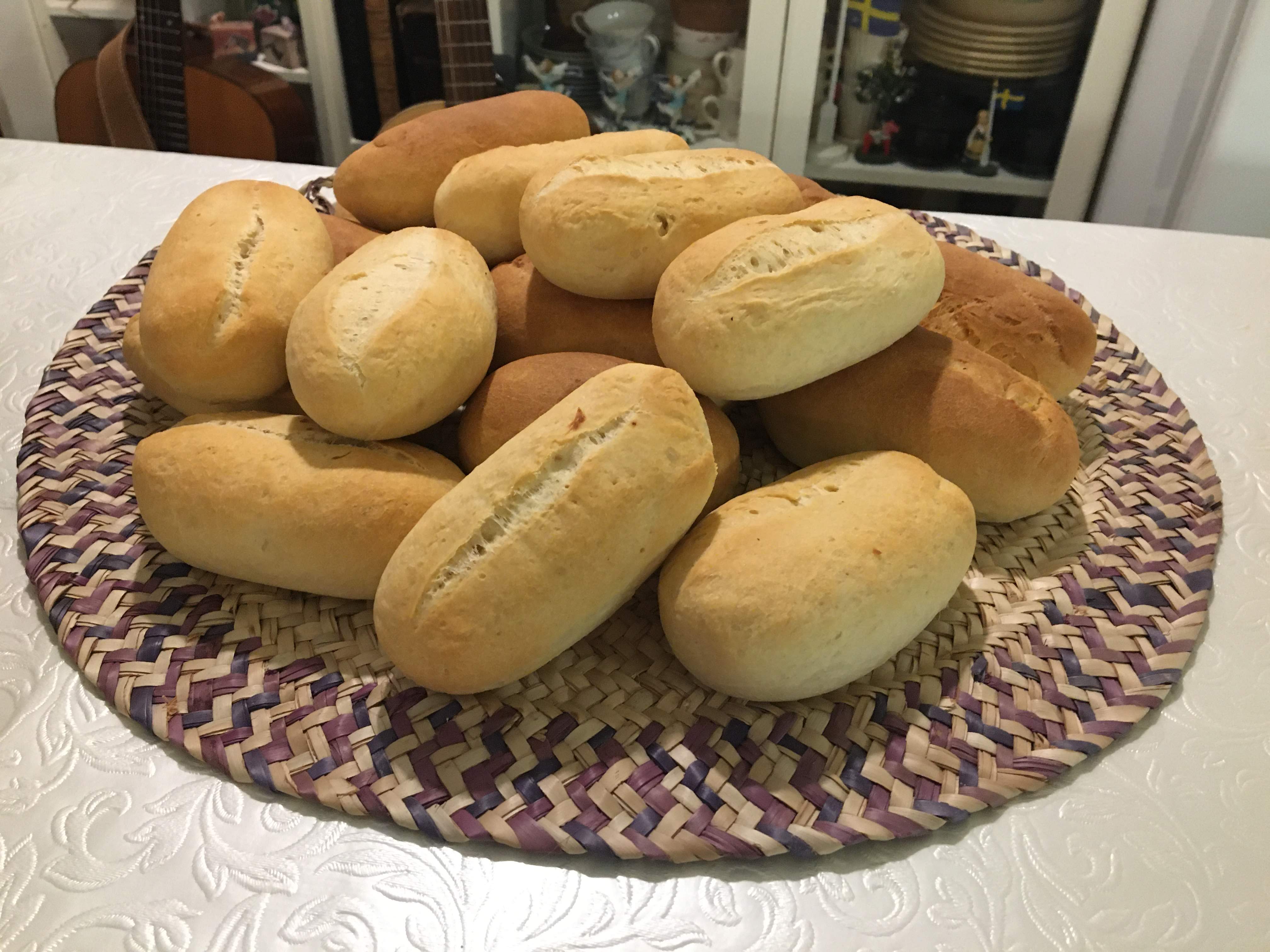 Don’t forget to put a pan with hot water in the oven to get a moist heat. It is only then that the bread is rising and gets its characteristic crunchy surface.
