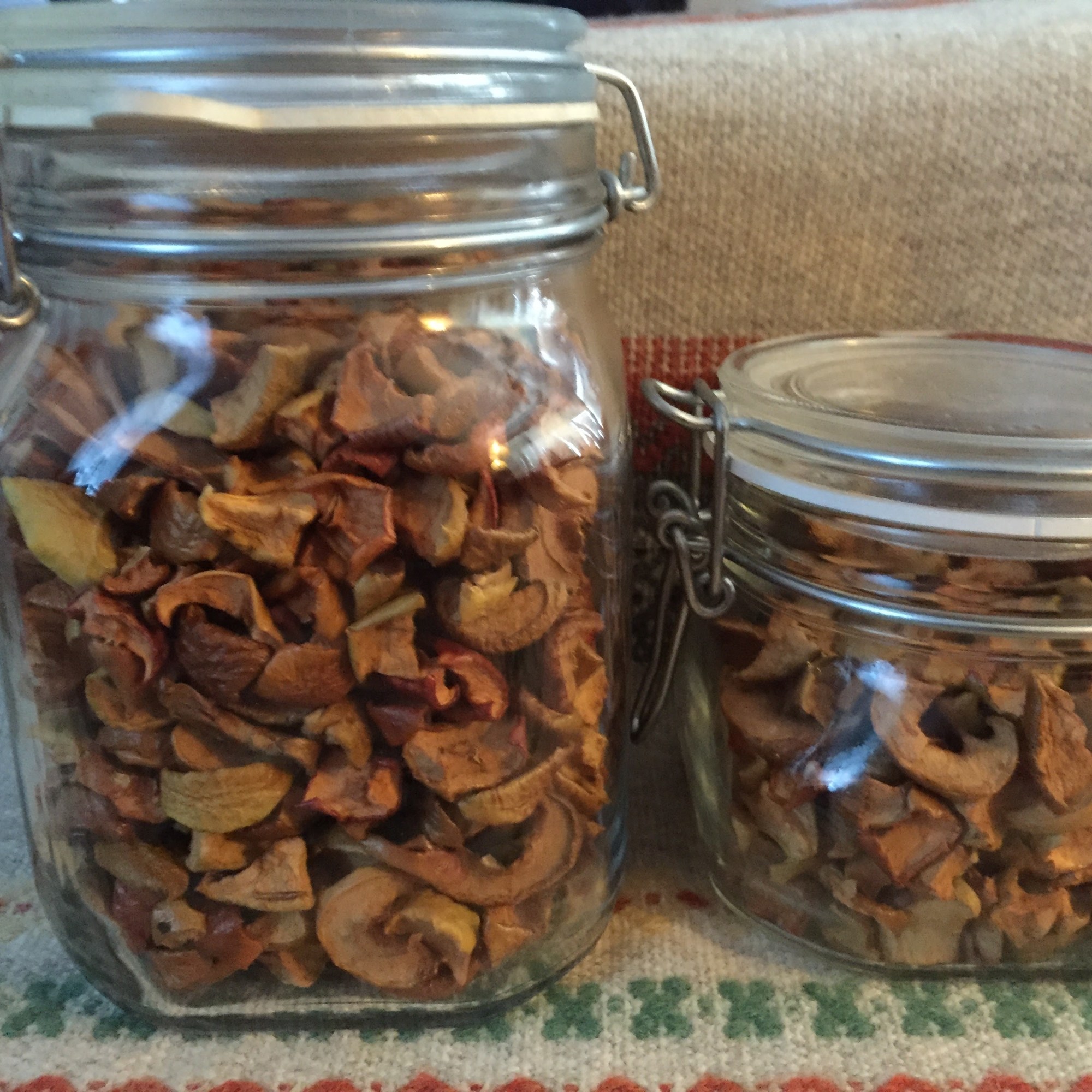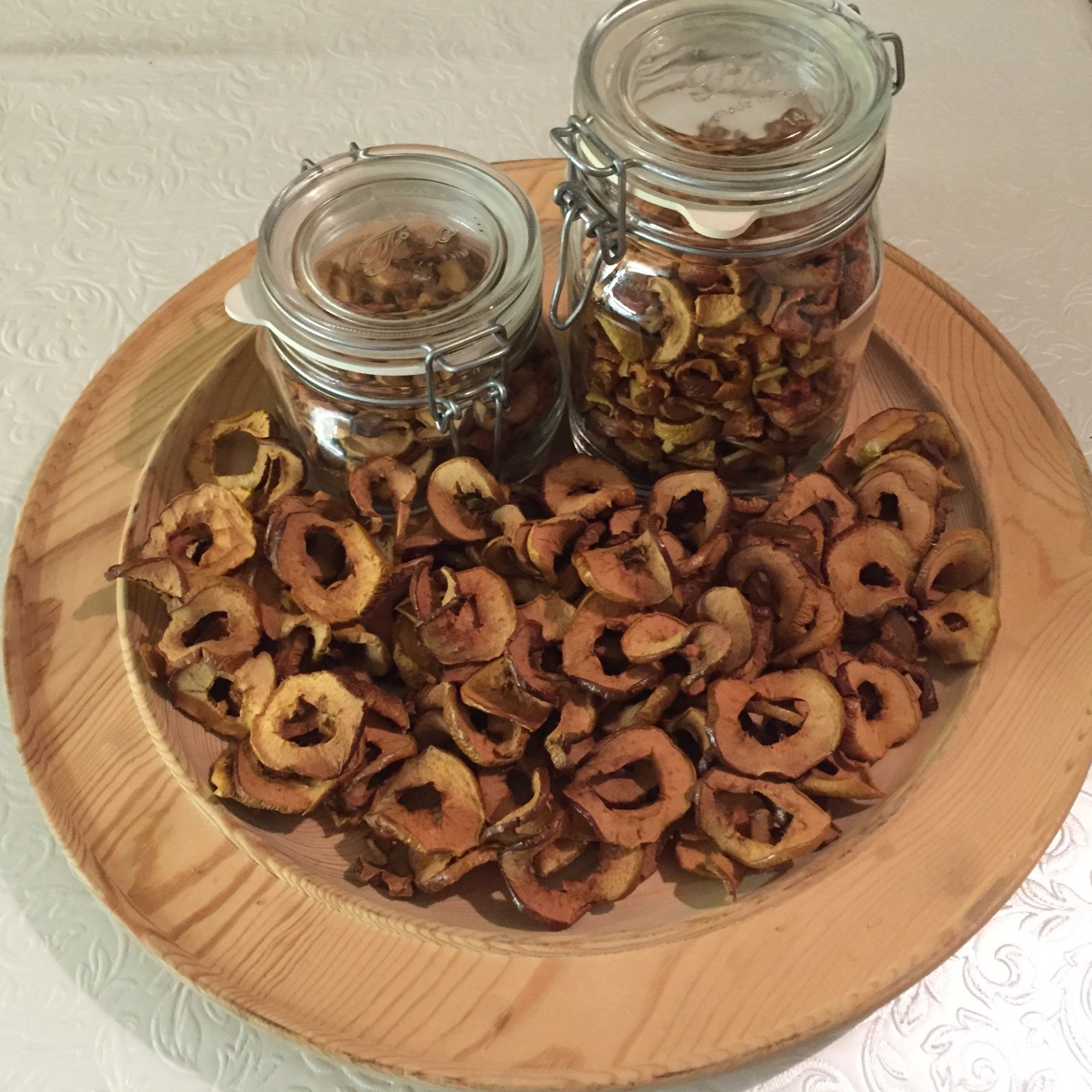 Peel a bunch of apples. Core properly and then slice into about 23 mm thick slices. Either you put them then on a grid, put them in the oven at 100 Celsius degrees with the stem of a spoon at the door so there is a tiny gap. Then, just wait until they have the perfect texture. Best is to put them in early in the evening and then turn off the oven when going to bed. Than in the morning they will be done.