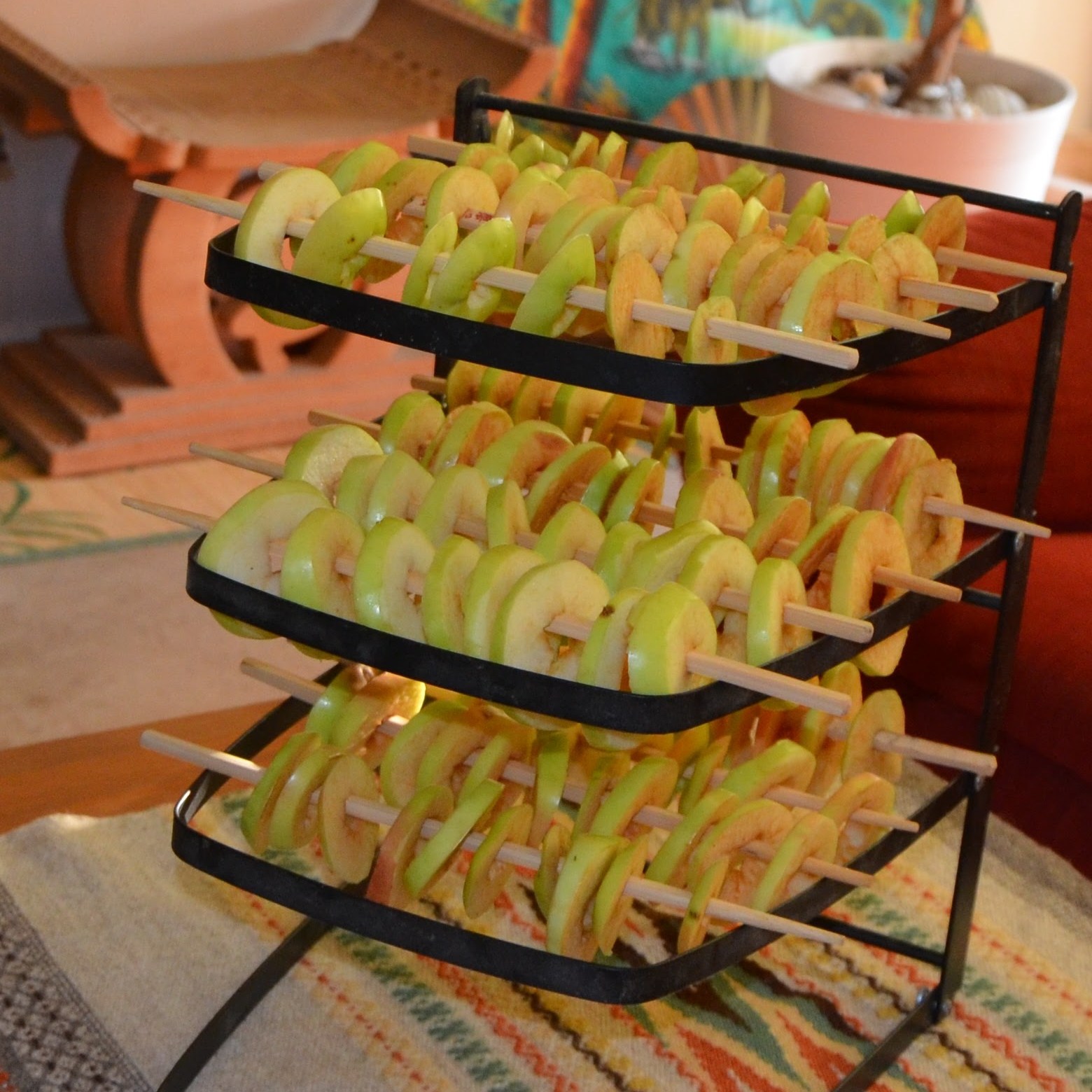 Option two is a bit cozier but takes longer time – Cut the apples in apple-rings and hang to dry on a string, or as me I used Chinese chopsticks that I put on a cooling rack I have. Anyways whatever you have, hang the apple-rings somewhere where they can be left alone. A good place is in front of a window so they get some sun. Just leave them until they have the right texture.