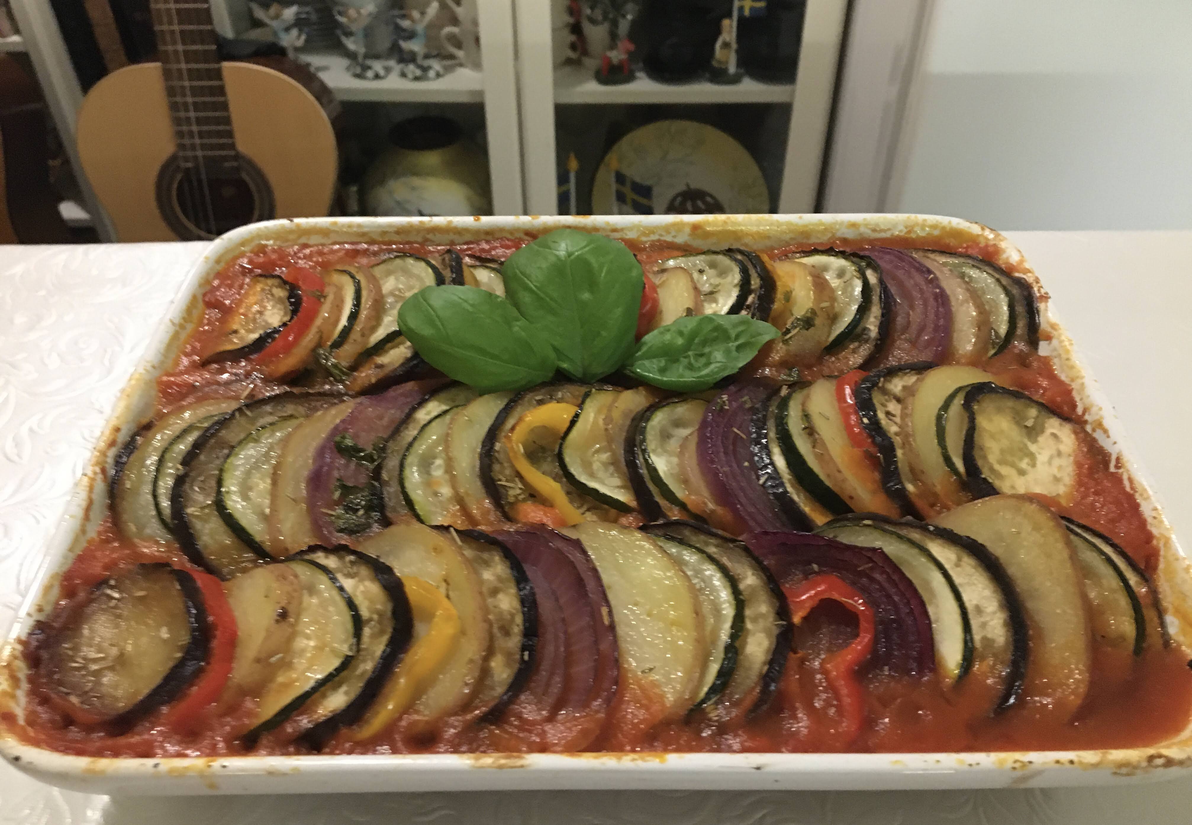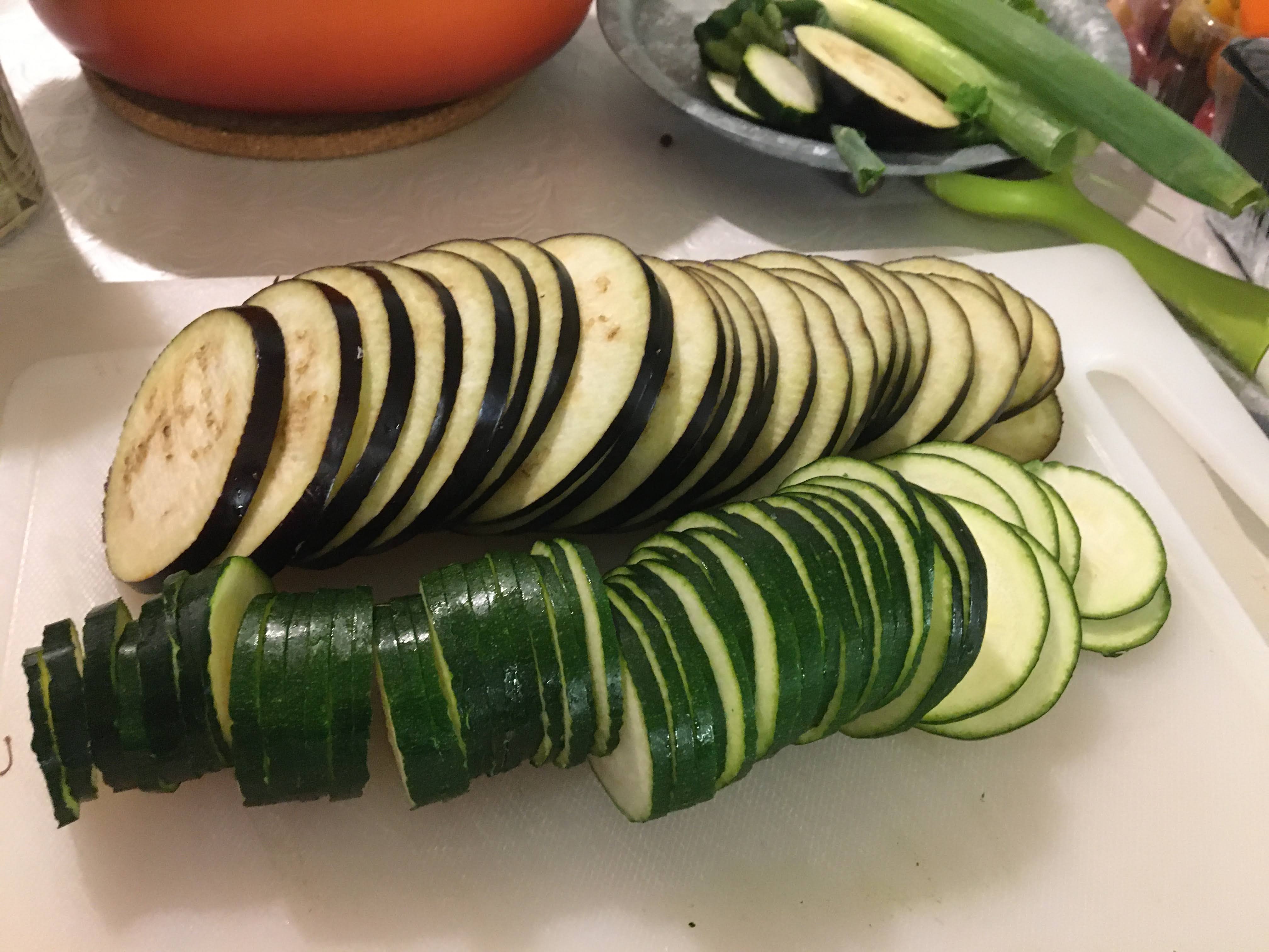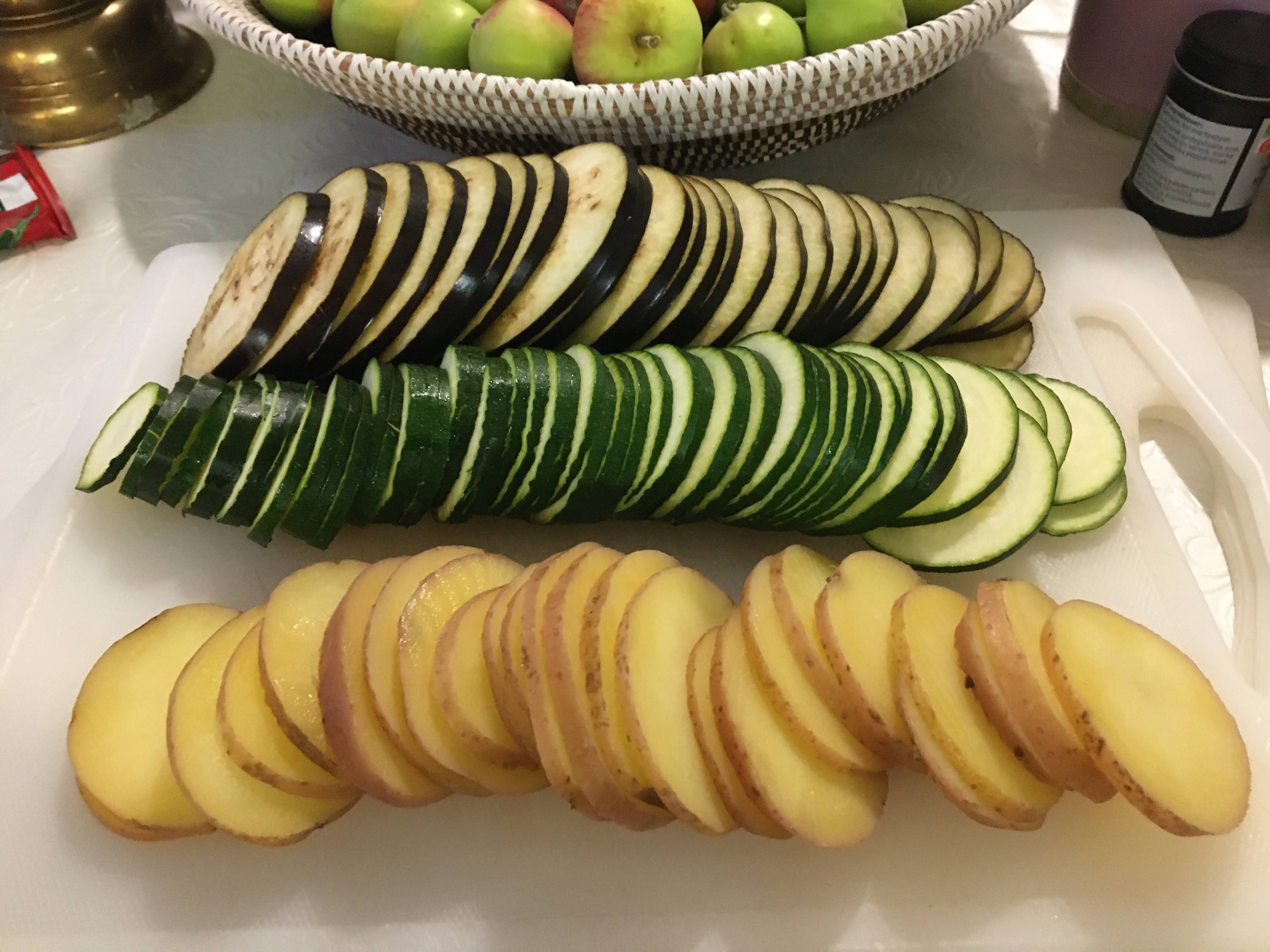 Slice the red onion, courgette, aubergine, potoatoes, big tomatoes into approximately ¹⁄₁₆-inch (1-mm) rounds, then set aside. Place the potatoes in a bowl cold water for a while to get the starch out. You can even precook the potatoeslices for about 10 minutes to shorten the bakingtime of the Ratatouille in oven later. Take out and put on a papertowel and pat dry before assembling the ratatouille. (I didn´t have tomatoes so I made without).
