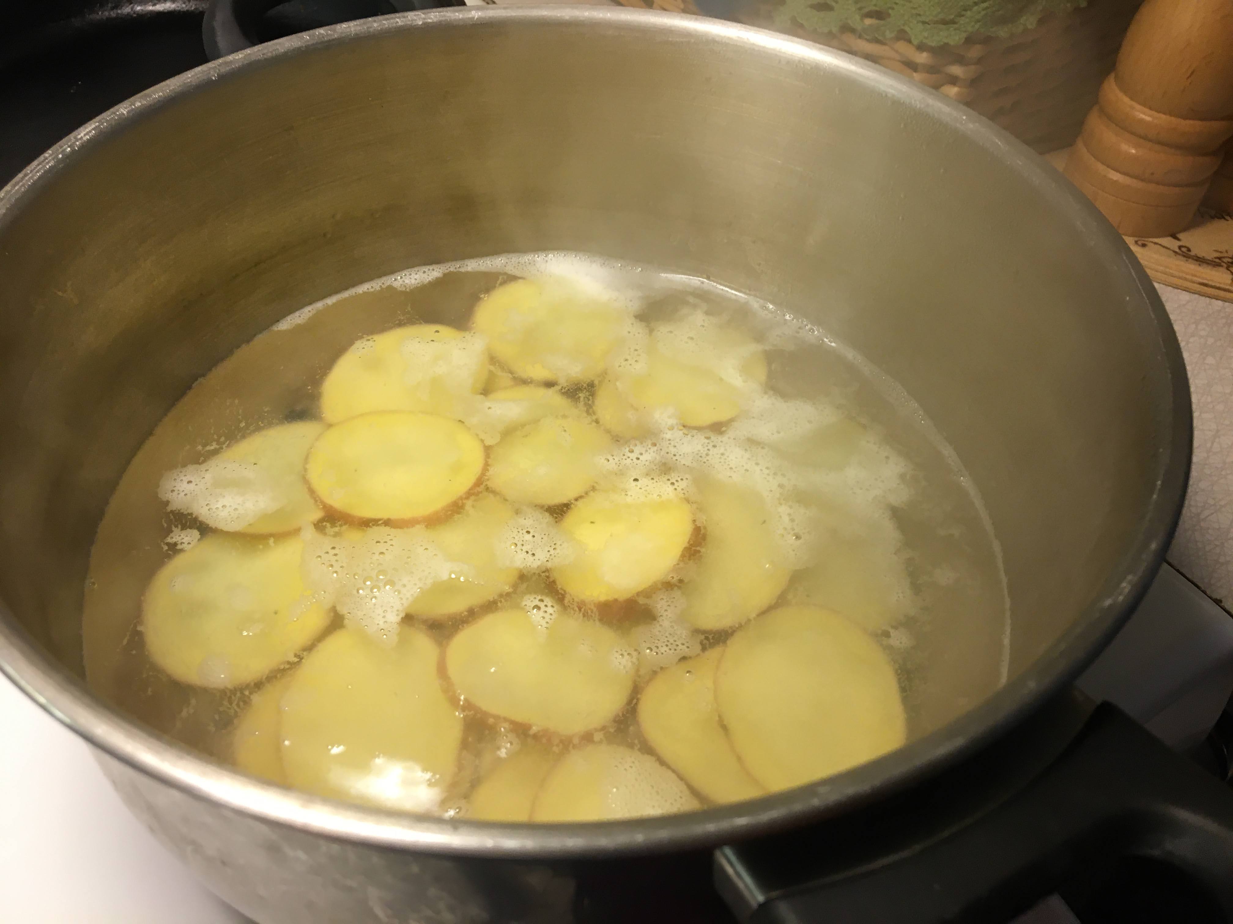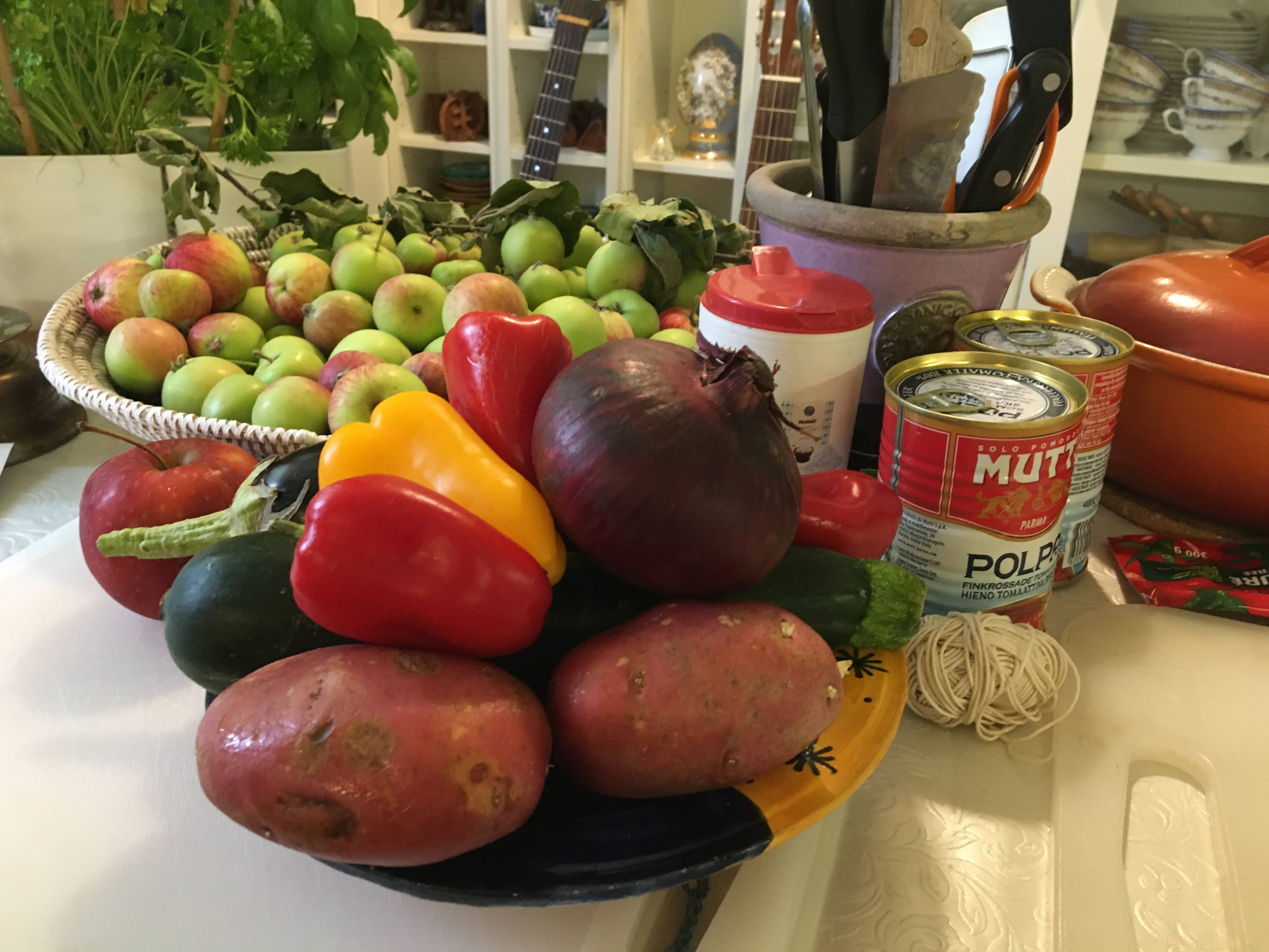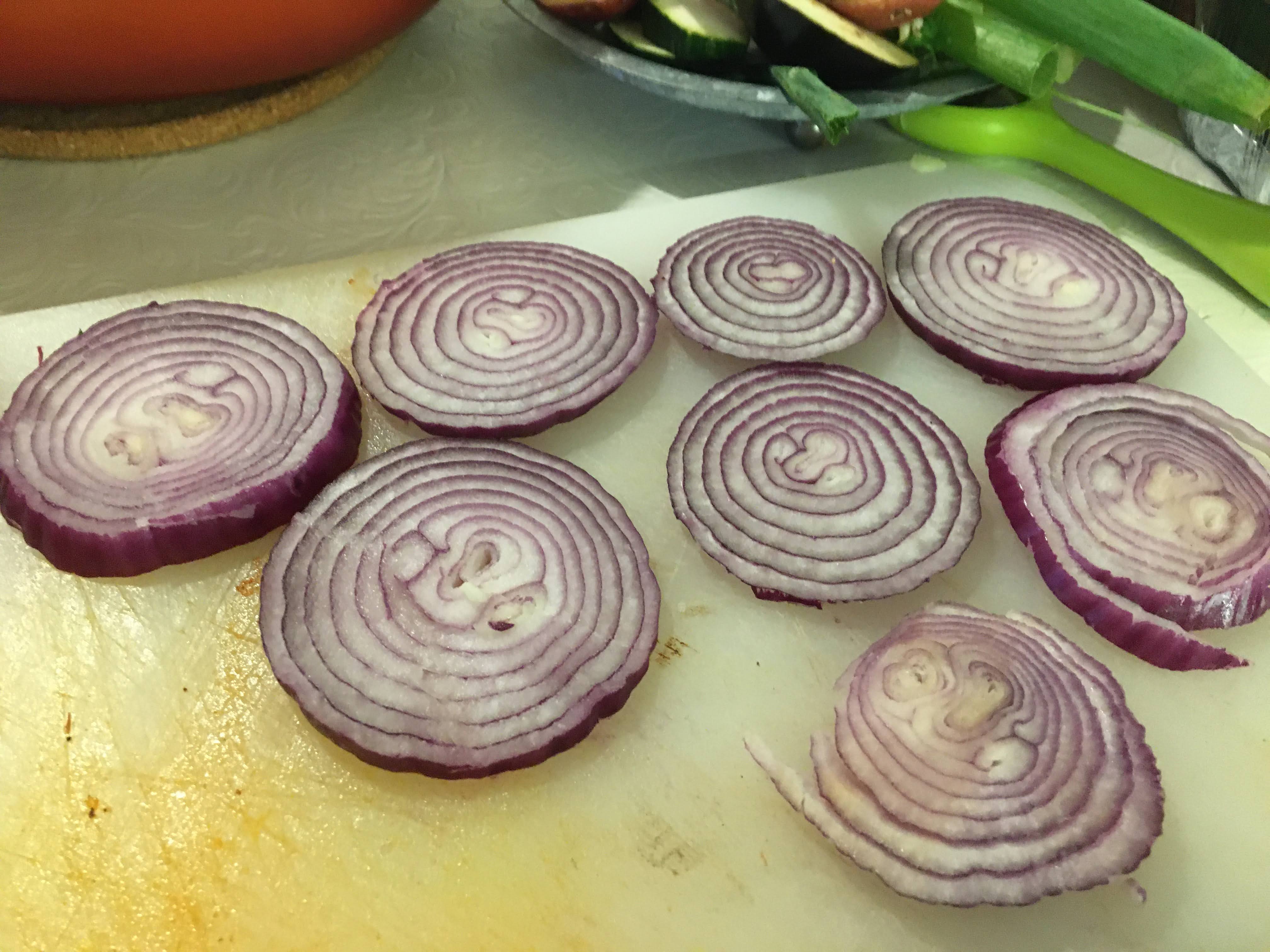 Slice the red onion, courgette, aubergine, potoatoes, big tomatoes into approximately ¹⁄₁₆-inch (1-mm) rounds, then set aside. Place the potatoes in a bowl cold water for a while to get the starch out. You can even precook the potatoeslices for about 10 minutes to shorten the bakingtime of the Ratatouille in oven later. Take out and put on a papertowel and pat dry before assembling the ratatouille. (I didn´t have tomatoes so I made without).