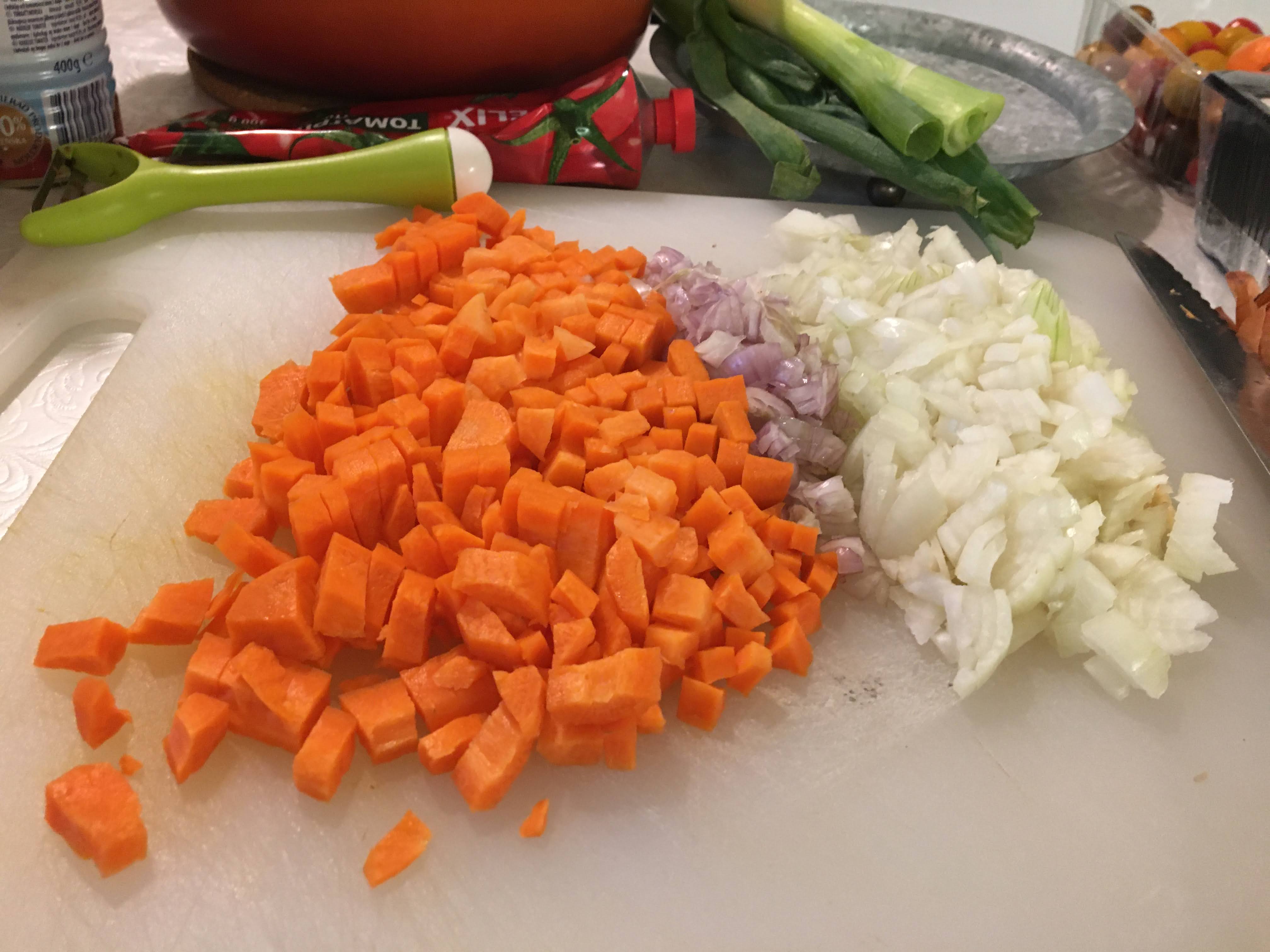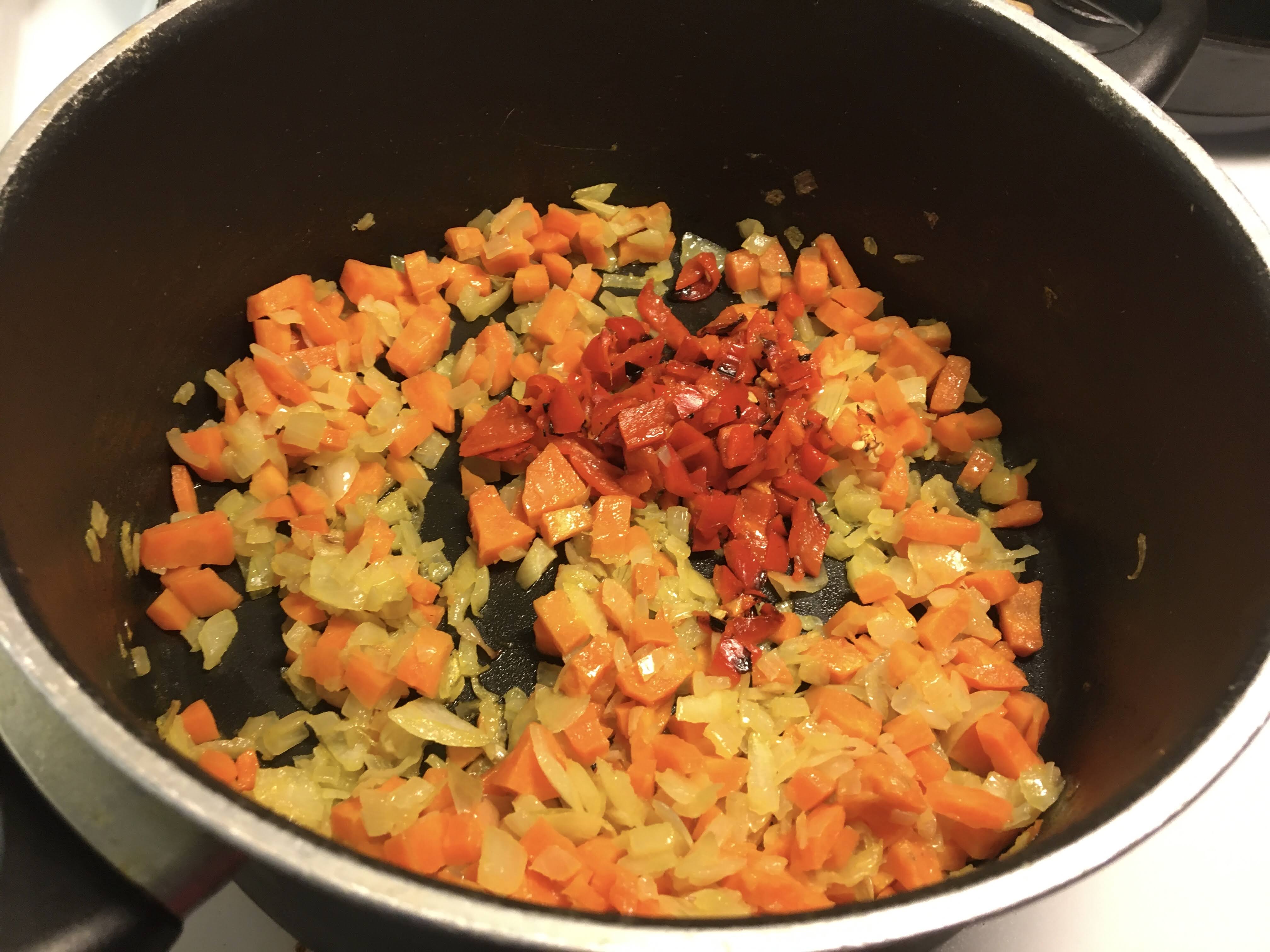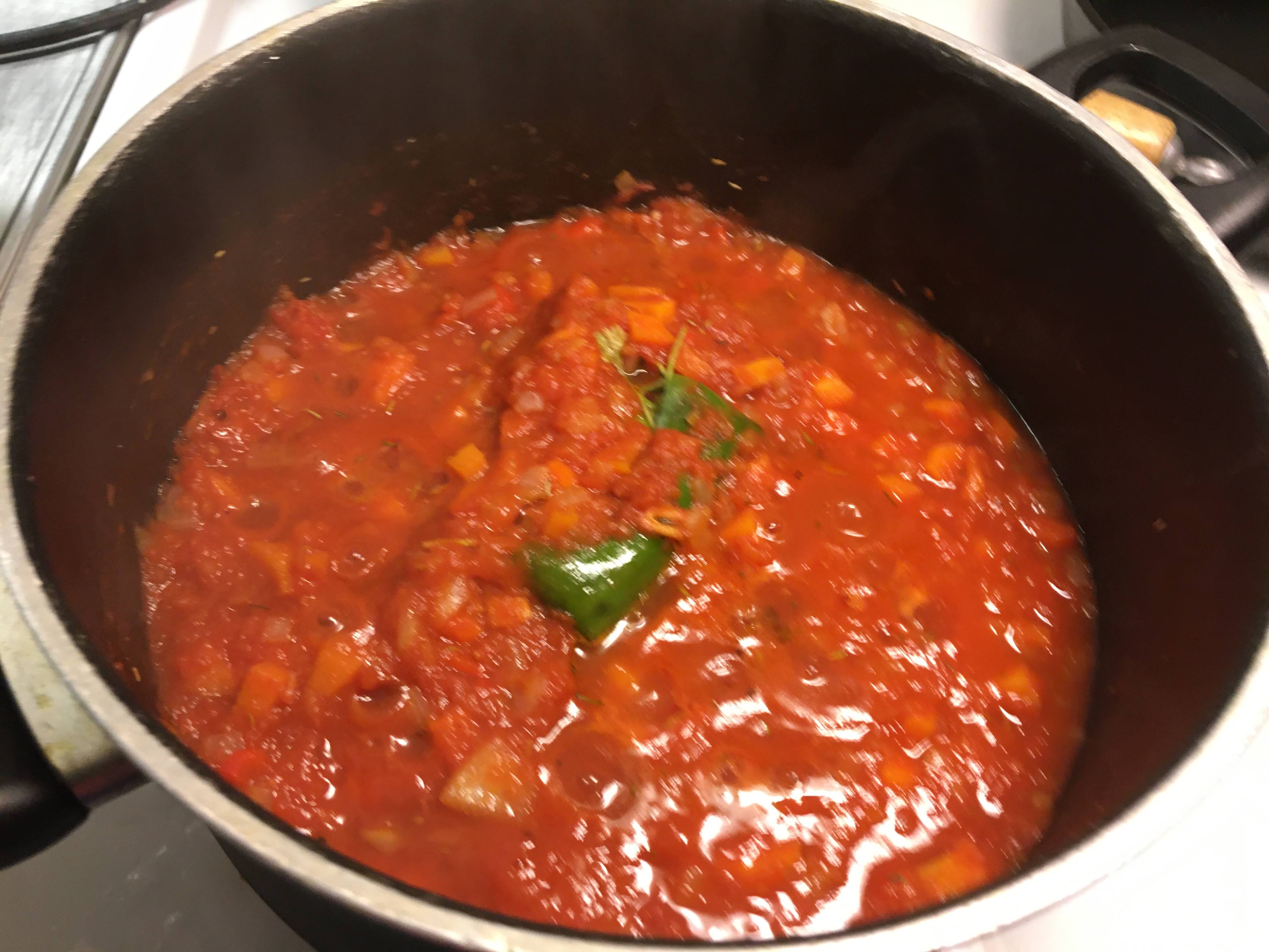 Make the sauce: Heat the olive oil in a 12-inch (30-cm) oven-safe pan over medium-high heat. Cut the yellow onion, carrot, bell peppers, garlic into small pieces. Sauté the garlic, carrot, onion and bell peppers until soft, about 10 minutes. Season with salt and pepper, than add the crushed tomatoes. Stir until the ingredients are fully incorporated. Let the sauce zimmer for about 20 minutes. Remove from heat, than add the basil. Stir once more, than mix in a mixer.