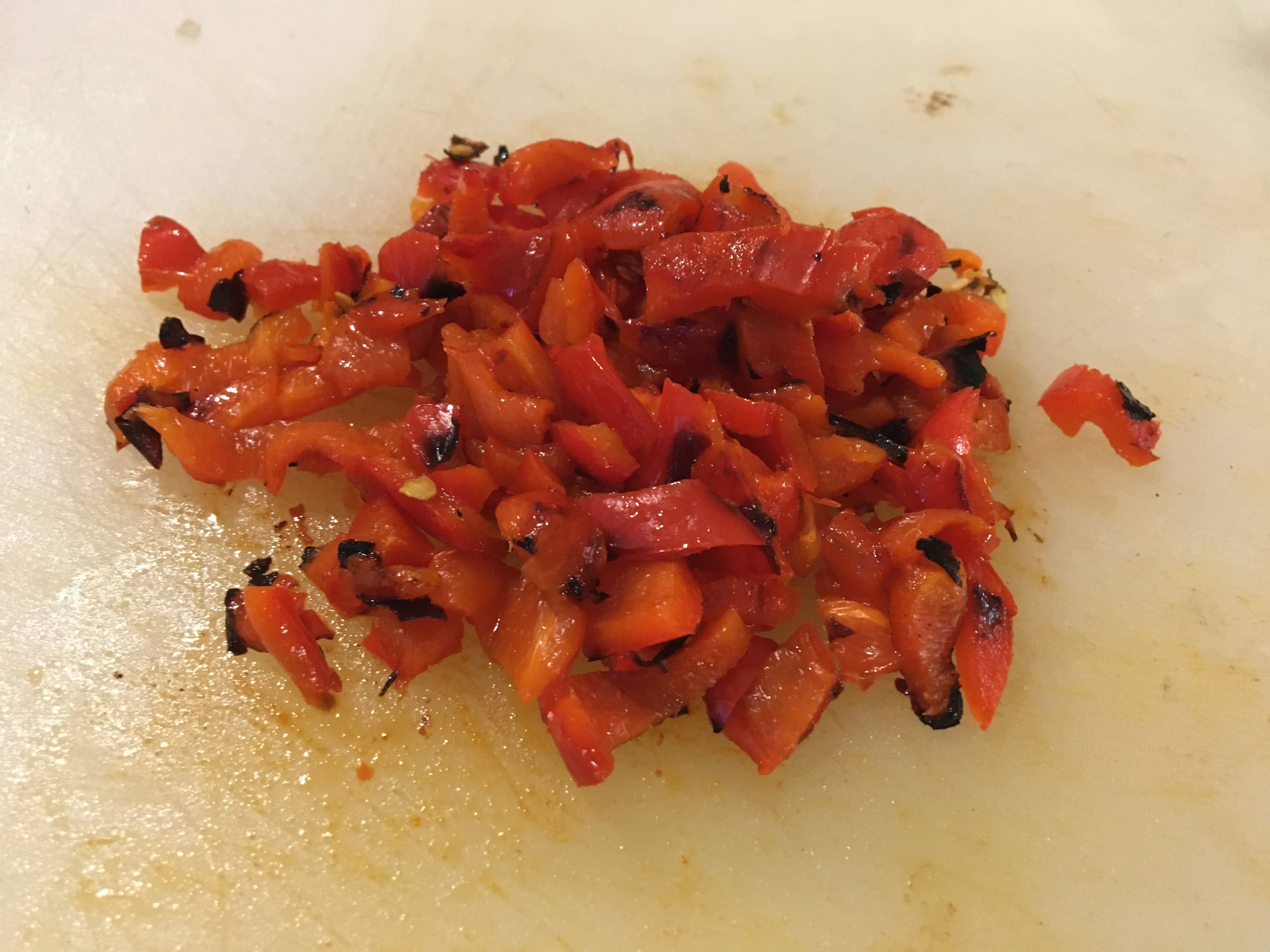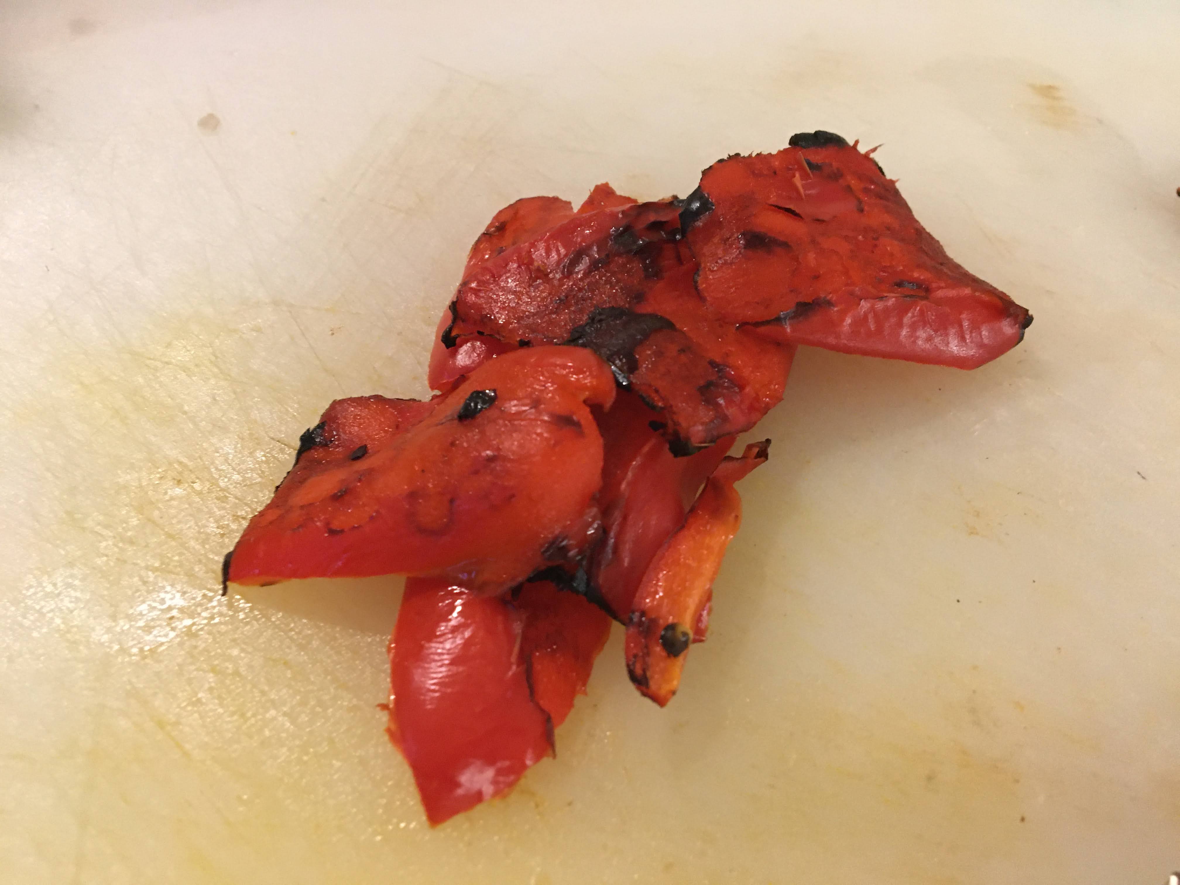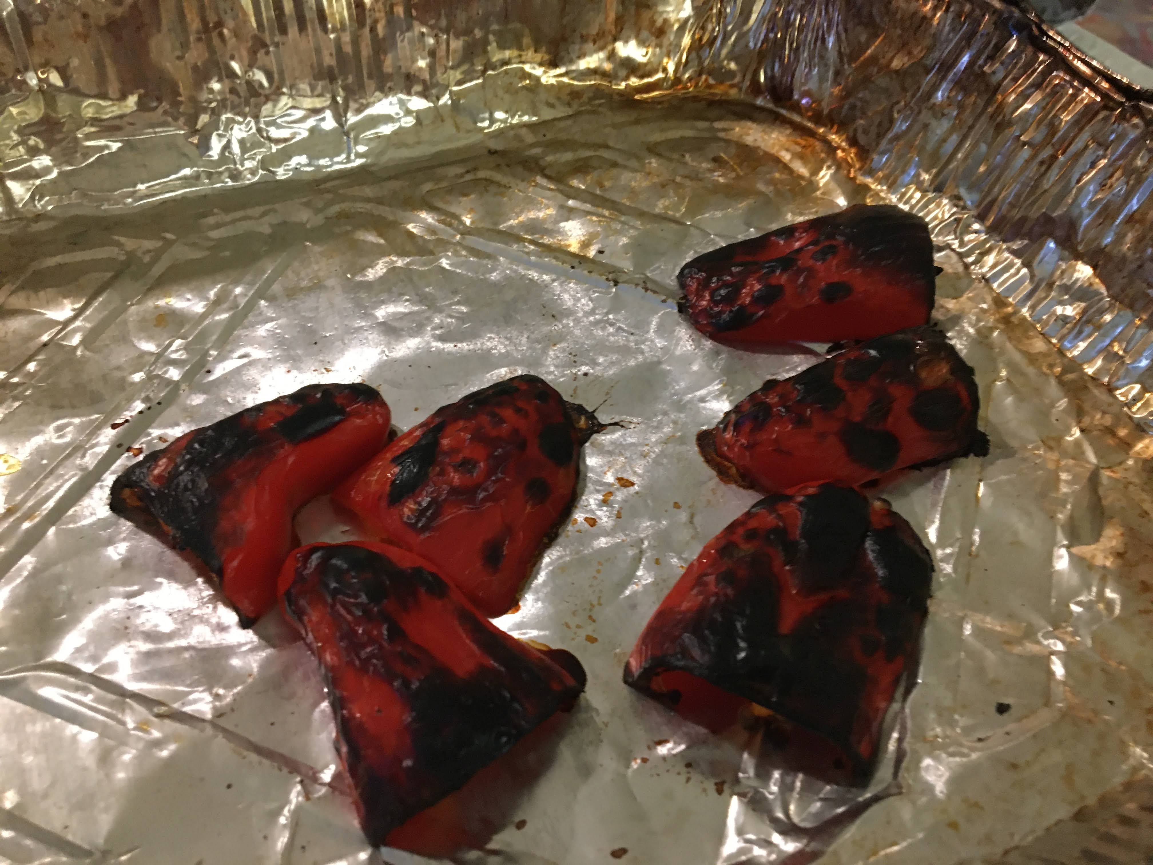 Rost the bell peppers in the oven on a baking sheet until they have some color. Take out and take the skin off.
