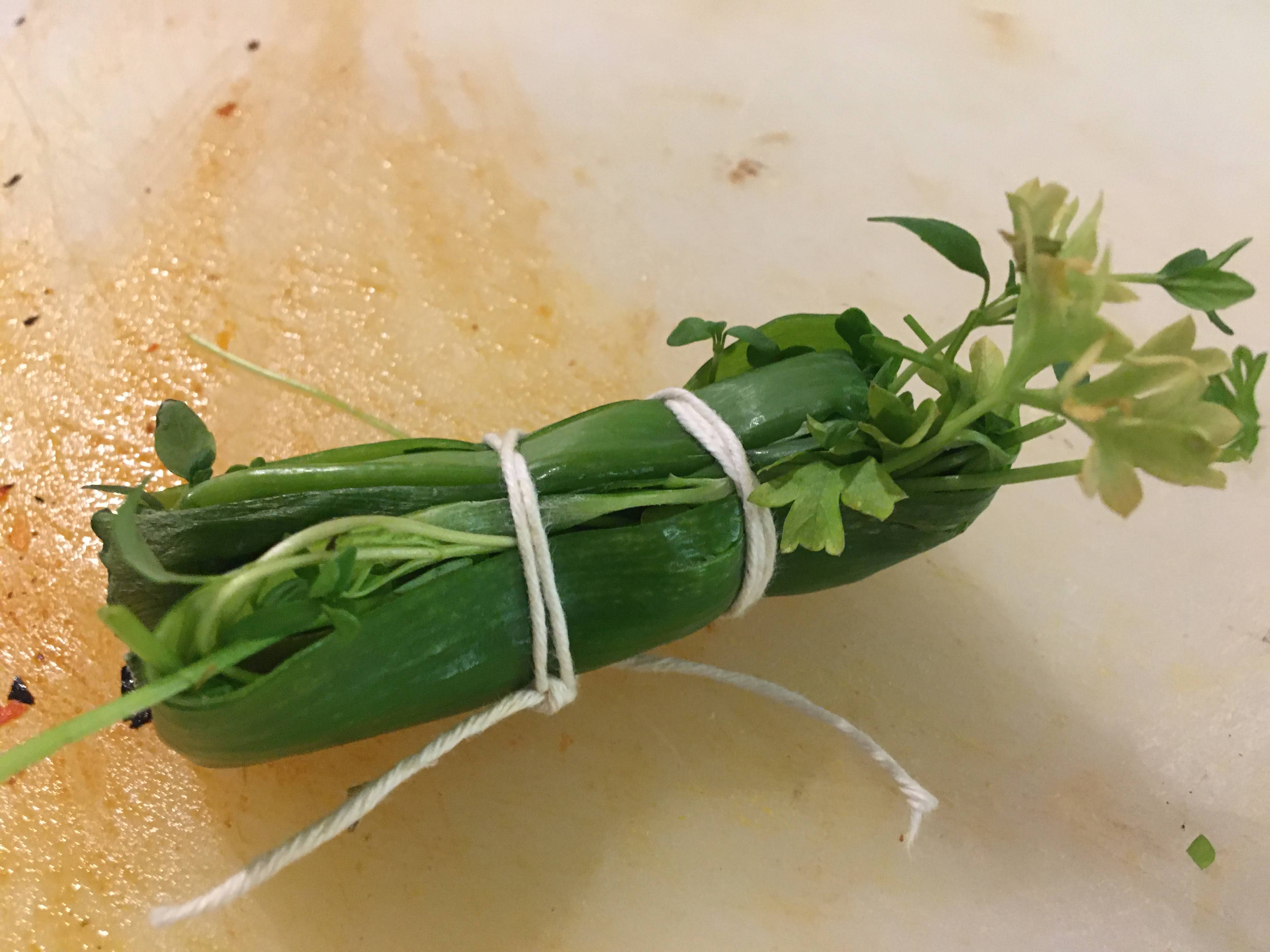 If you would like to use fresh herbs in your bouquet garni, an ideal combination is 4 or 5 sprigs of parsley, 1 or 2 sprigs of thyme, and 1 bay leaf. Gather the parsley and thyme sprigs, place the bay leaf on top, and use a piece of kitchen twine to bind it all together, keeping one piece of the string long enough so you can easily pull out the herb bundle.