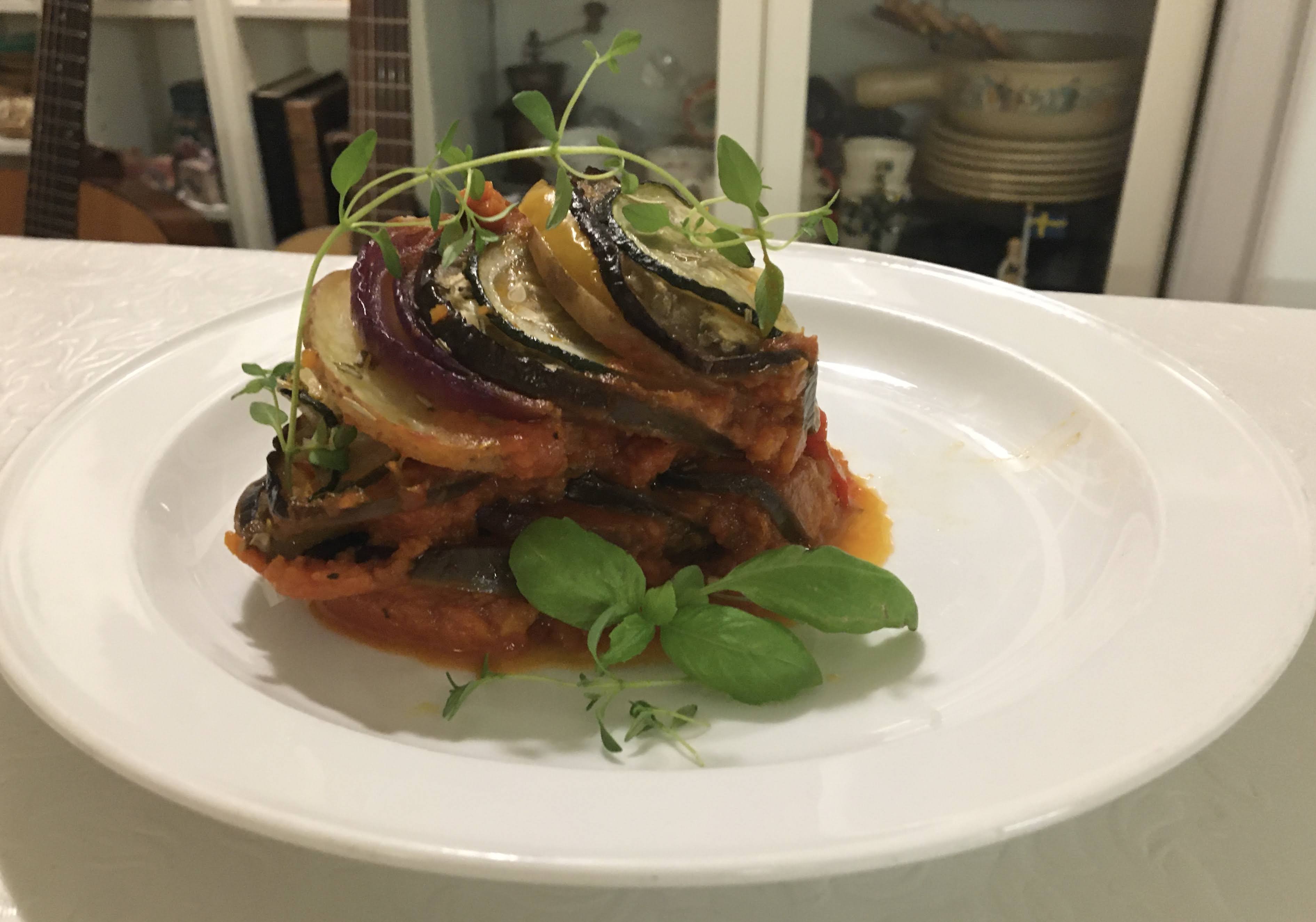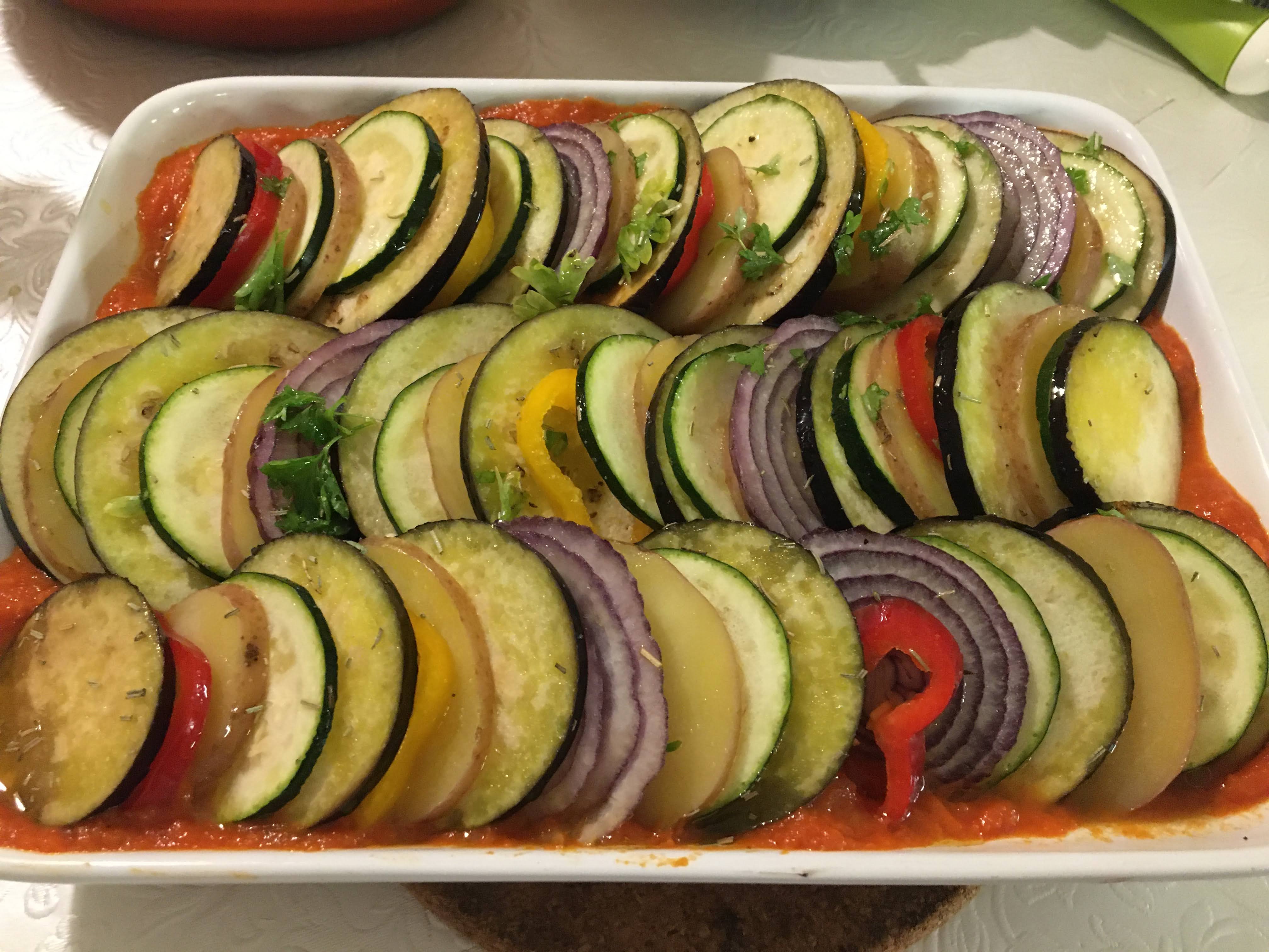 Arrange the sliced veggies in alternating patterns, (for example, aubergine, tomato, zucchini, red onion, potatoe) on top of the sauce from the outer edge to the middle of the pan. Season with salt and pepper.