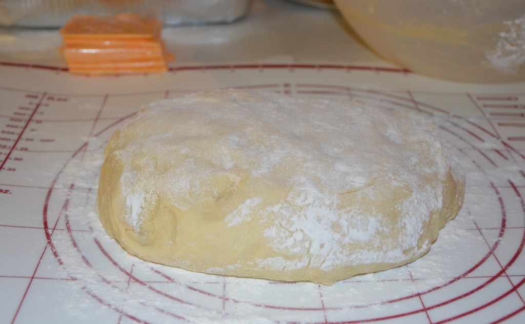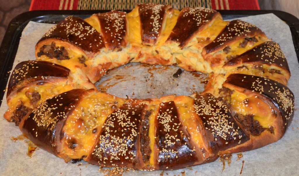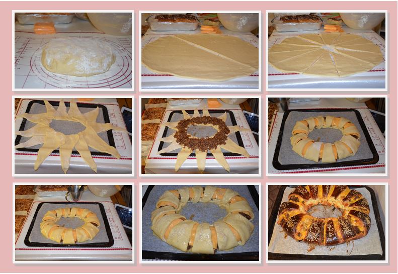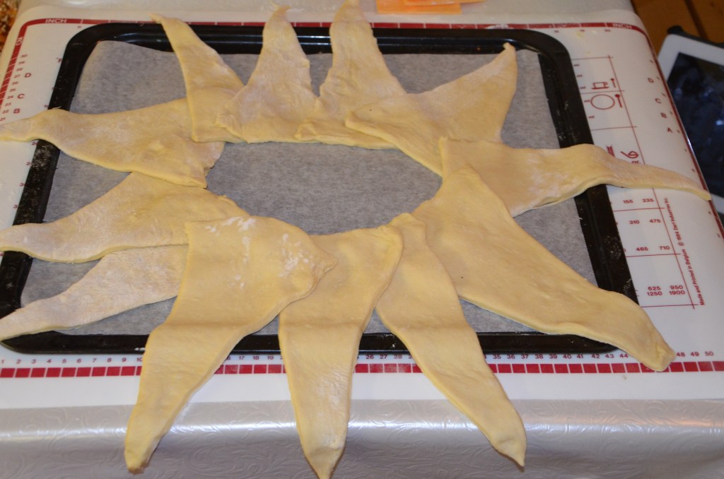 Punch down dough and kneed to a round ball. Roll out the dough with a roller to a round circle. Cut into 10 to 15 wedges. Place the wedges making a round circle with the wide part facing inside making a ring as a sun with beems (but with a hole in the middle.)
