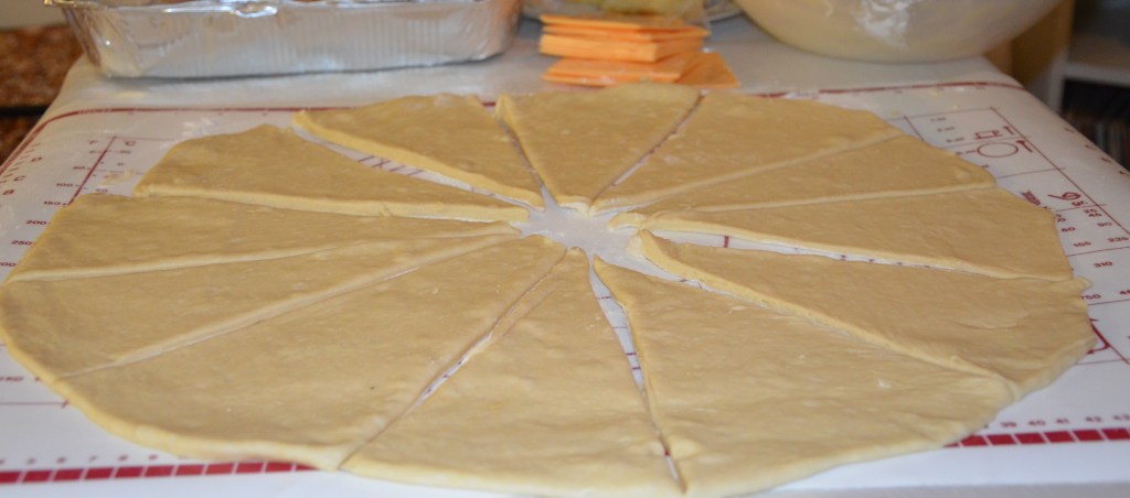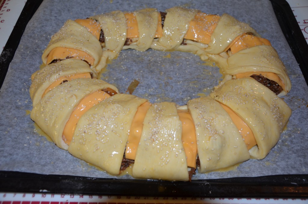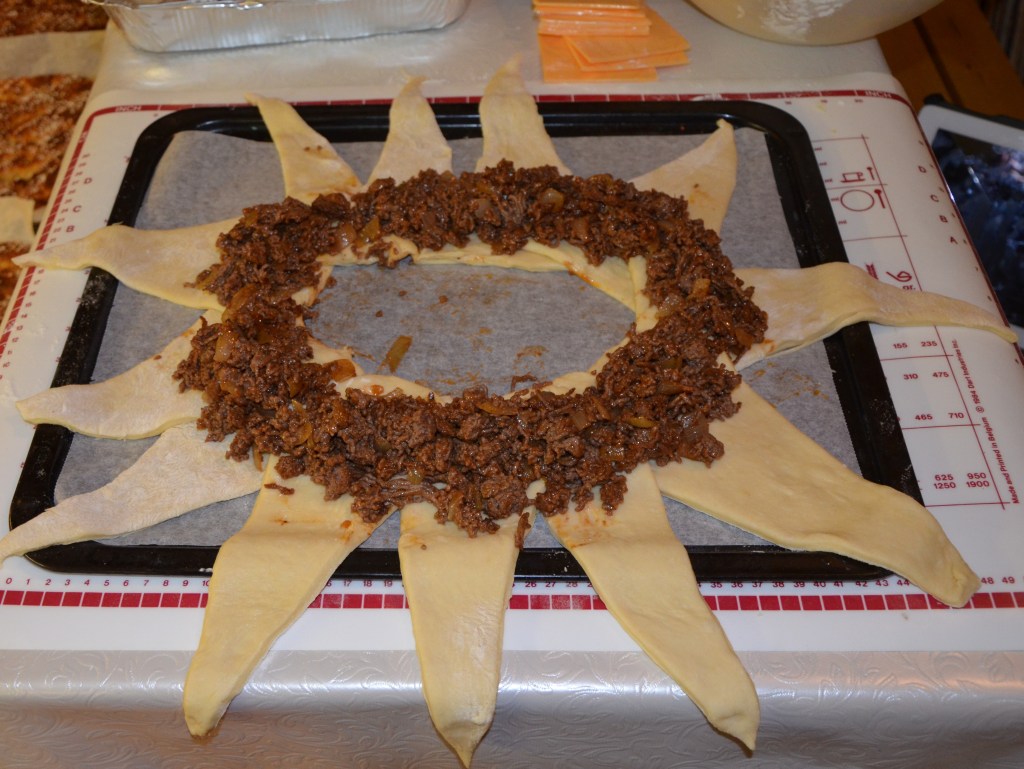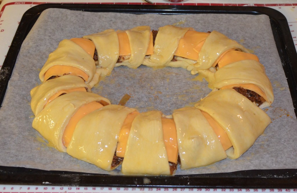 Roll up the wedges starting with the narrow end and place them over the filling towards the middle of the ring.