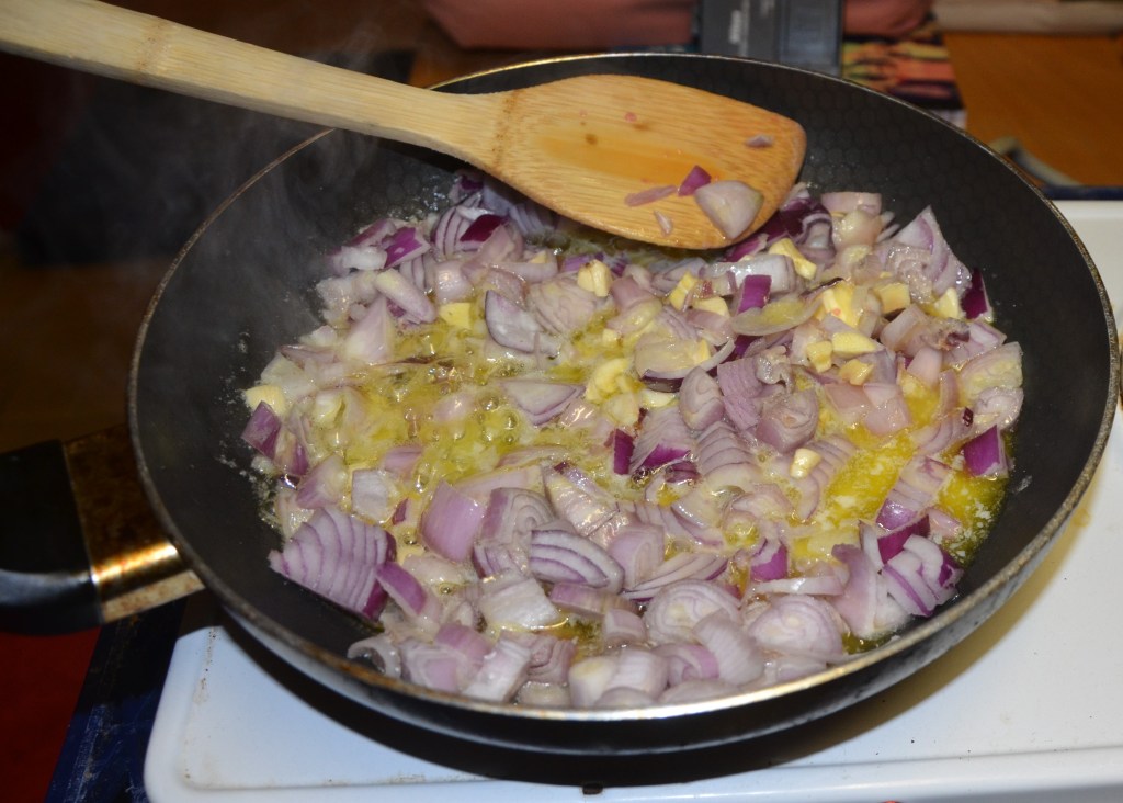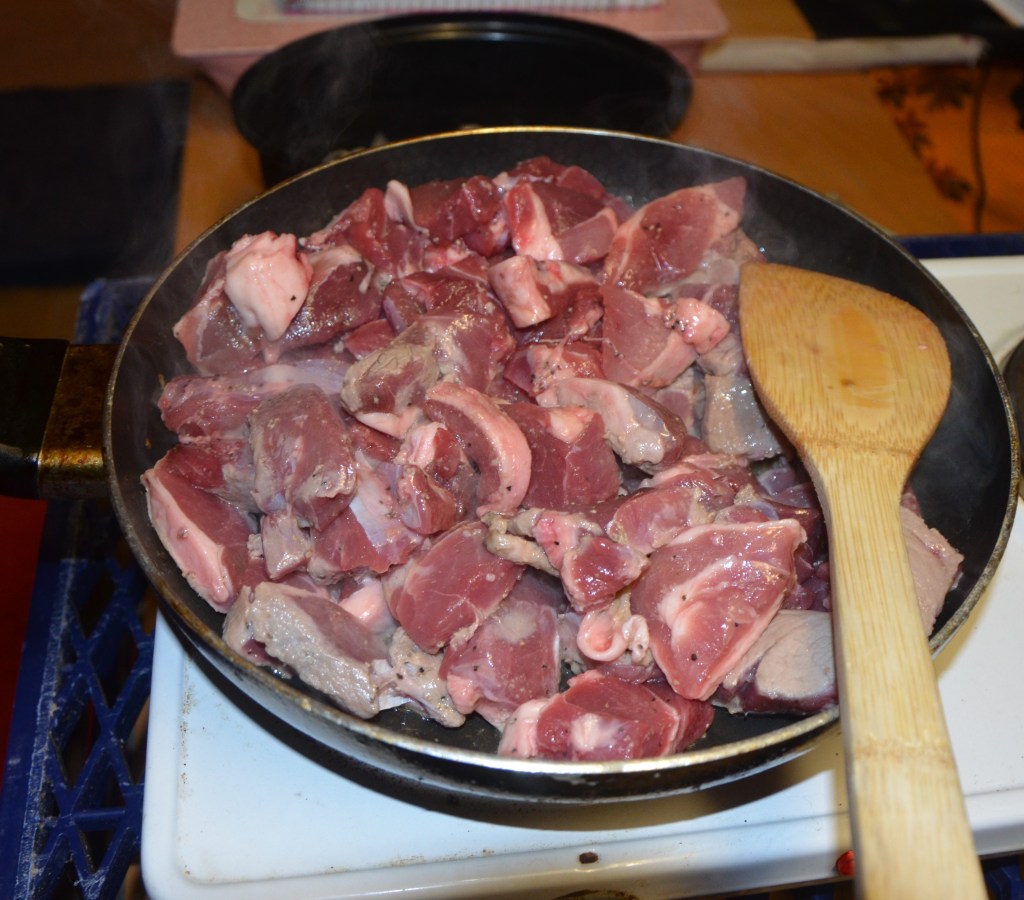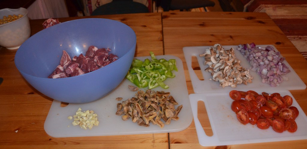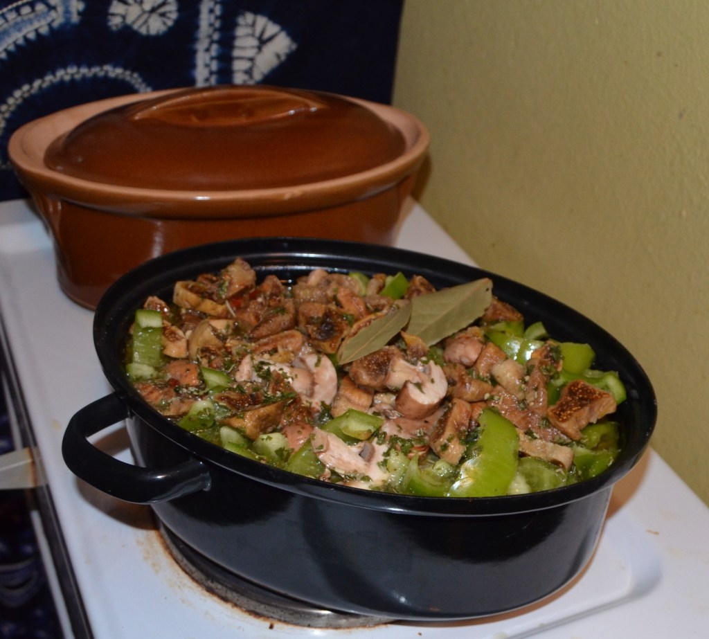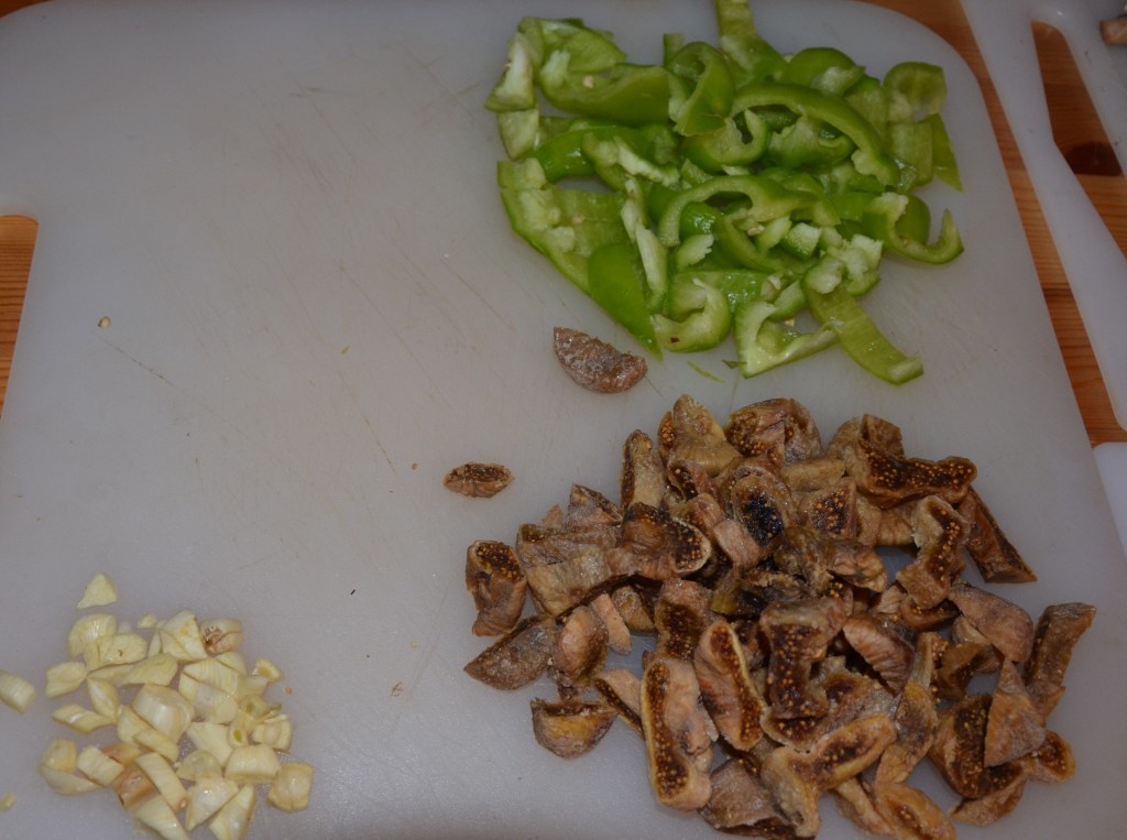 Cut the lamb meat into pieces. Fry the meat in 100 g butter and add salt and pepper and set aside. Cut the paprika, mushrooms and onions into pieces. Fry the onions and garlic in 100 gr butter and set aside. Mix the onions, figs, paprika, mushrooms and lamb meat in an ovenproof dish with a lid.
