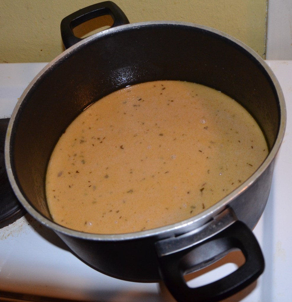 When the broth is cold take off the fat that is on the top. Heat the broth and mix in the cornstarch until it thickens a bit for a nice sauce. Use more starch if you feel the sauce is too thin for your liking. Taste off to your own taste with adding more salt or pepper or spices and add the cream.