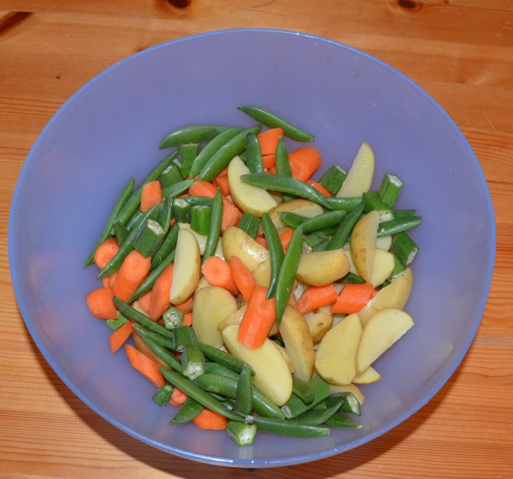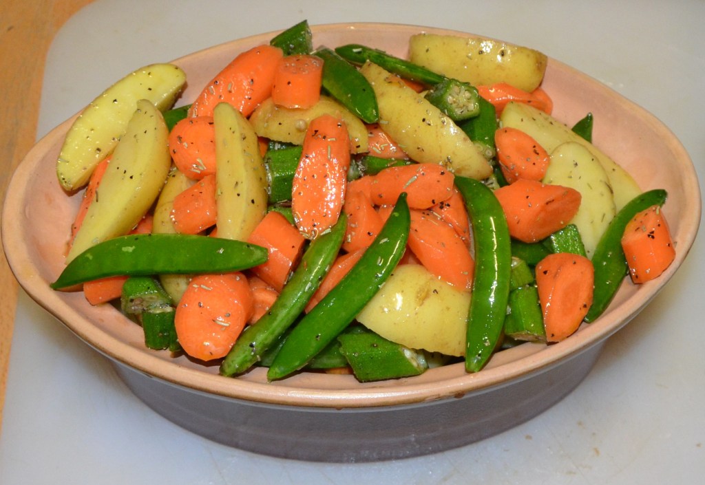 Cut the potatoes, carrots and the okra in slices. Leave the sugar snaps whole. Mix all in a bowl. Sprinkle with olive oil, salt, pepper and rosemary and mix well. Pour the mix in the prepared clay pot and put the lid on and place in the oven.