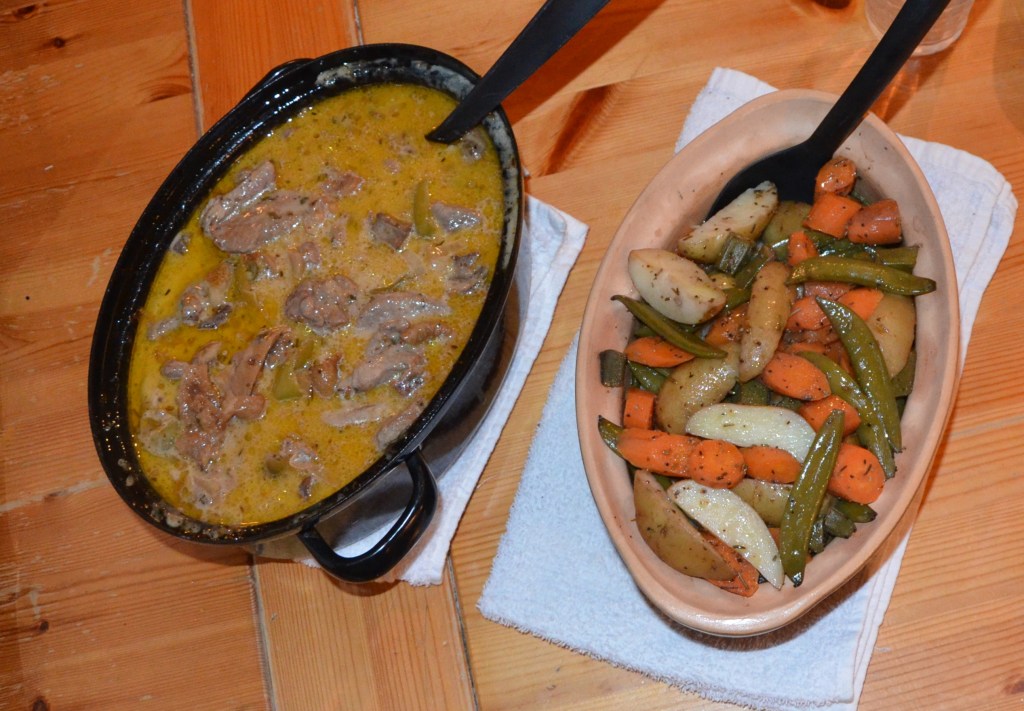 Add the spices and remaining ingredients, all except the cornstarch and the cream. Put the lid on. Place in the preheated oven and cook for 1 ½ hours. Oven temperature 150 Celsius degrees.