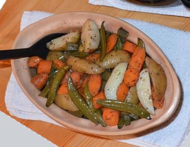 To prepare the Clay Pot before baking: Pour water in the clay pot and let it sit for 30 minutes. Remove the water and pour in the vegetables and potatoes mix and place in the oven to bake.