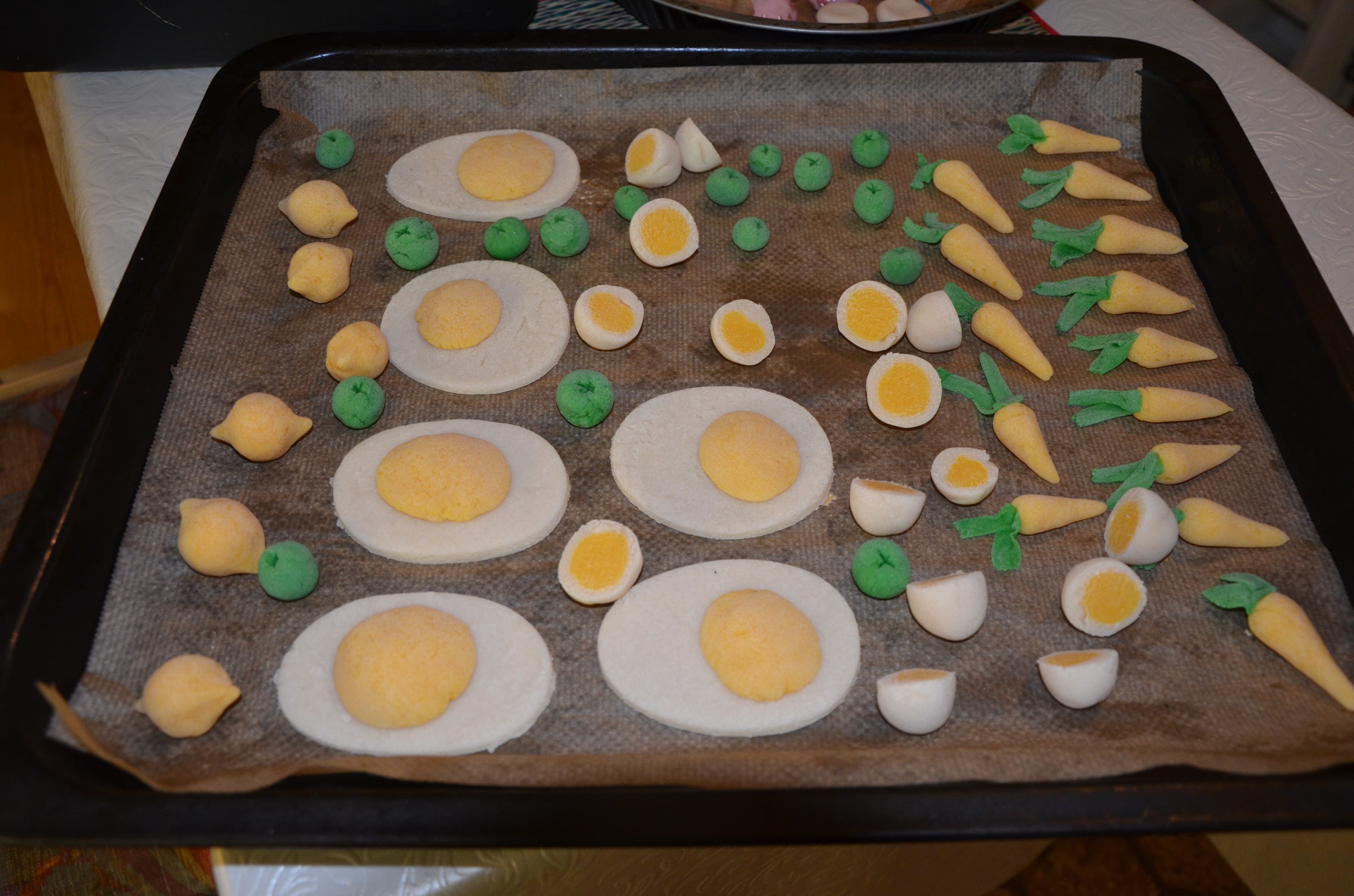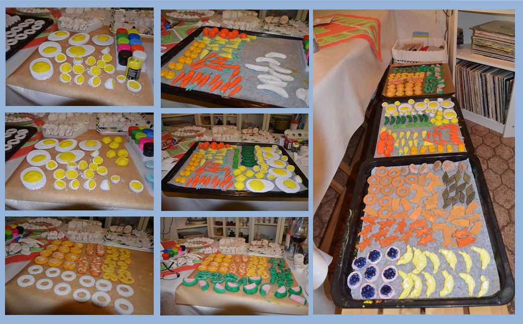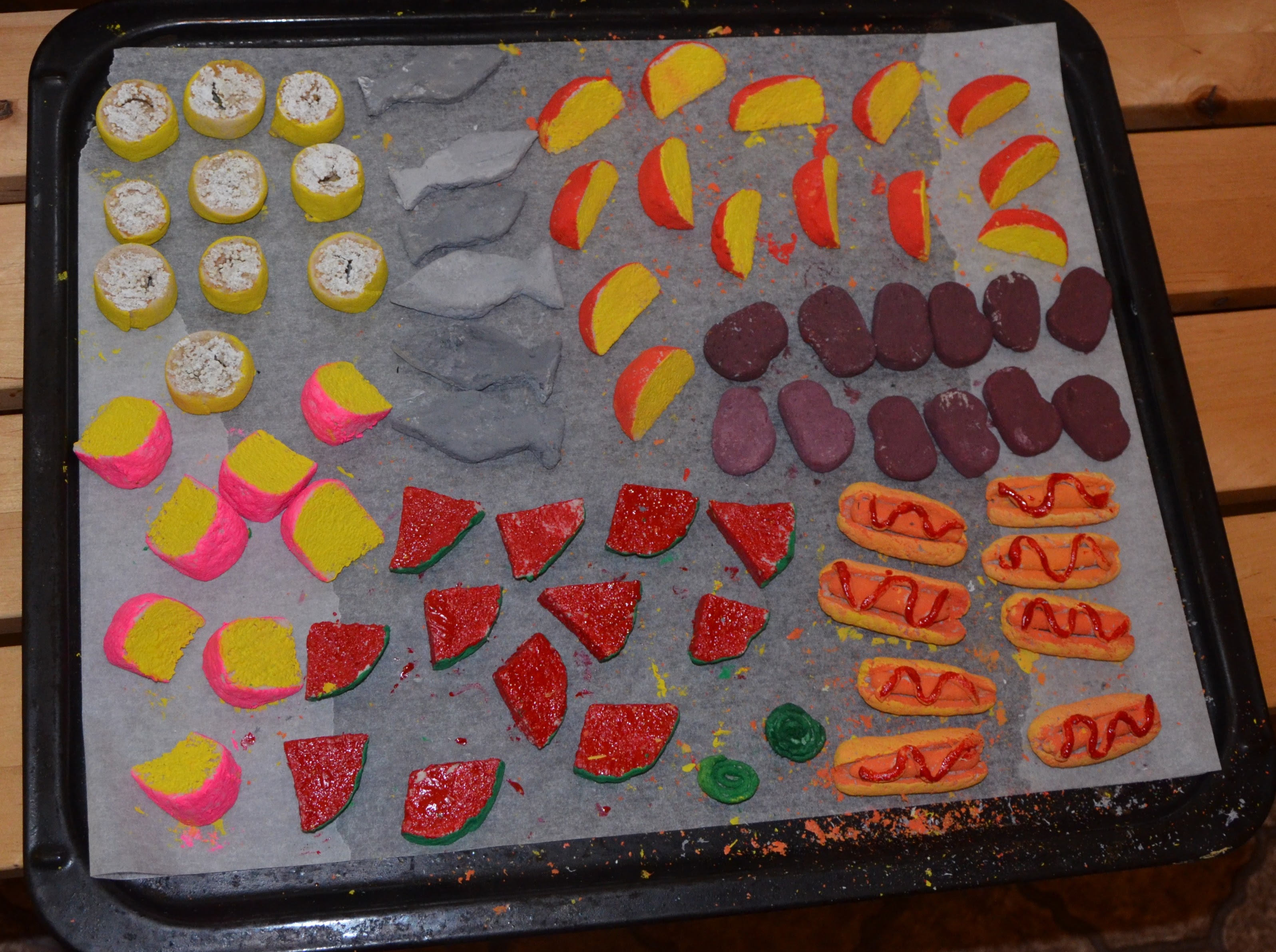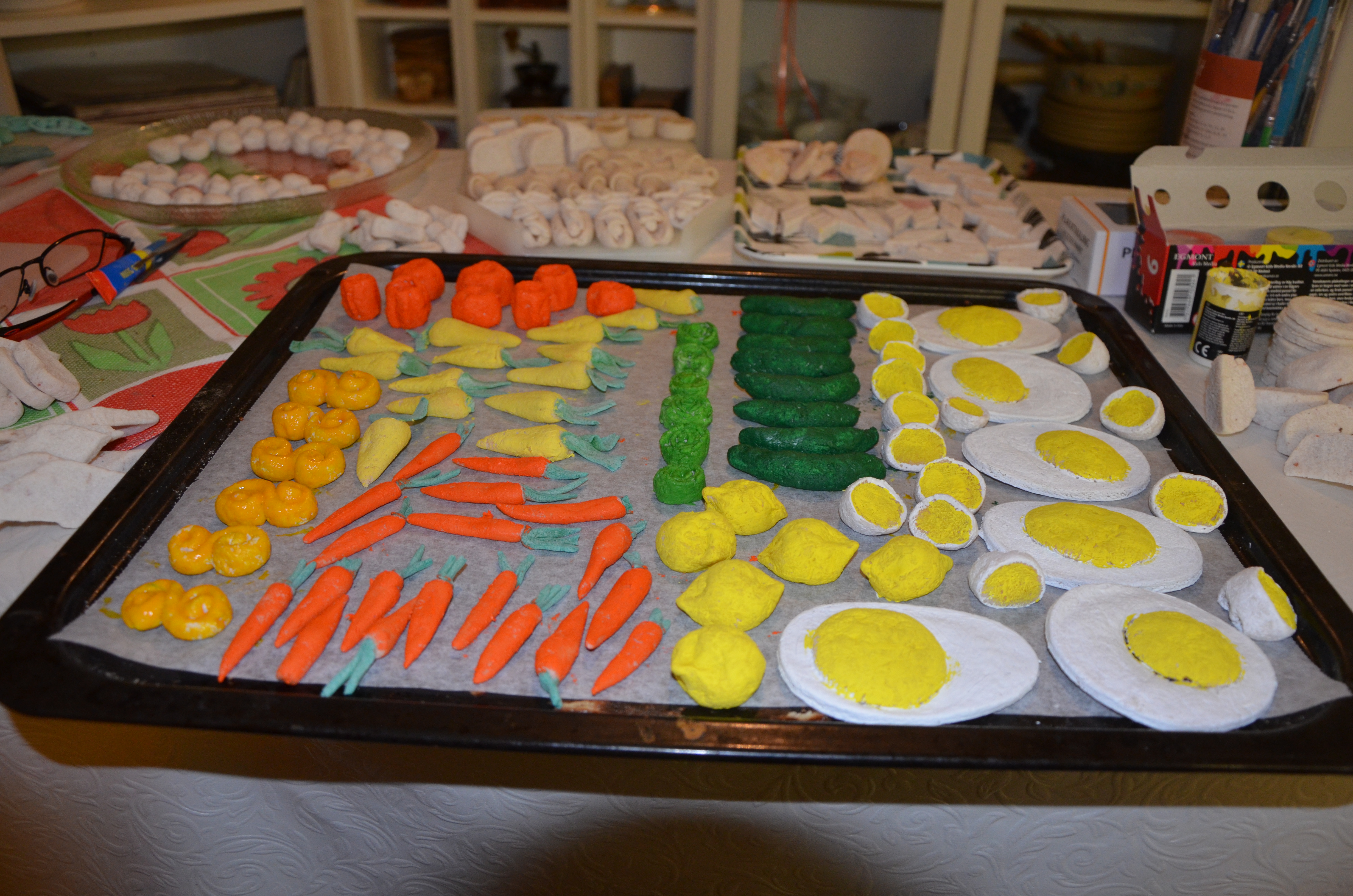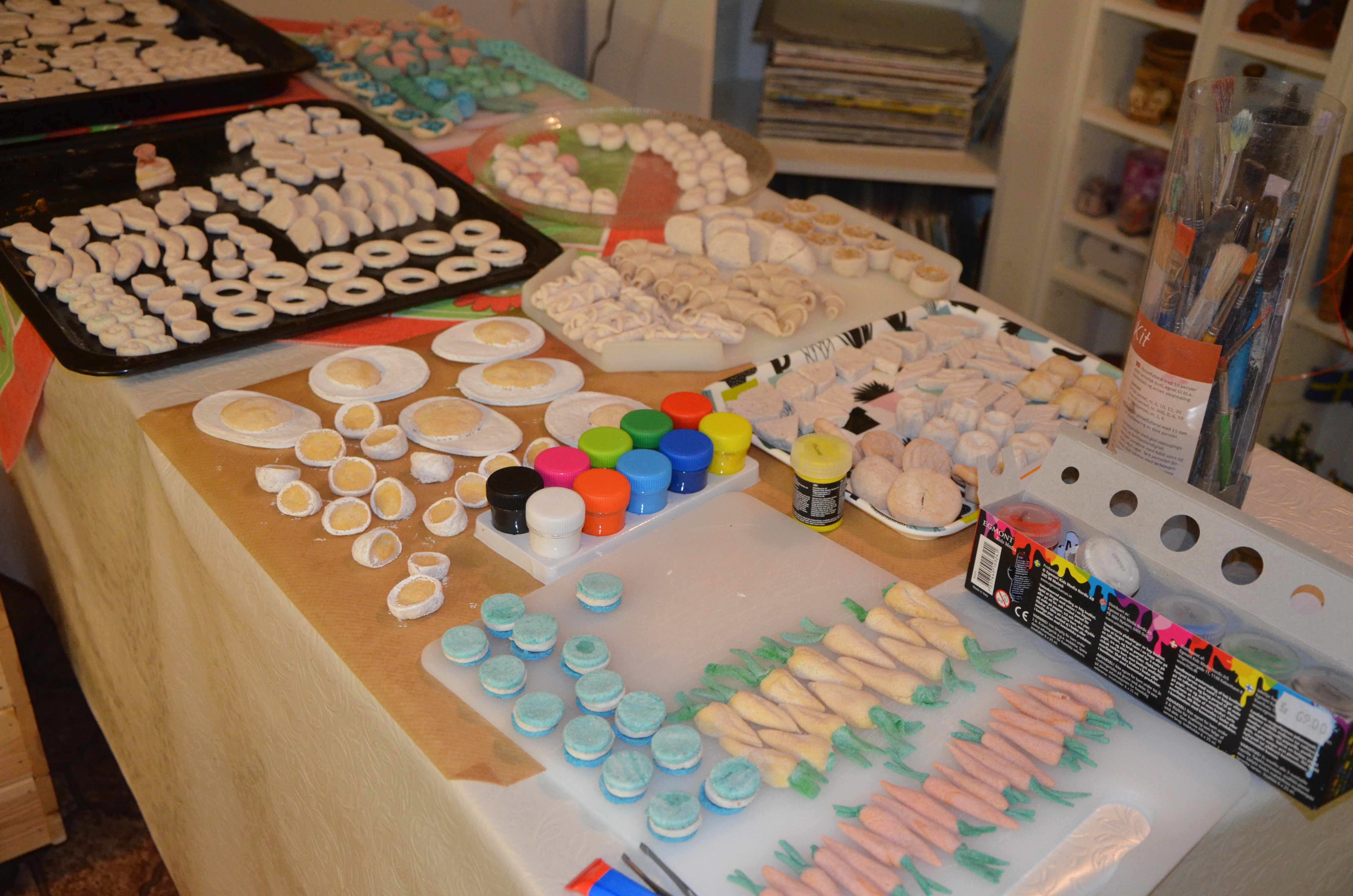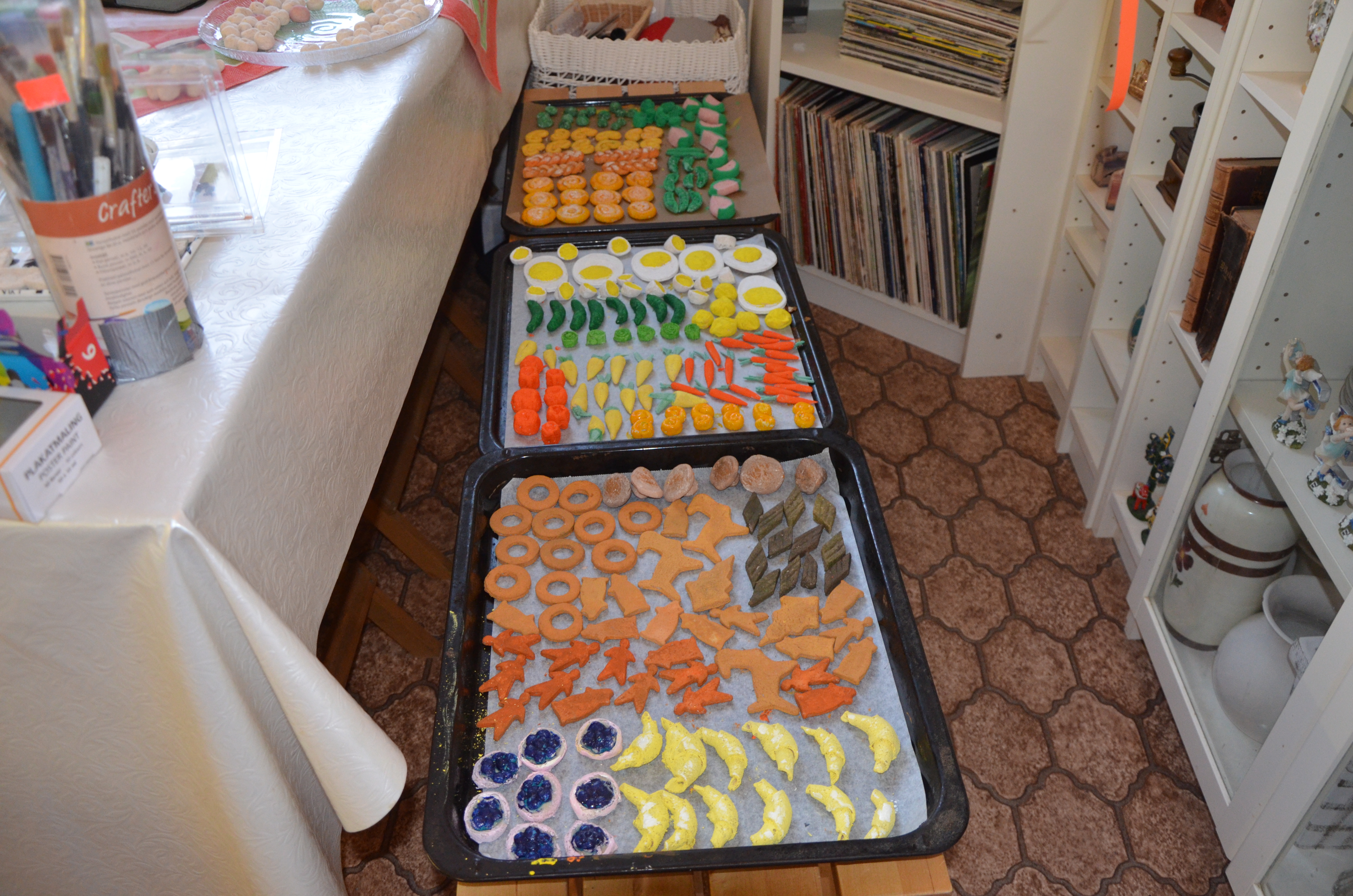 If you want to dry the figures you can put them in the oven and bake them on 100 degrees Celsius for at least 2-3 hours. The figures are then dry. Keep them spread out to dry more in room temperature for at least one day. For my play food I have been drying them in room temperature for weeks since they are all different thickness and I wanted to make sure they are really dry all the way through.