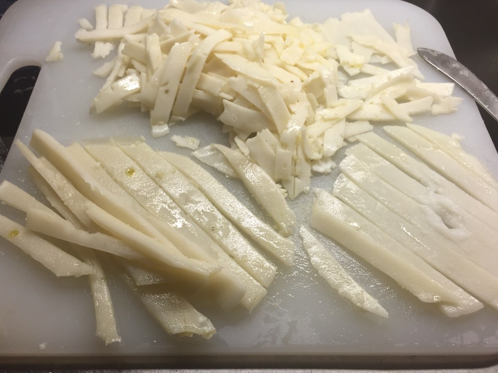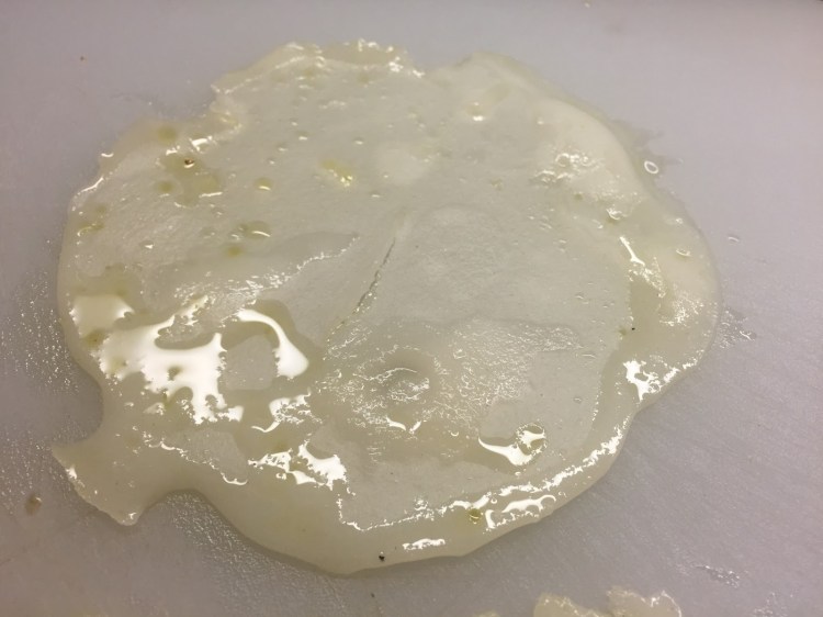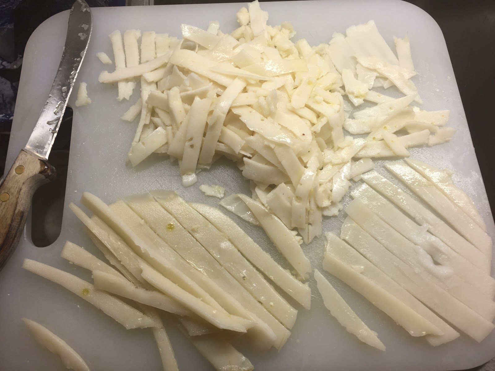 While it’s cooking, attend to the first pan. We’re going to lift the noodle sheet out and place it onto a cutting board. Brush the cutting board with a thin layer of oil to prevent sticking. Then, use a rubber spatula to loosen all sides of the sheet of noodle, and slowly lift it up and off the pan/plate. Lay it flat on your cutting board.