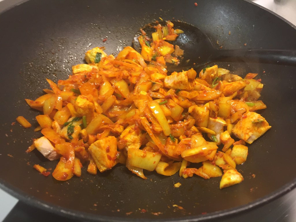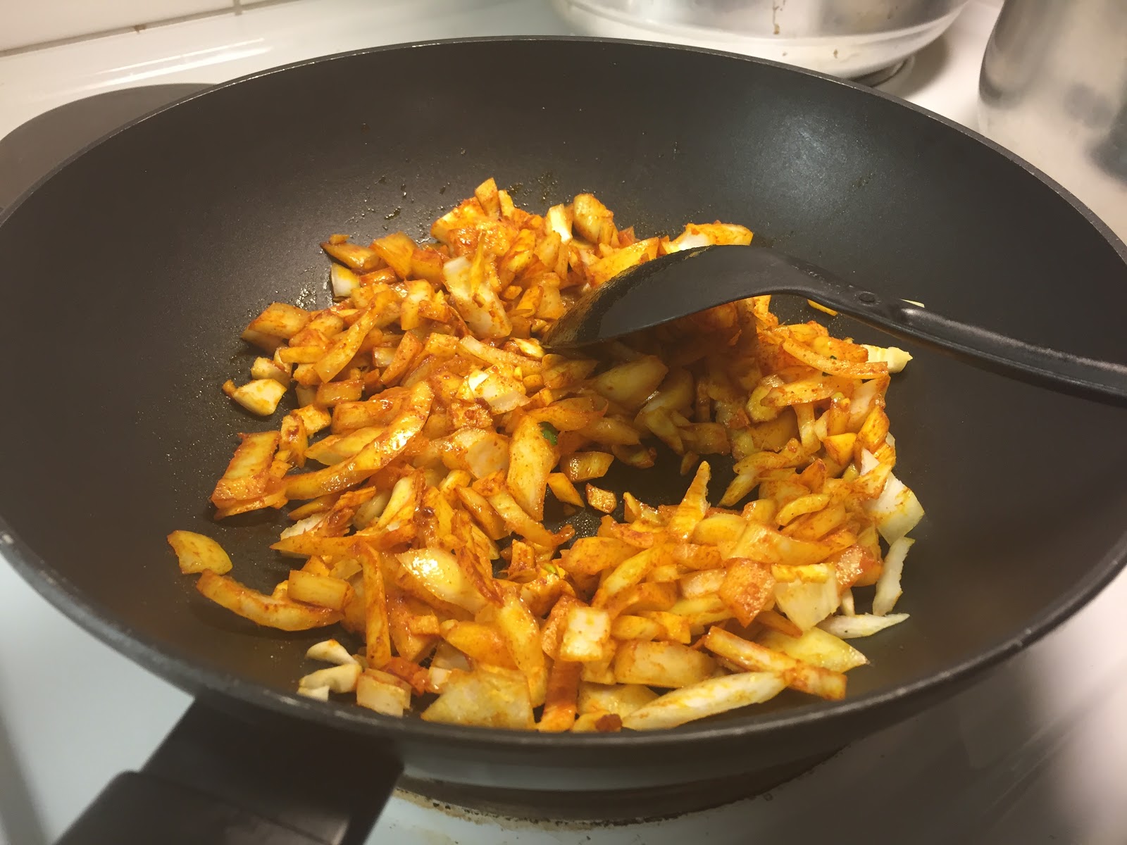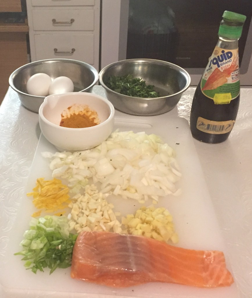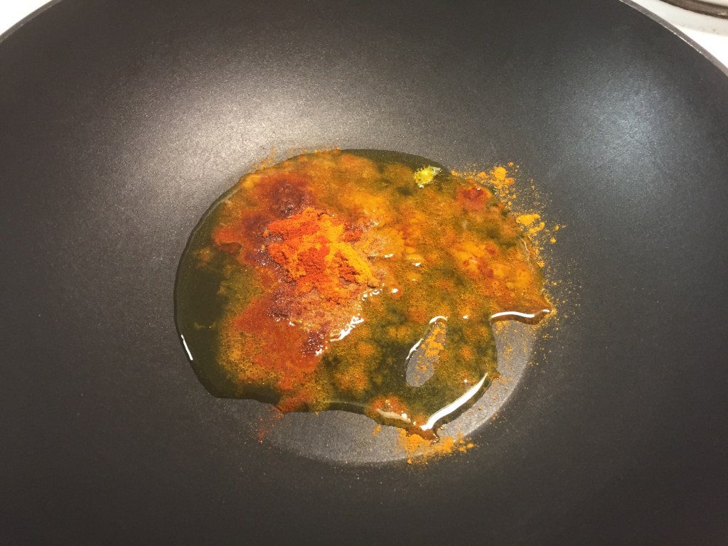 Now prepare the spices. Add a little oil in a wok or frying pan. Add all the spices and fry a little to release the fragrance and taste. Add the lemongrass, garlic, ginger, corianderstems and onions which are chopped finely. Fry for 3-4 minutes till fragrant.