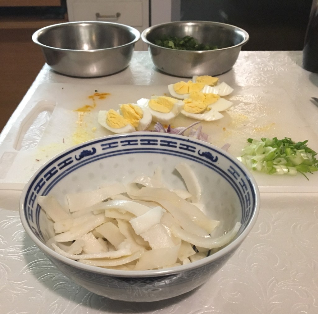 Garnish each dish with sliced red onion, wedges of boiled eggs and coriander leaves and serve with lime wedges, fish sauce and chili and garlic oil on the side.