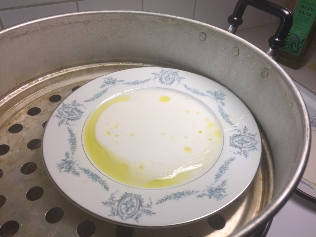 While the mixture is resting, fill your steamer (make sure that your flat-bottomed pan fits comfortably inside first!) with water. If you don’t have a steamer, use a large, deep cooking vessel with a wide opening and a lid. Bring the water to a boil. (You might need to add more water throughout the cooking process. The goal is to have the pan float on top of the boiling water.)Brush a light coating of oil on the bottom of the flat-bottom pan, put the pan on top of the boiling water, and add a 1/4 cup of the rice liquid to the pan. Tilt it a little so the rice liquid covers the bottom of the pan. I did use a plate instead of a pan.