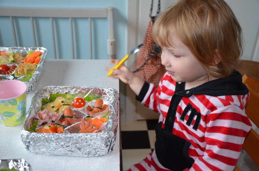 To make the mushroom cut a baby tomatoe in half. Use boiled egg to make the foot of the mushroom. To make the white spots on the mushroom cut out small rounds with a straw from eggwhite or cheese.