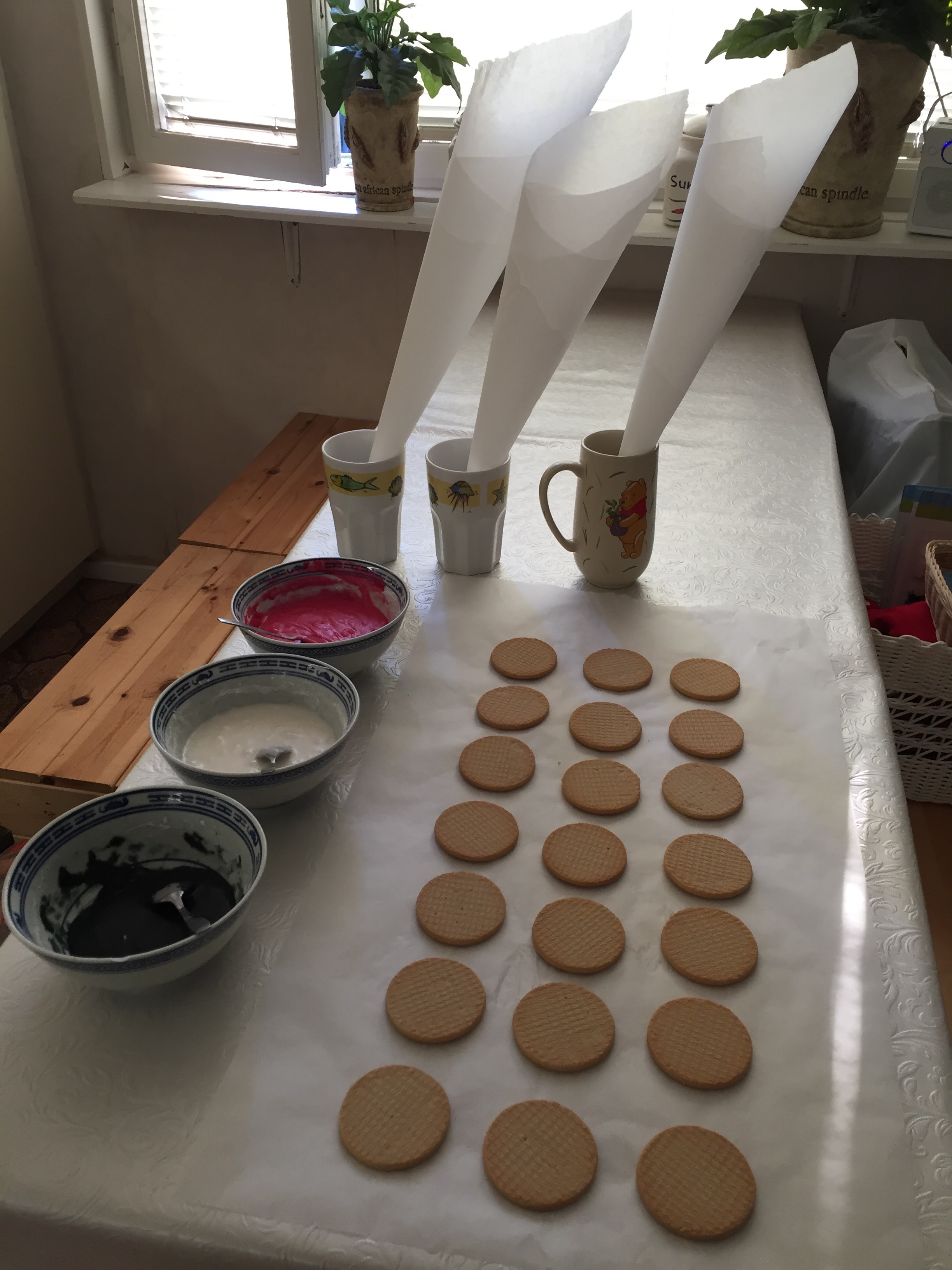 3 cups sifted confectioner´s sugar, or more to thicken icingLittle juice of a lemonRed, and black food coloringWater or eggwhite for mixing into the confectioner´s sugar for icing to get wanted thickness