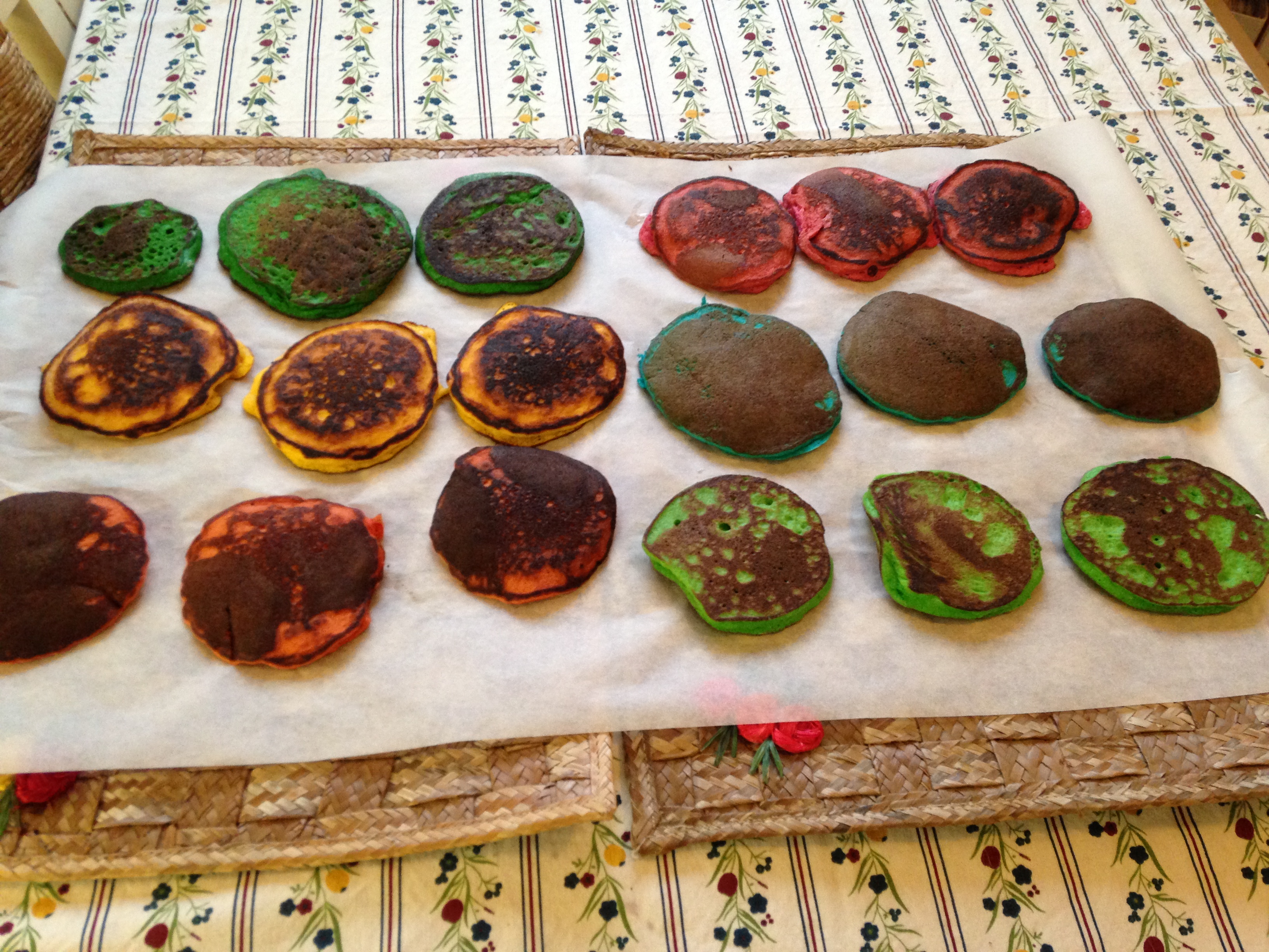 Mix the eggs, flour, milk, salt and baking powder. Divide the batch into different cups and add the food colors you want to each cup and stir. Fry the pancakes in a frying pan and cool off.