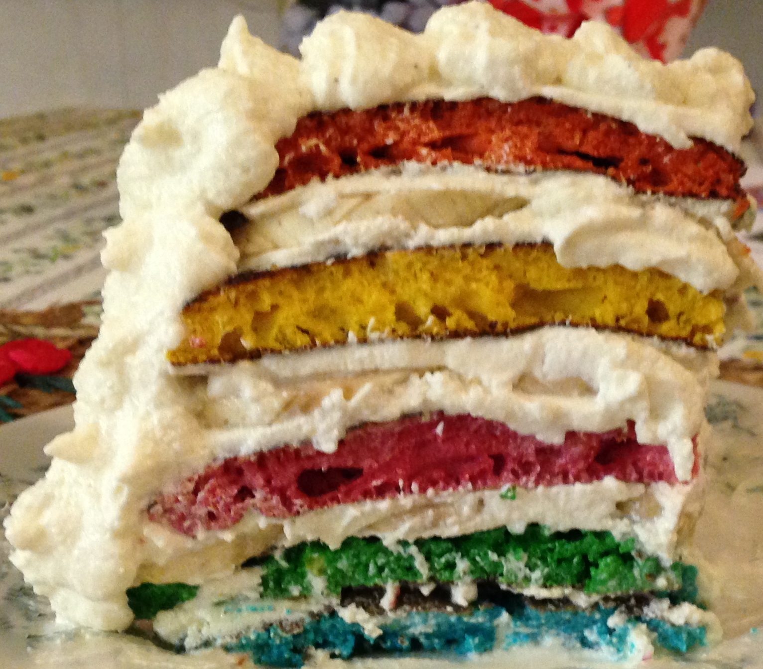 When cooled off cut the pancakes in halves. Place them on top of each other with a layer of frosting and banana slices in between. Place the pancakes with the cut edge out, to show the colors of the layers. If you want to avoid sweets totally, use natural yoghurt or quark between the layers instead of frosting. Since I wanted to make it cake-like I mixed frosting with vanilla tasting quark. Another alternative could be to use cottage cheese between each layer and on top. Decorate with the frosting around the backside.