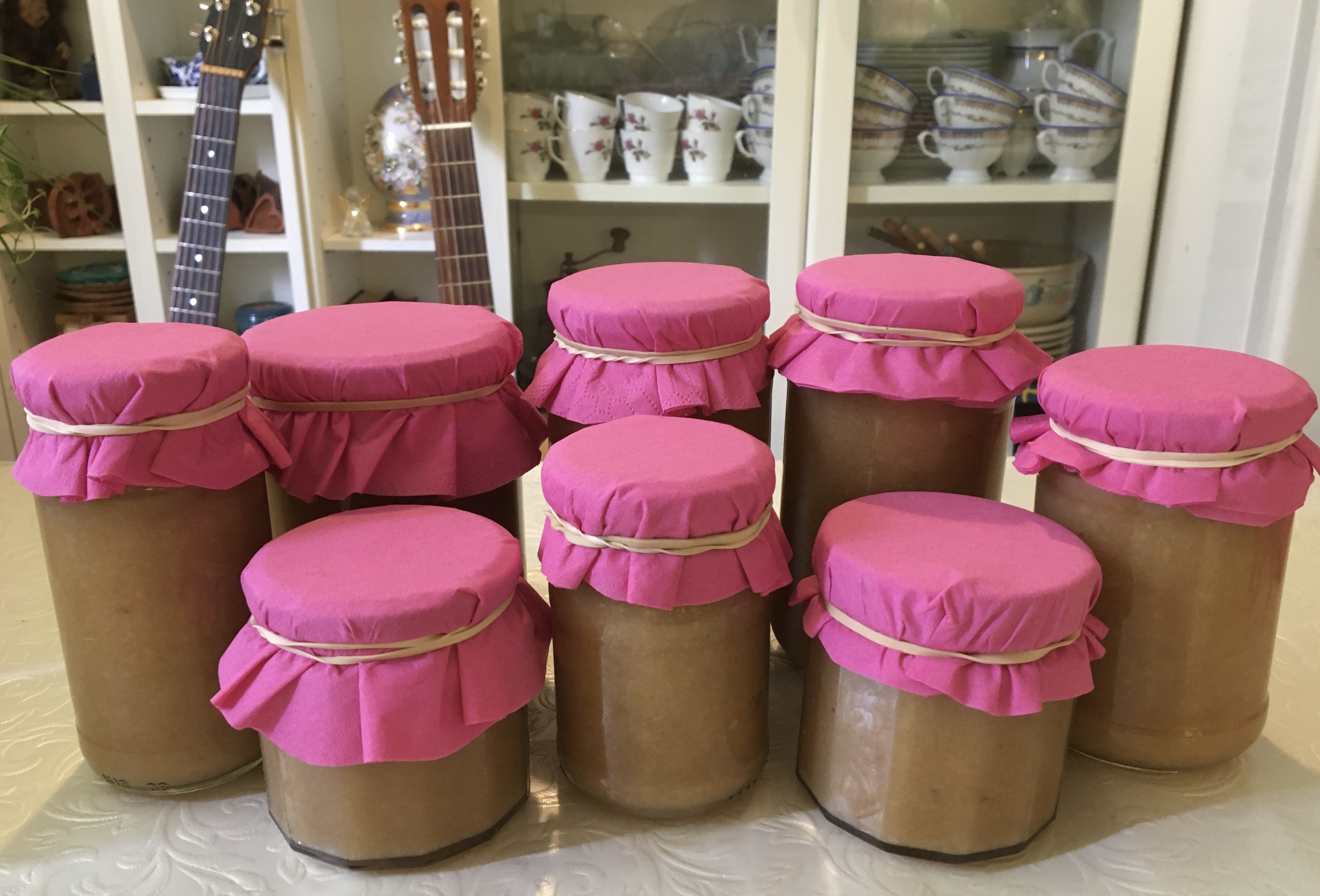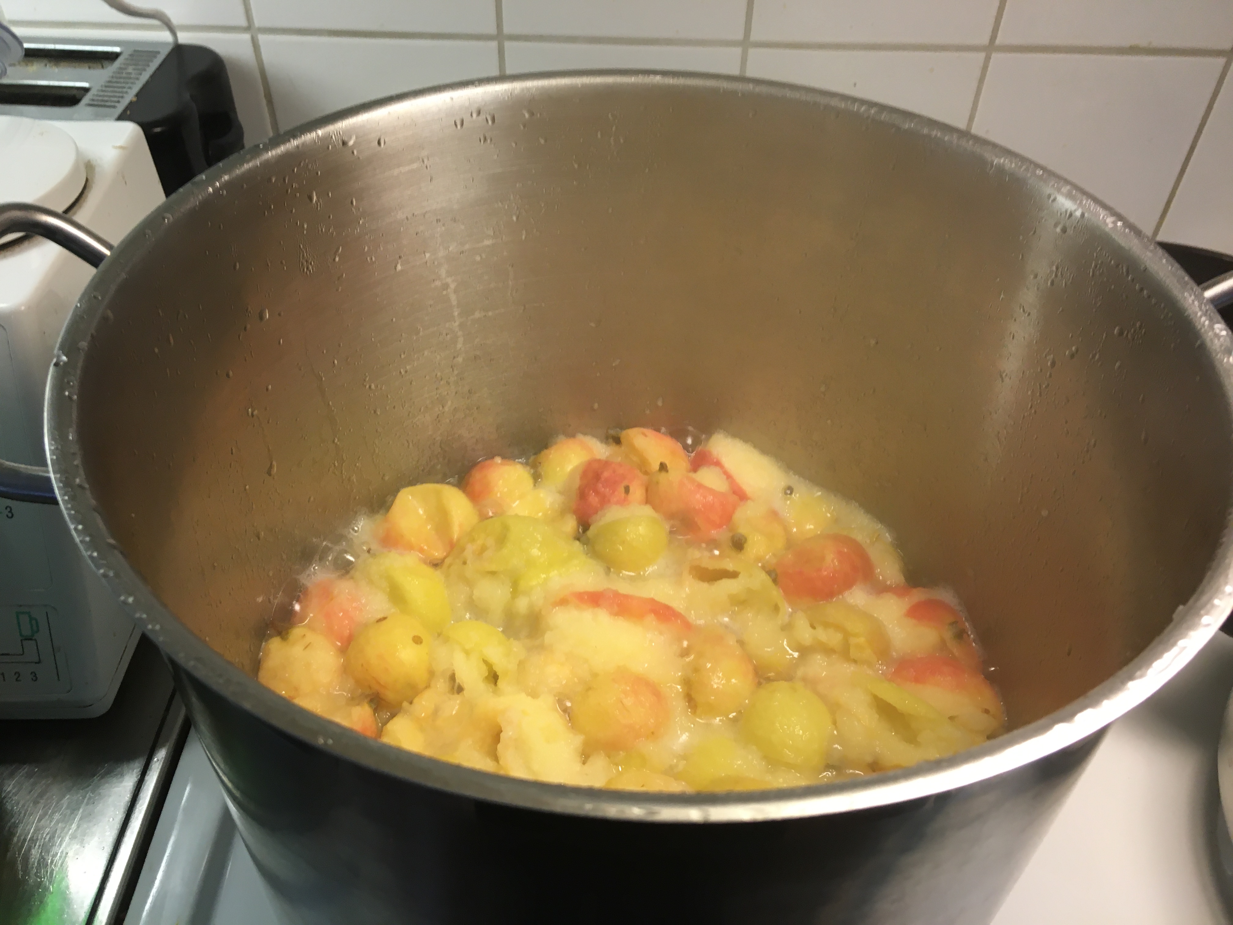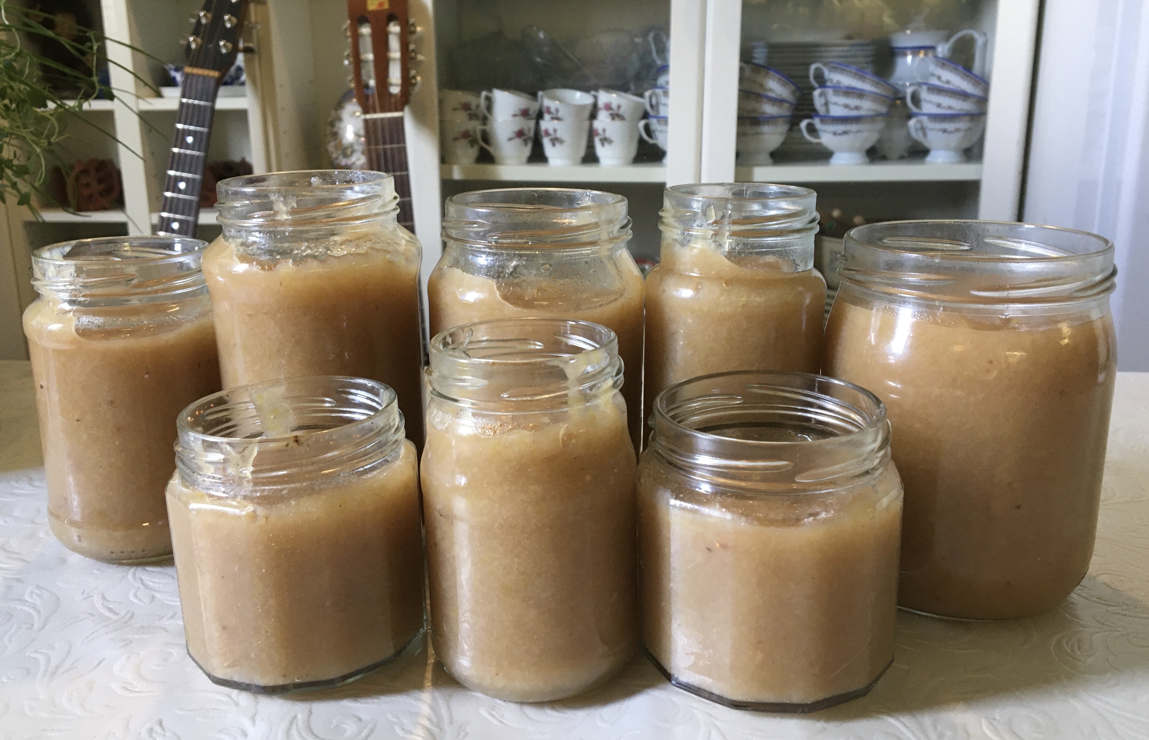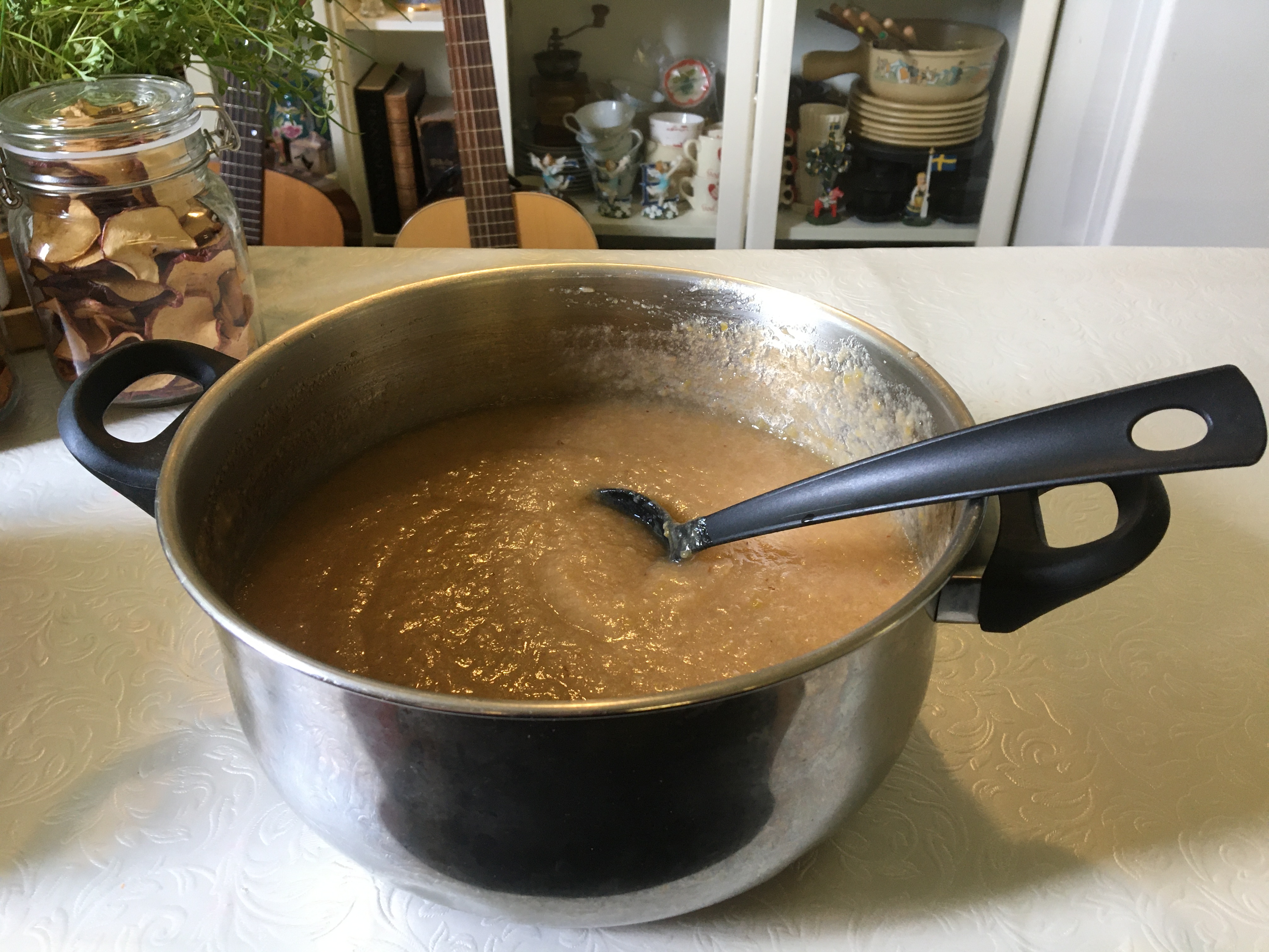Today I have made Applesauce from fallen apples. Last night there was a heavy thunderstorm and heavy rains. In the common yard outside my apartmentcomplex there are these big appletrees. Anyone can pick the apples but I never see anyone but me do it. However most are so high up I cannot reach them. But due to the weather apples fell to the ground last night. This morning I went out and picked them. I have now cooked all and I got free Apple Sauce! I will freeze the jars and it will last me a year.