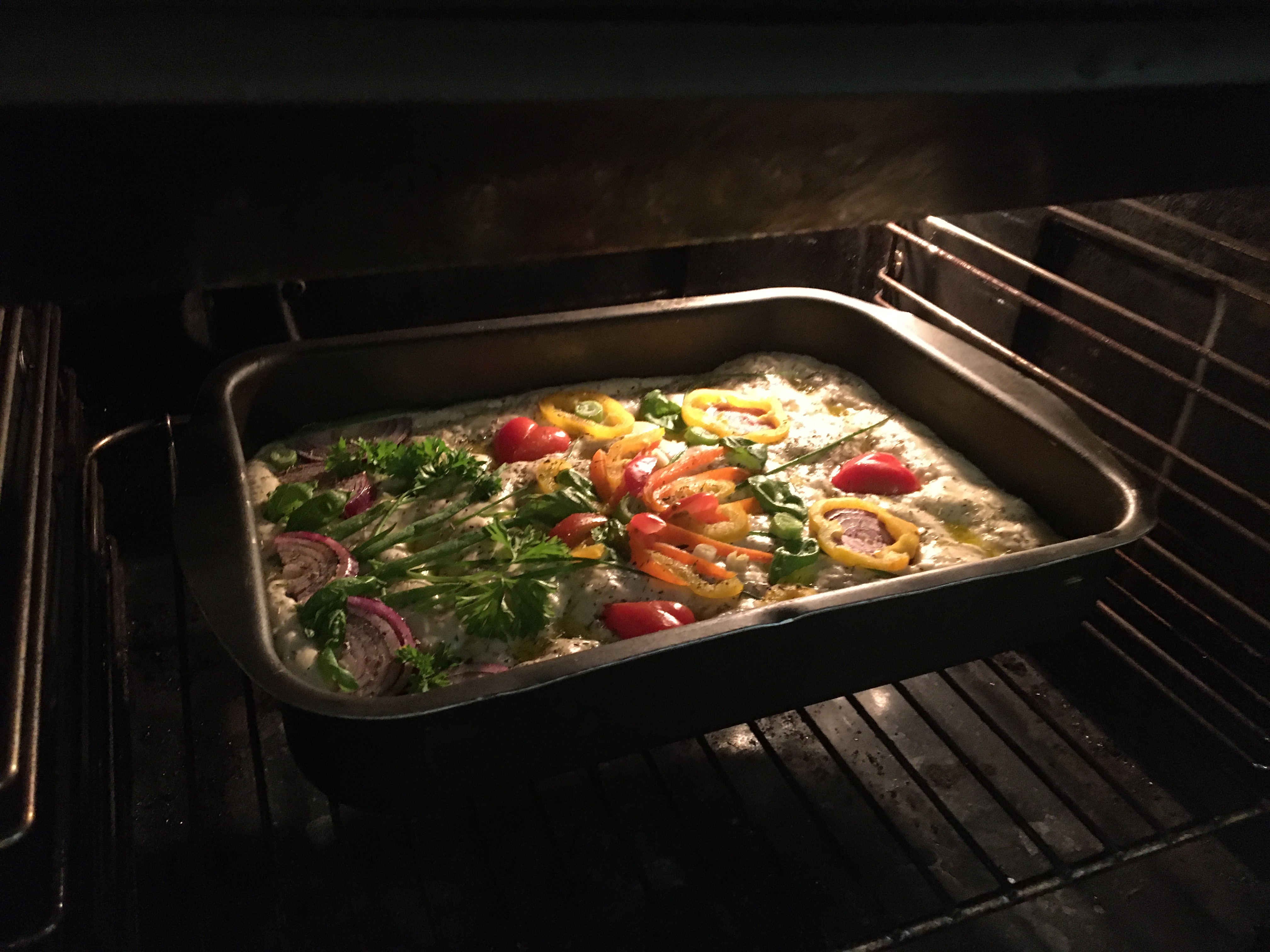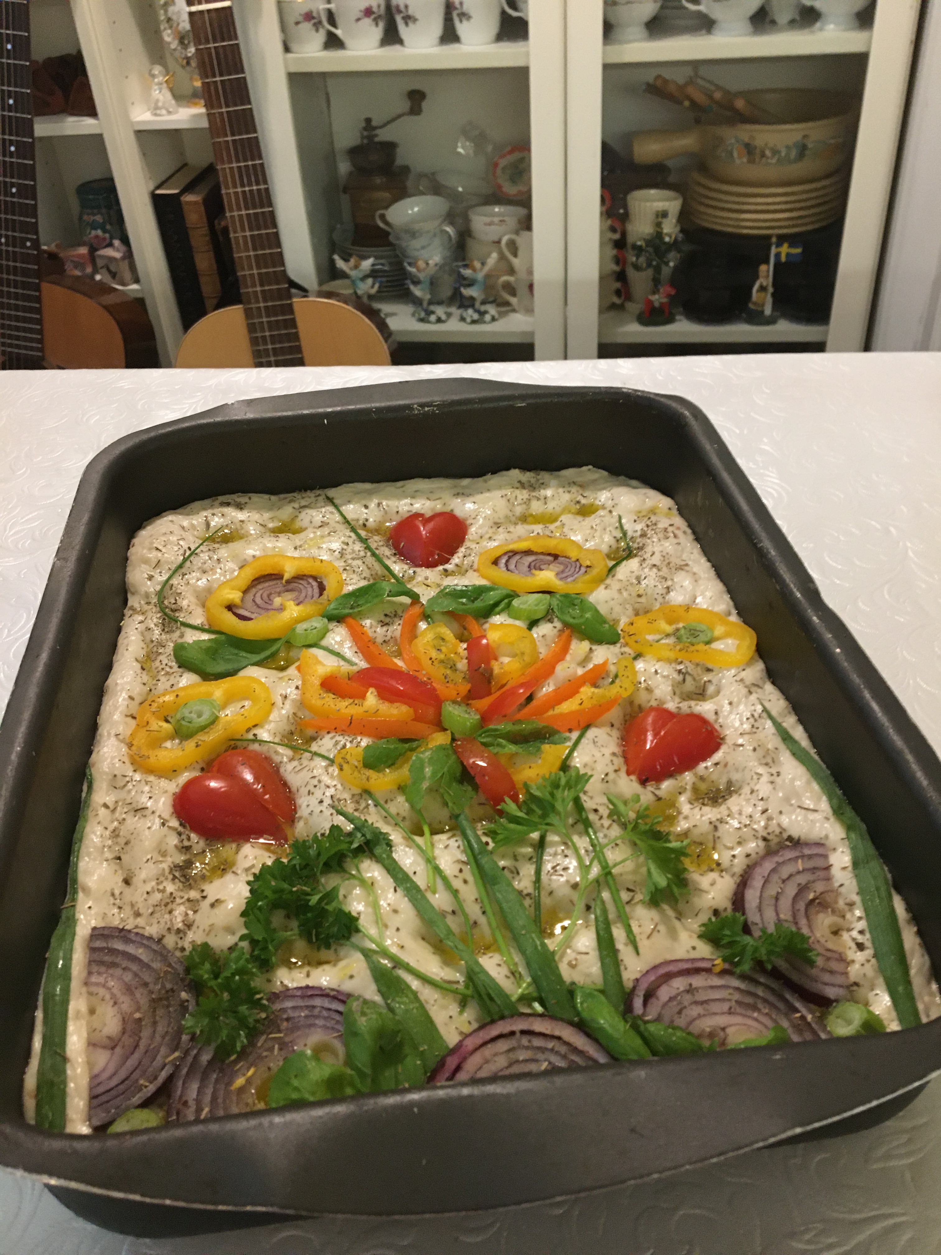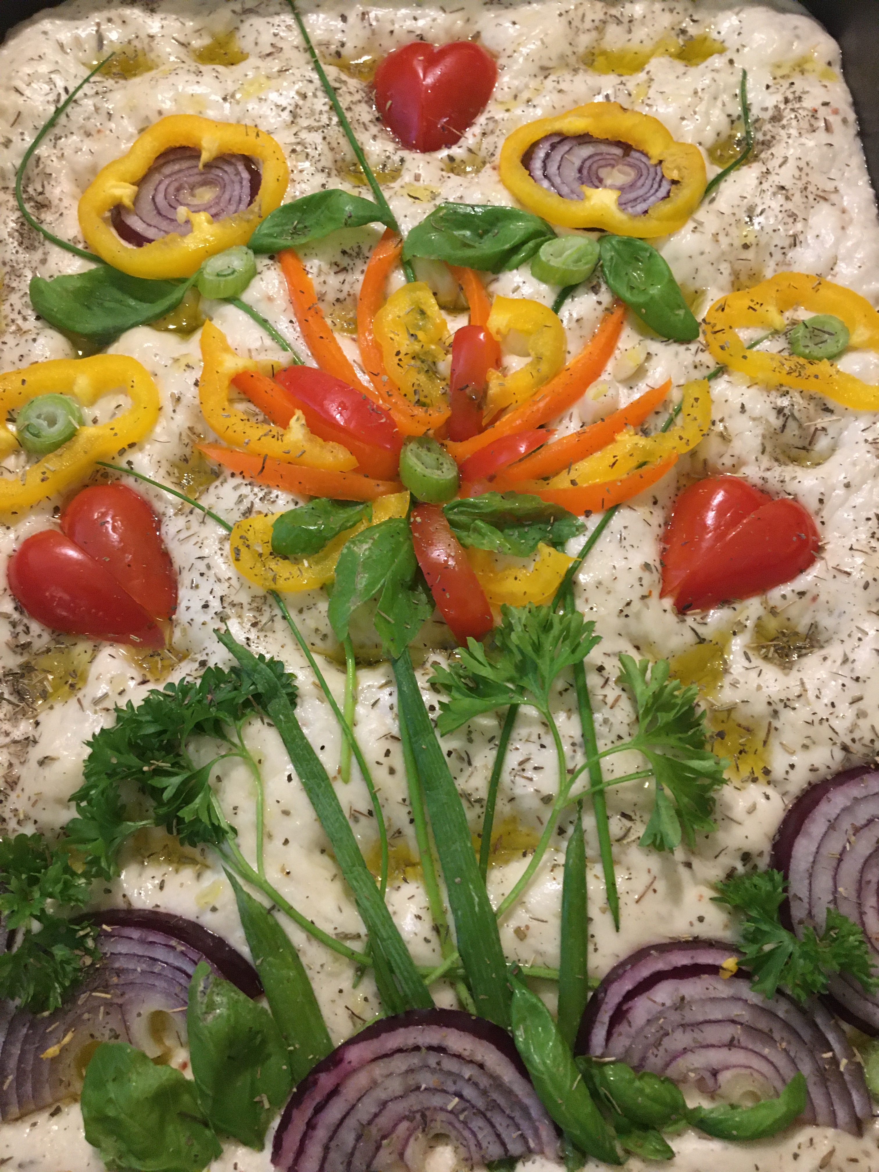If you want to decorate like I have done: Cut the Red Onion, Spring Onion, Basil, Peppers, Parsley, Coctail tomatoes and Chive into pieces according to what kind of decorations you plan to make. Make holes with your fingers all over the dough. Pour olive oil and sprinkle salt. Lay out your decorations on top of the Foccacio.