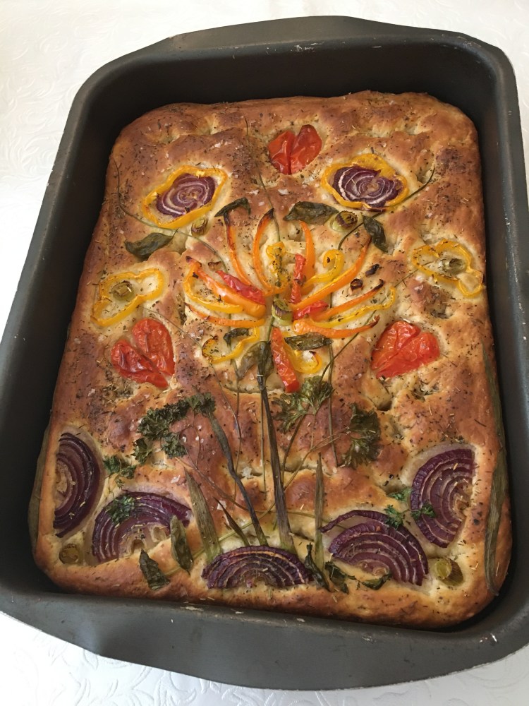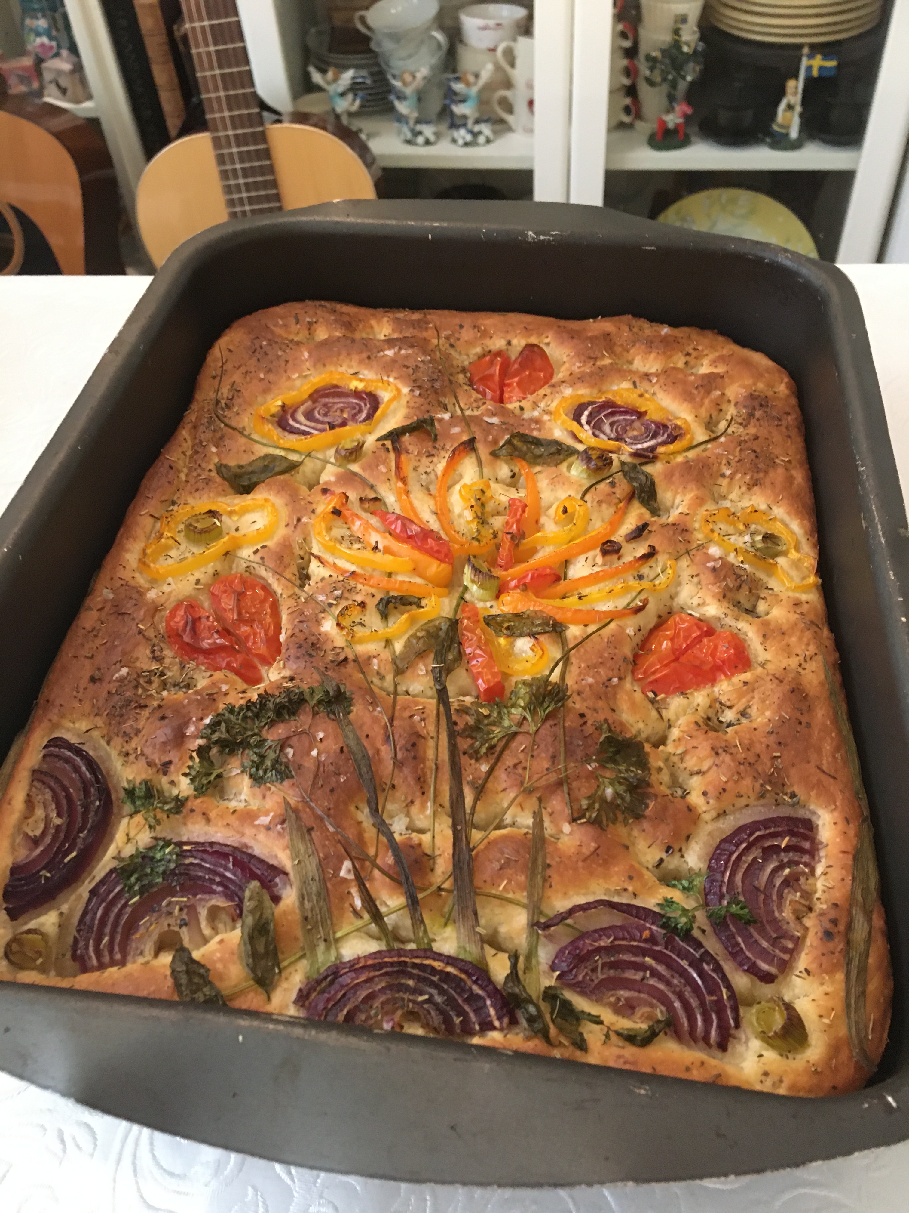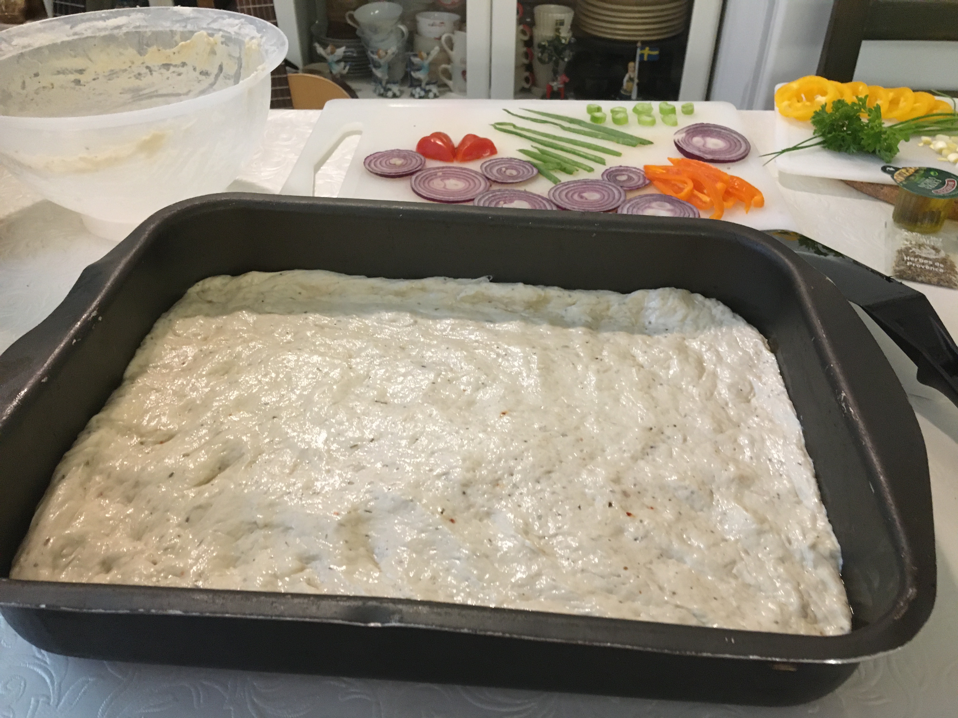 If you want to decorate like I have done: Cut the Red Onion, Spring Onion, Basil, Peppers, Parsley, Coctail tomatoes and Chive into pieces according to what kind of decorations you plan to make. Make holes with your fingers all over the dough. Pour olive oil and sprinkle salt. Lay out your decorations on top of the Foccacio.