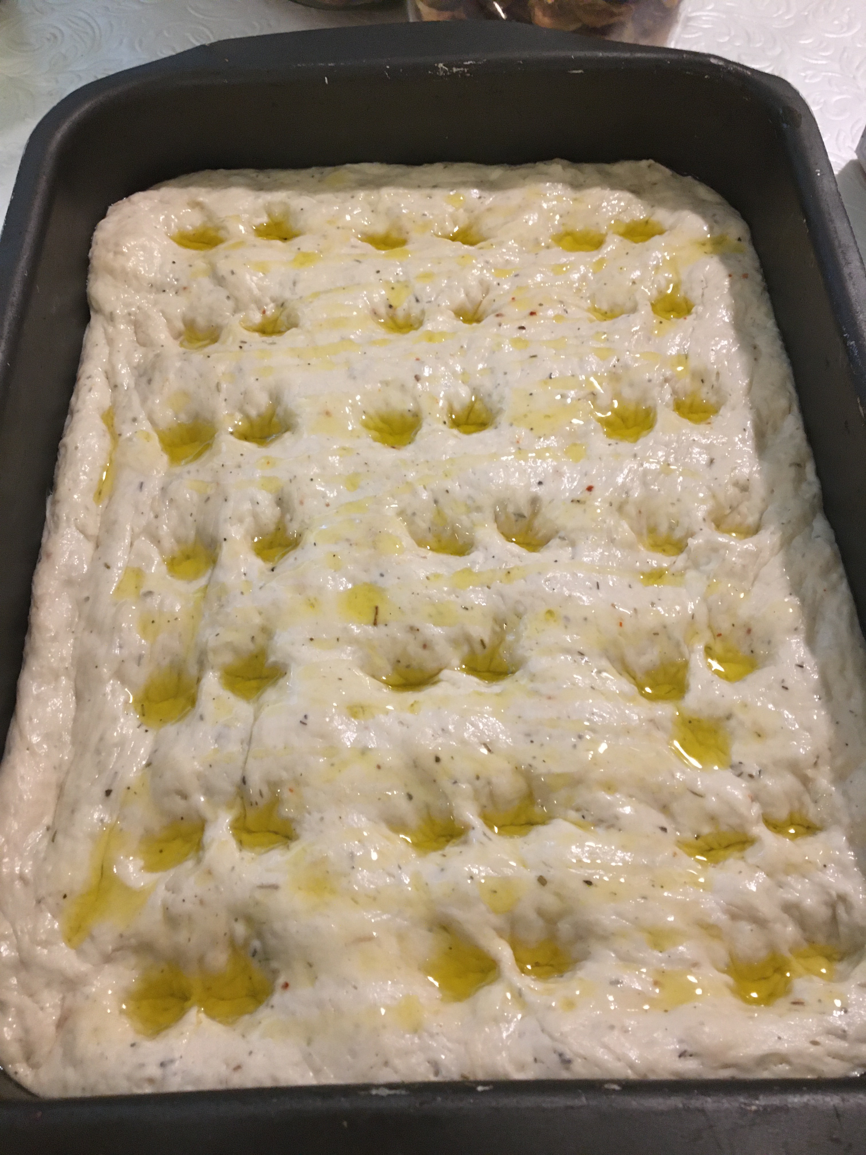Form holes with your fingers in the dough, drizzle with plenty of olive oil and sprinkle with flake salt.