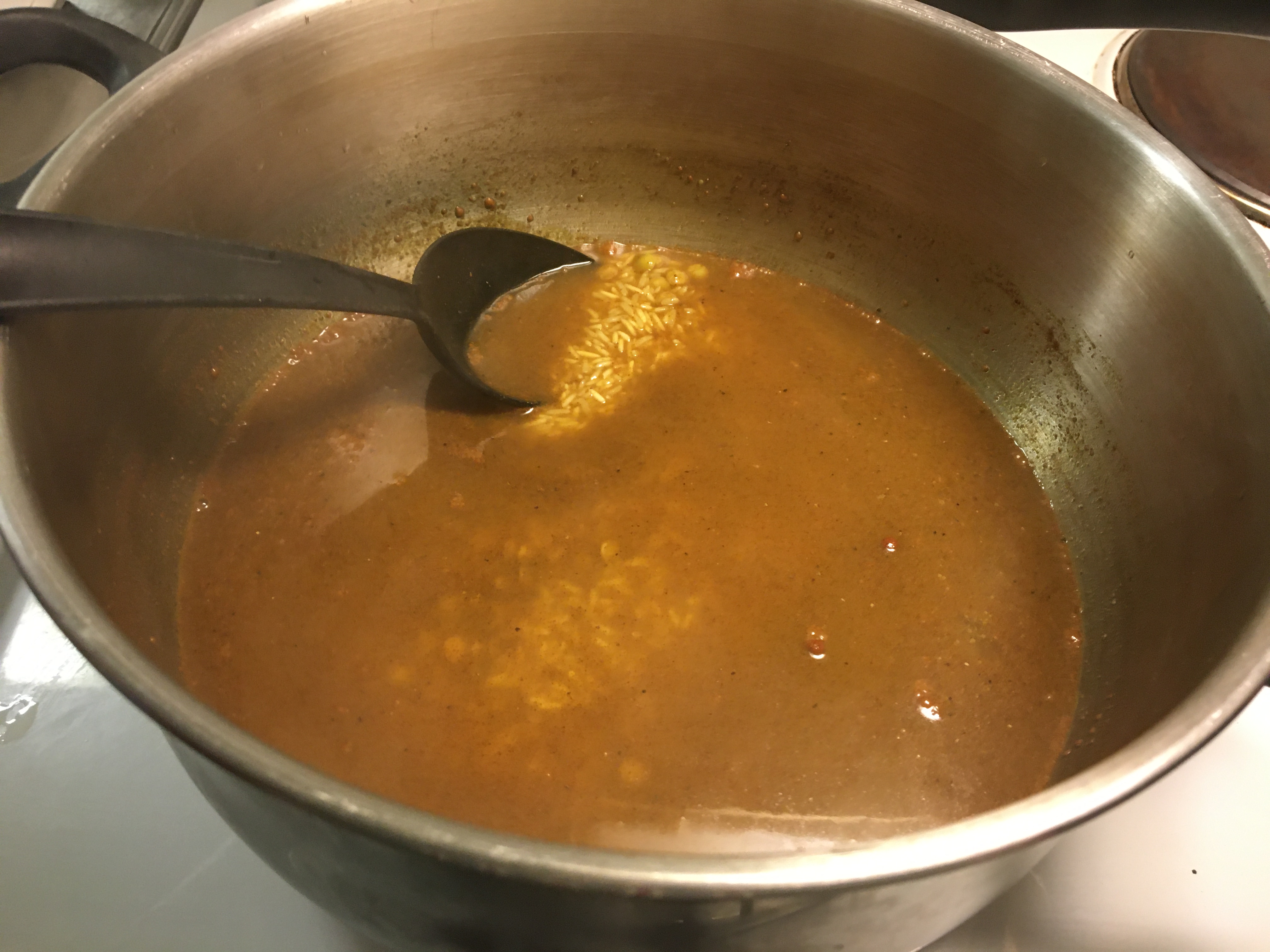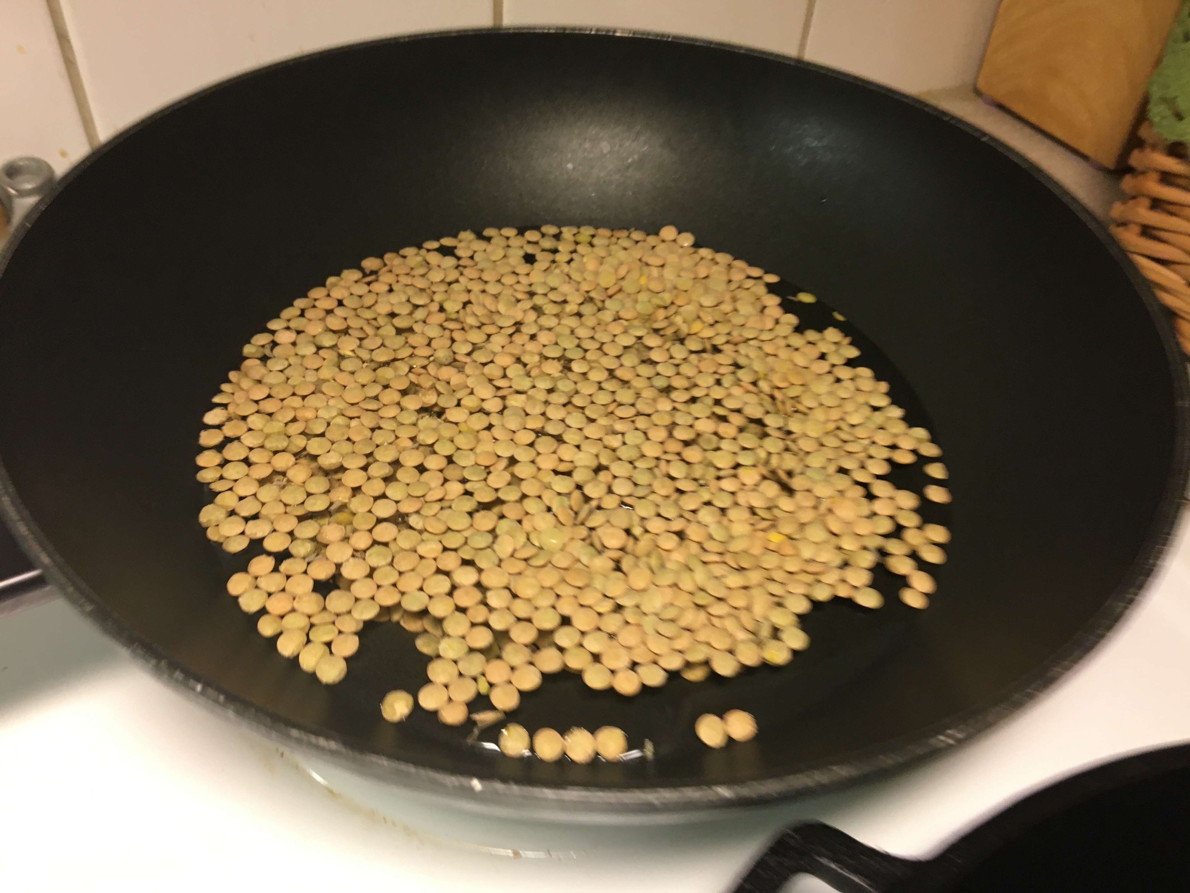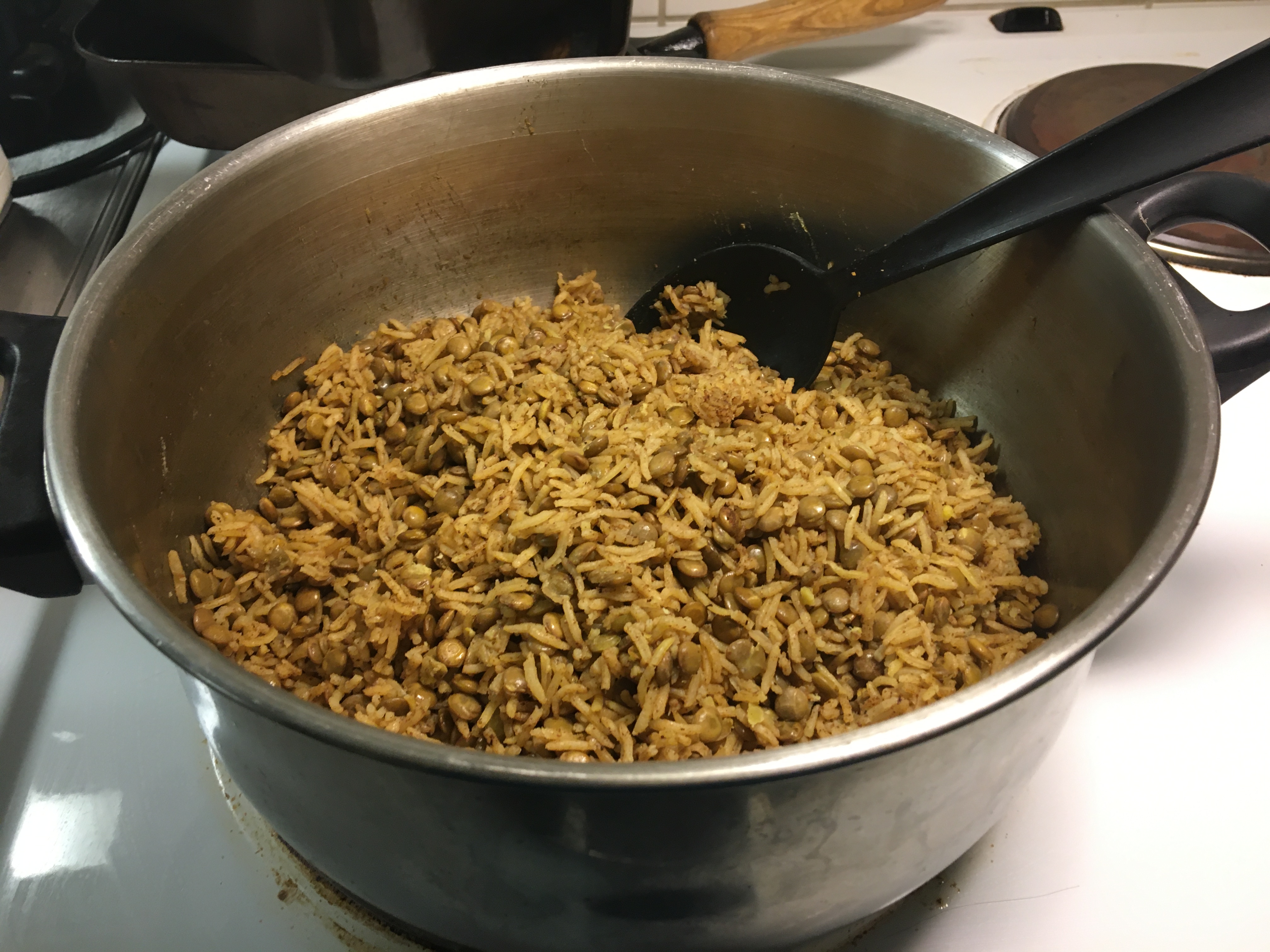 Stir to coat the rice with the oil and then add the cooked lentils and the water.