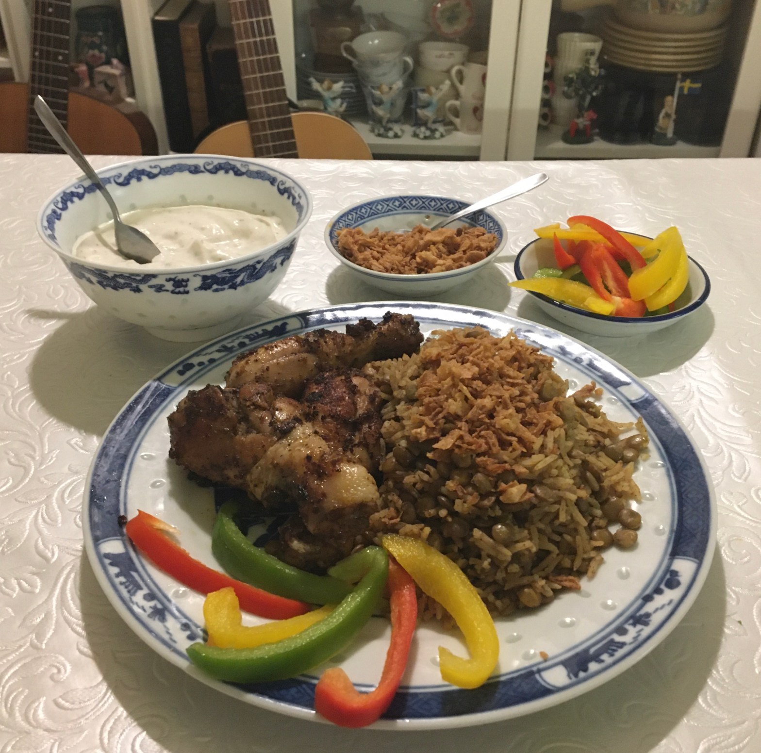 Serve Chicken Shawarma with Mejadra and Yoghurt Sauce