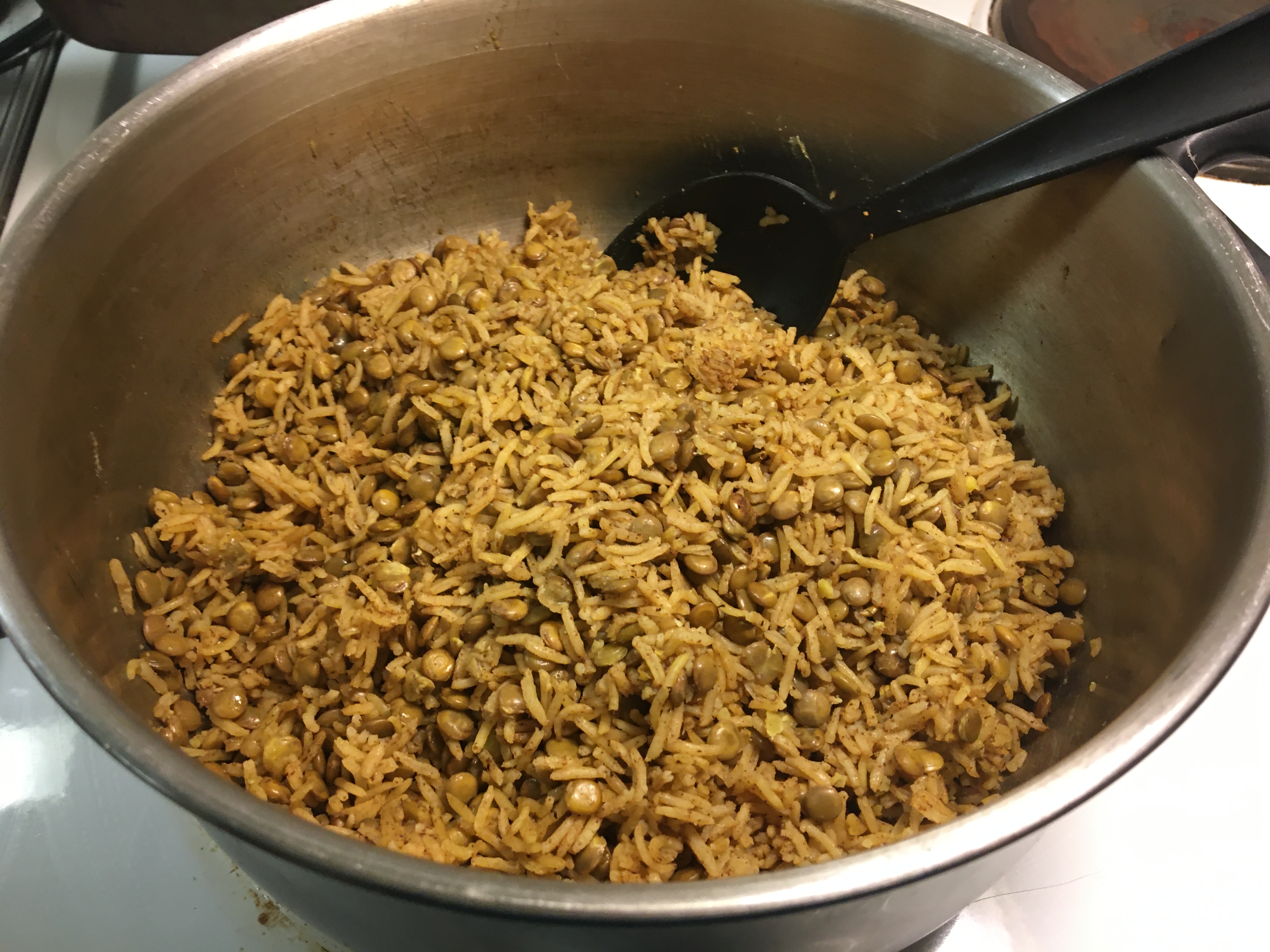 Finally, add half the fried onion to the rice and lentils and stir gently with a fork.