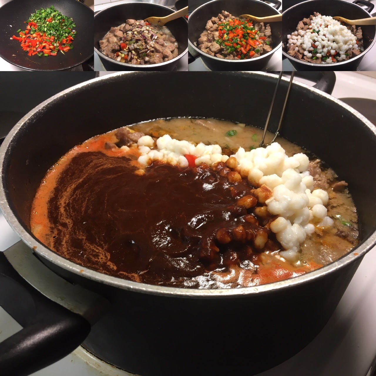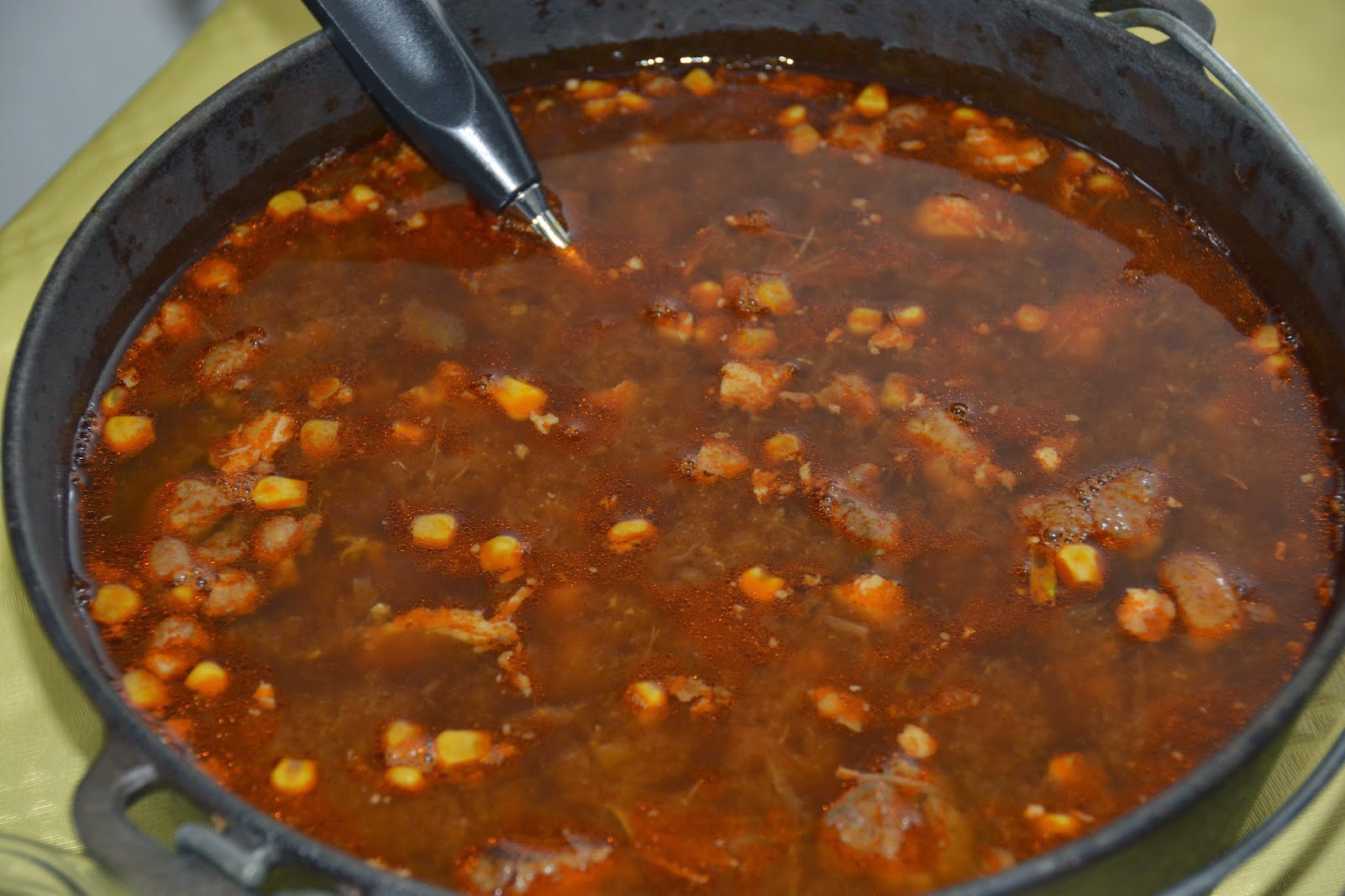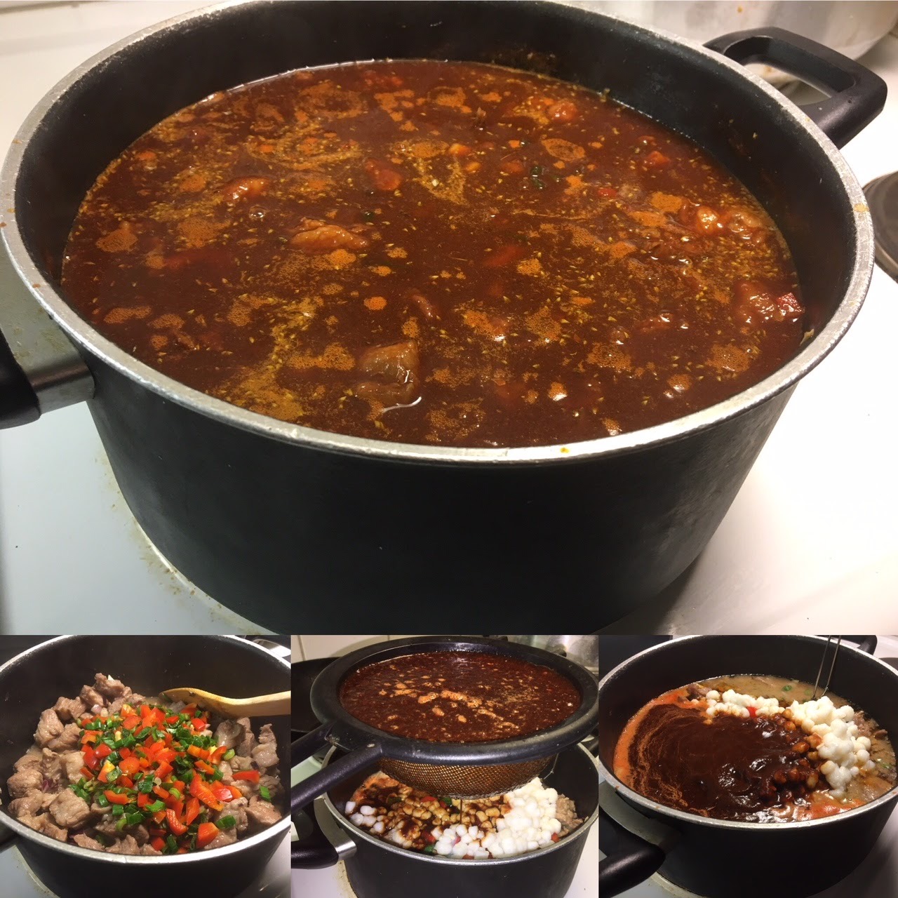 6 Add the red chili sauce to the pot with the pork and hominy. Add another couple teaspoons of salt. Return to a simmer, lower the heat to just high enough to maintain a simmer, partially covered. Cook for 3 hours until the pork is completely tender. Skim away excess fat. Taste for seasoning and add more salt to taste (you will likely need more than you expect, perhaps a tablespoon or more.) The resulting soup should be rather brothy, as you will be adding a lot garnishes. Add more water if necessary.