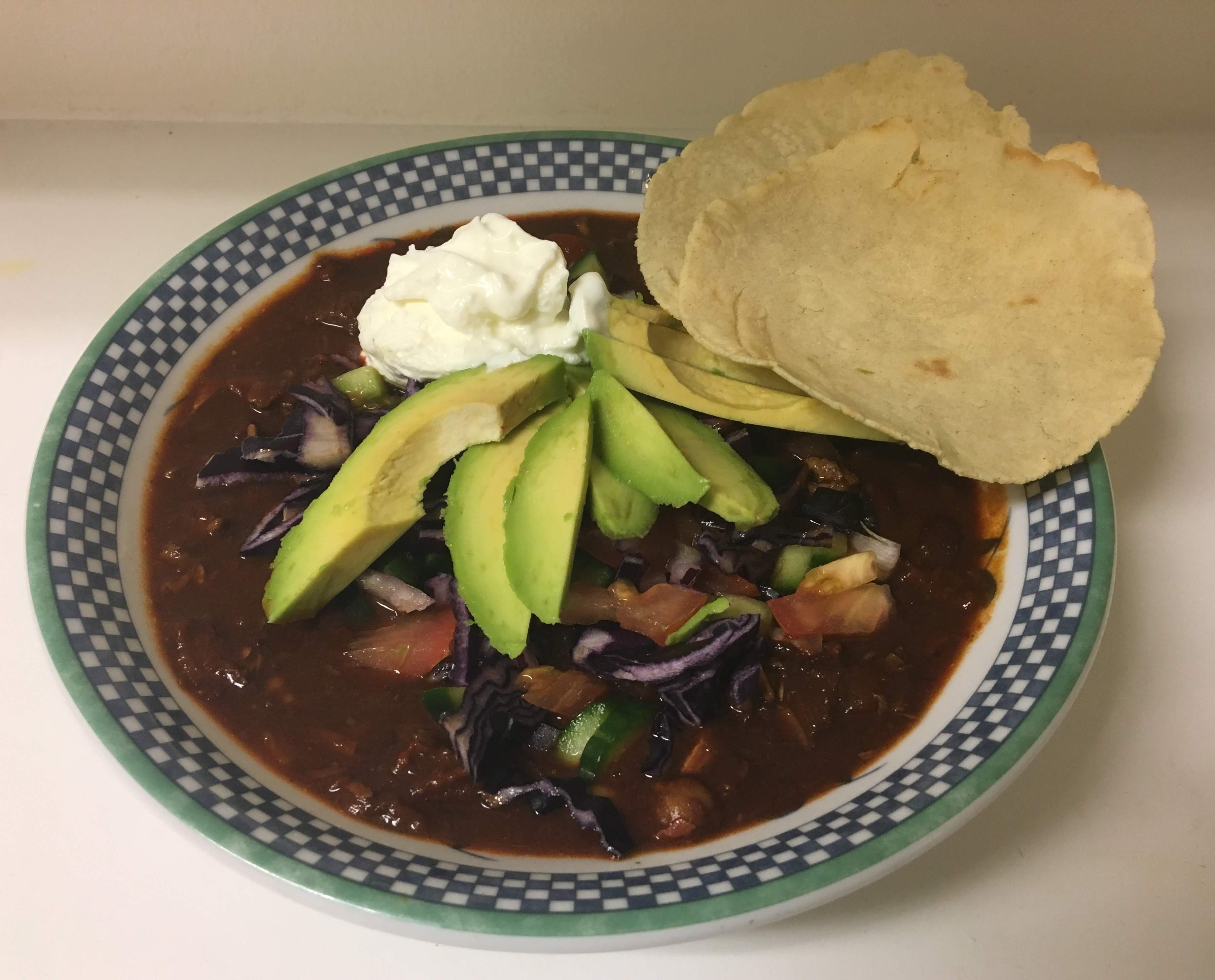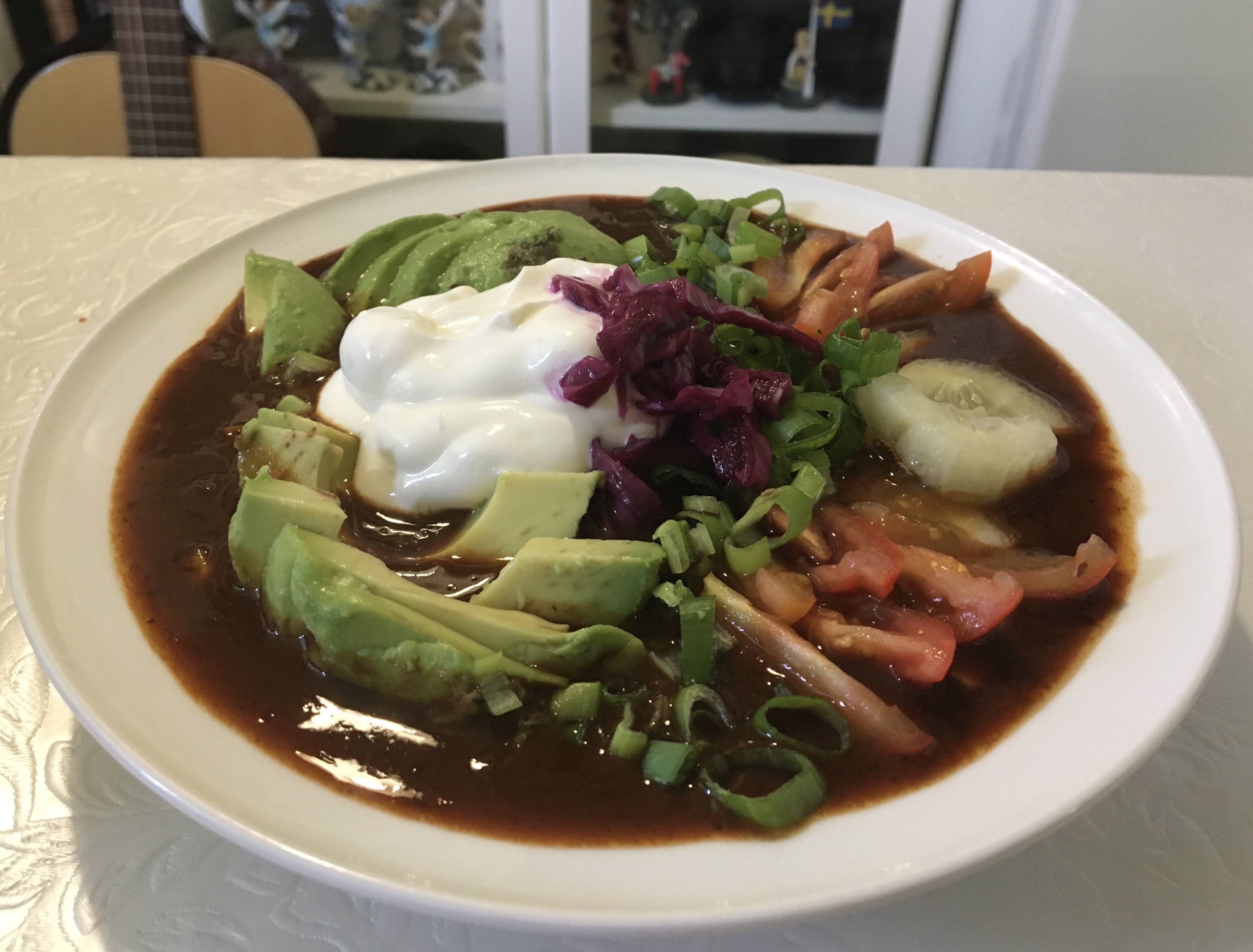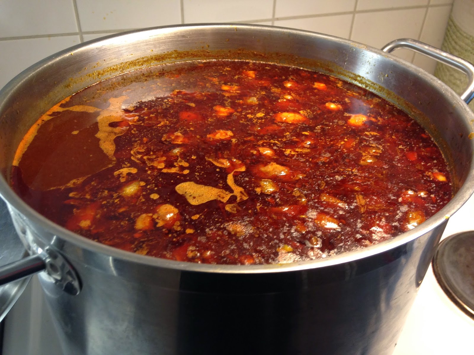 6 Add the red chili sauce to the pot with the pork and hominy. Add another couple teaspoons of salt. Return to a simmer, lower the heat to just high enough to maintain a simmer, partially covered. Cook for 3 hours until the pork is completely tender. Skim away excess fat. Taste for seasoning and add more salt to taste (you will likely need more than you expect, perhaps a tablespoon or more.) The resulting soup should be rather brothy, as you will be adding a lot garnishes. Add more water if necessary.