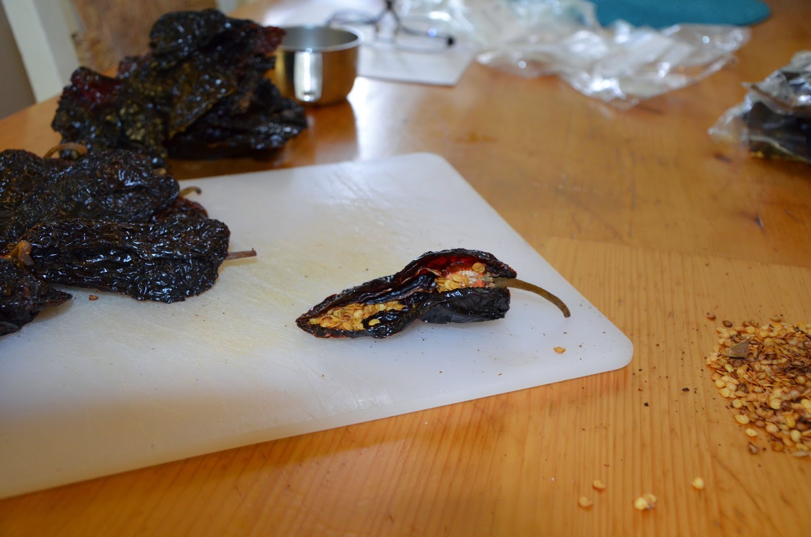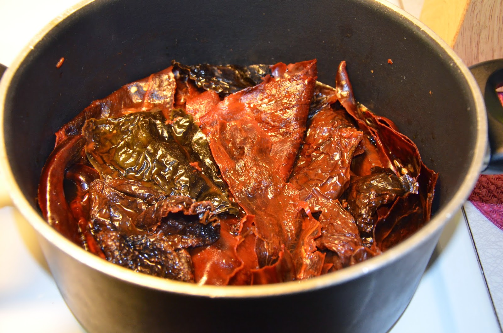 2 Remove and discard the stems, seeds, and large veins from the chili pods. Heat a cast iron pan on medium high and lightly roast the chili pods for a couple minutes, until they begin to soften. Do not let them burn. While the chilies are heating, bring a medium pot with 3 cups of water to a boil. Once the chiles have softened, submerge them in the pot with the 3 cups of hot water, cover the pot and remove from heat. Let the chiles soak in the hot water for 15 to 20 minutes.
