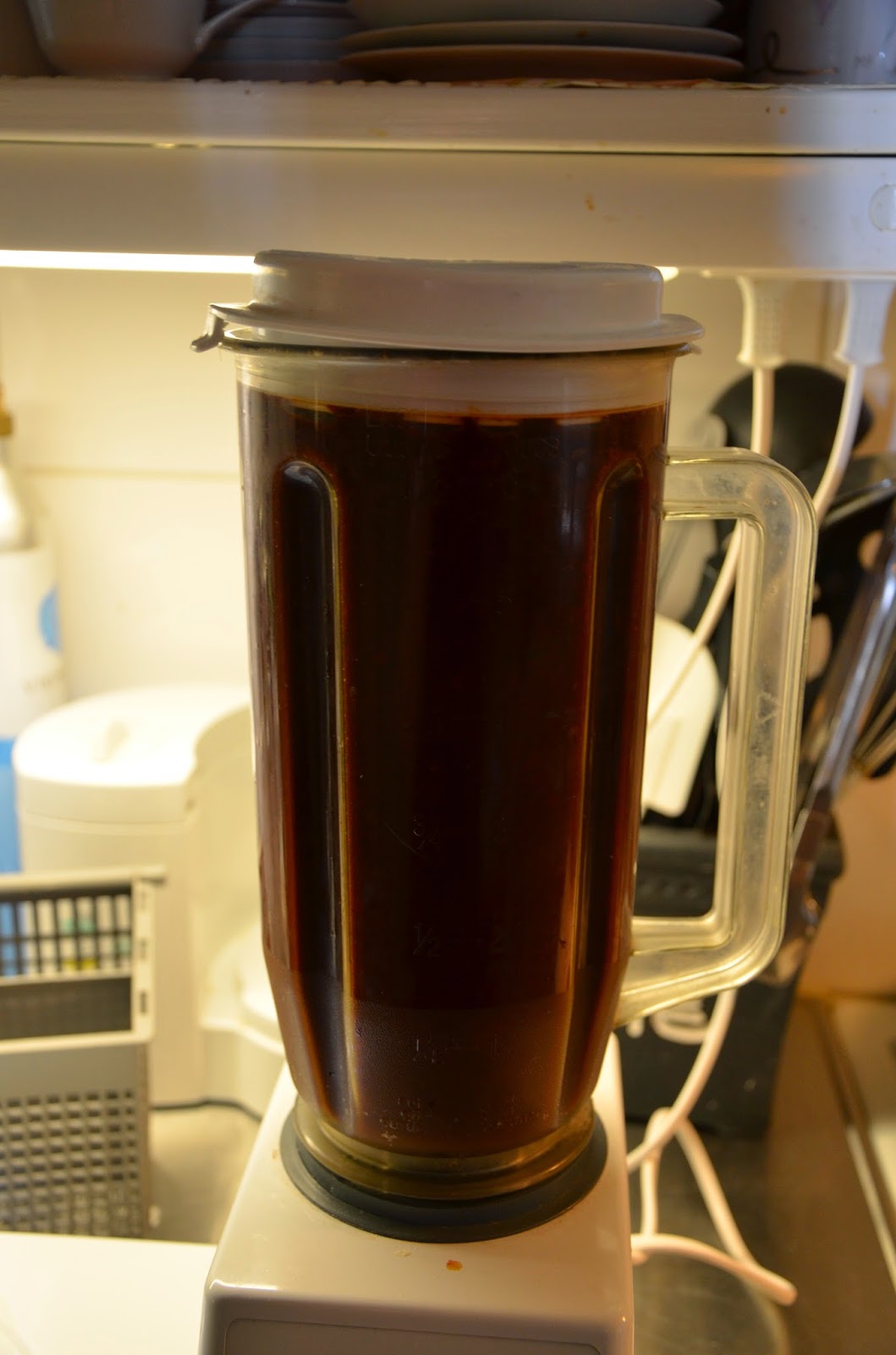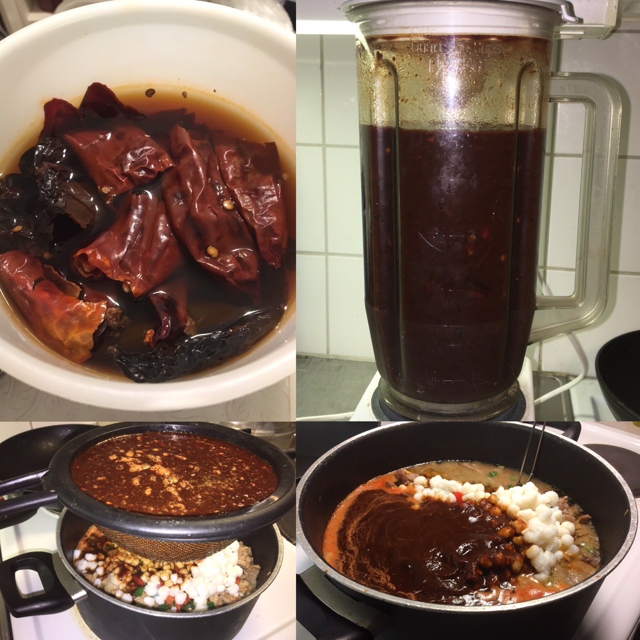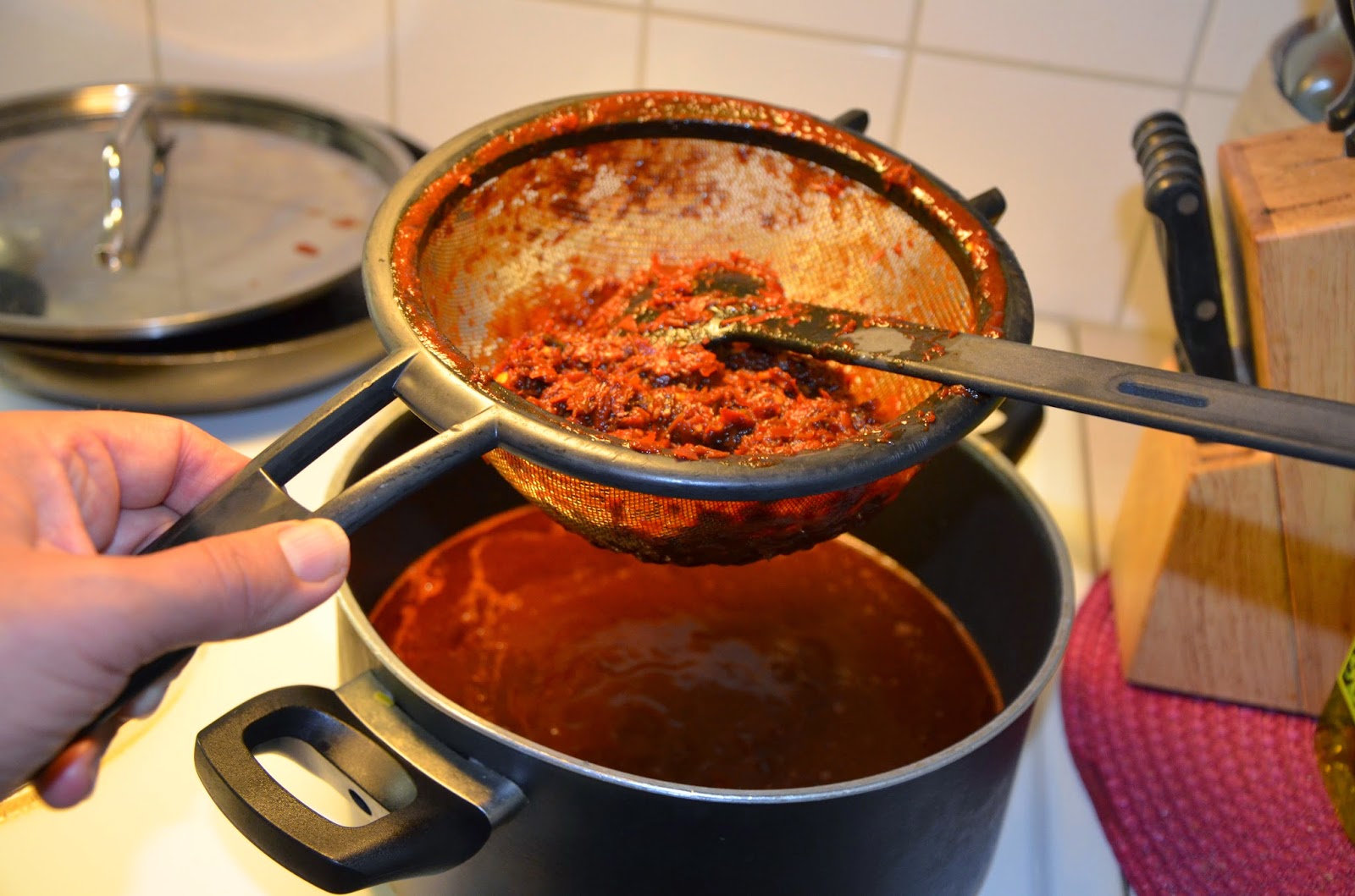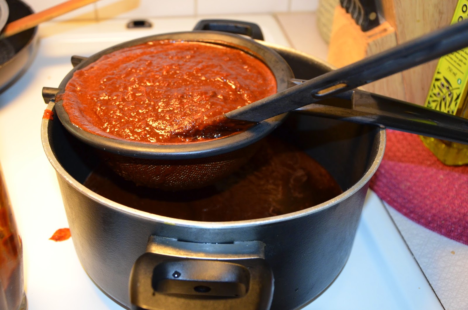 5 Prepare the red sauce by puréeing in a blender the chilies, 2 1/2 cups or so of their soaking liquid, a teaspoon of salt, and 4 cloves of garlic. (To prevent the blender from creating too much pressure, it’s probably best to start with the chiles and garlic and only a cup of the liquid in the blender, and then adding the rest of the liquid.) Strain the red sauce through a sieve, discarding the tough bits of the sauce.