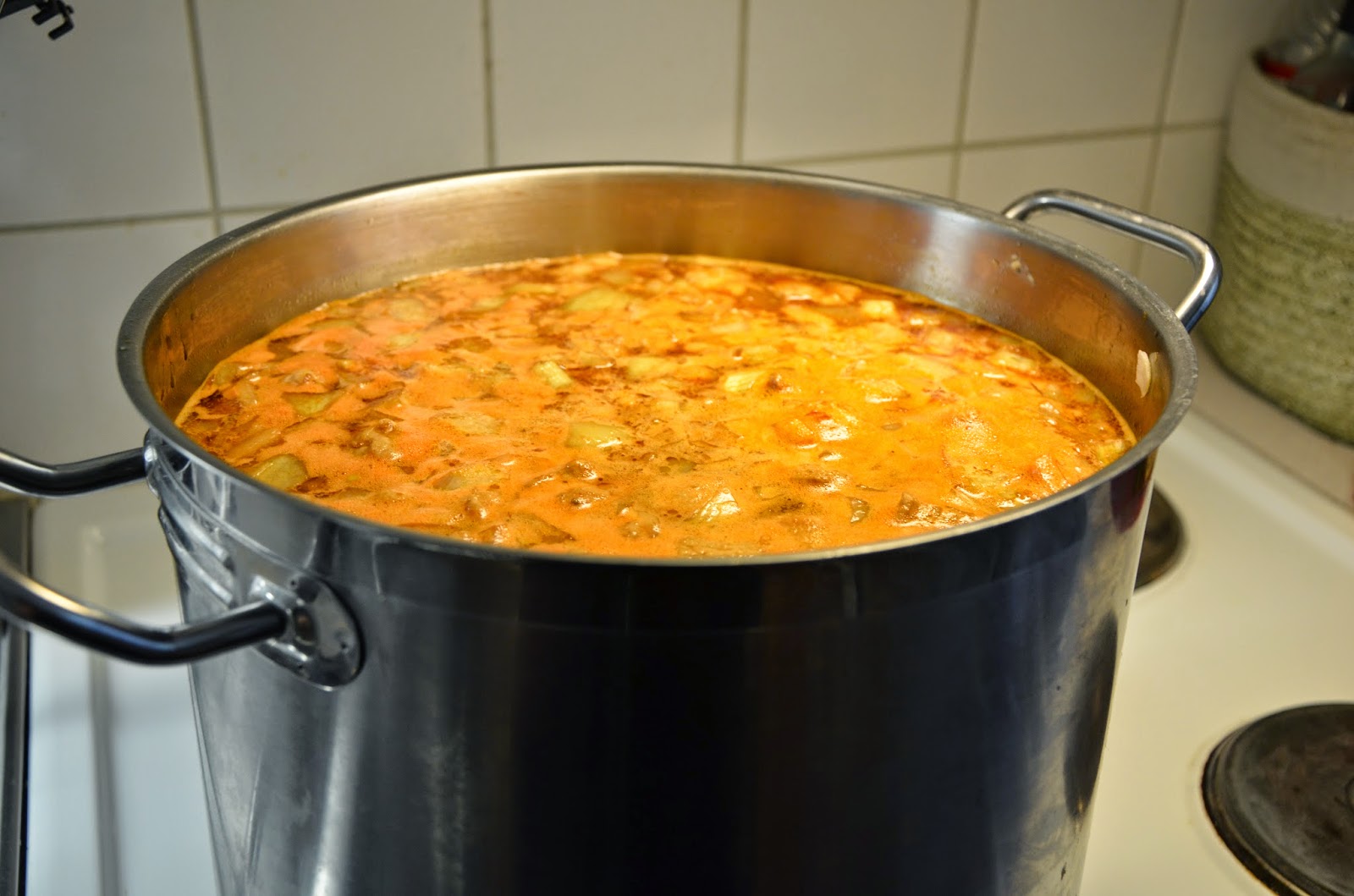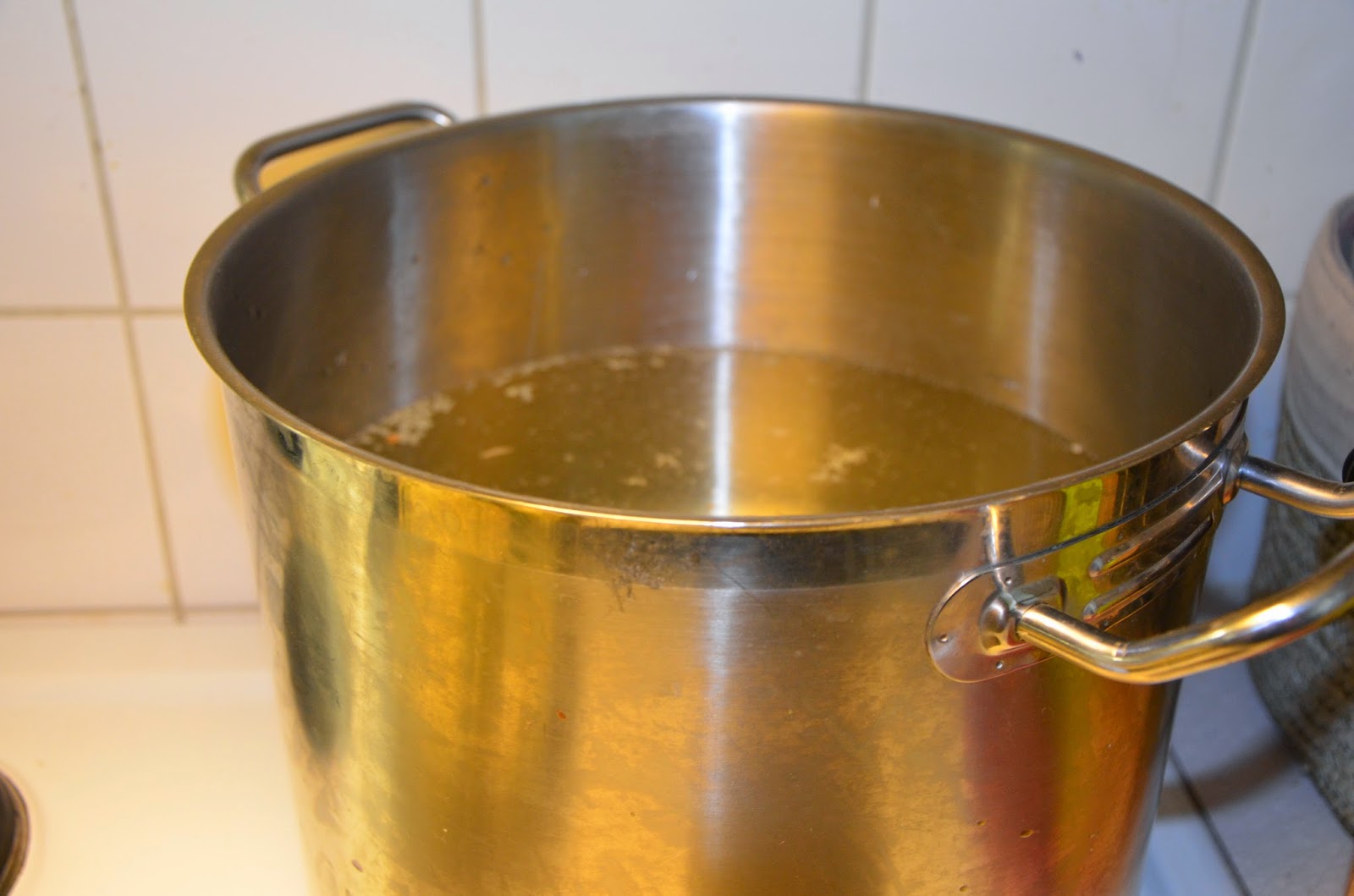 1 Fill a large 10-12 quart stockpot with 5 quarts (4,7l) of water. Set on heat to bring to a boil while you proceed with the next steps.