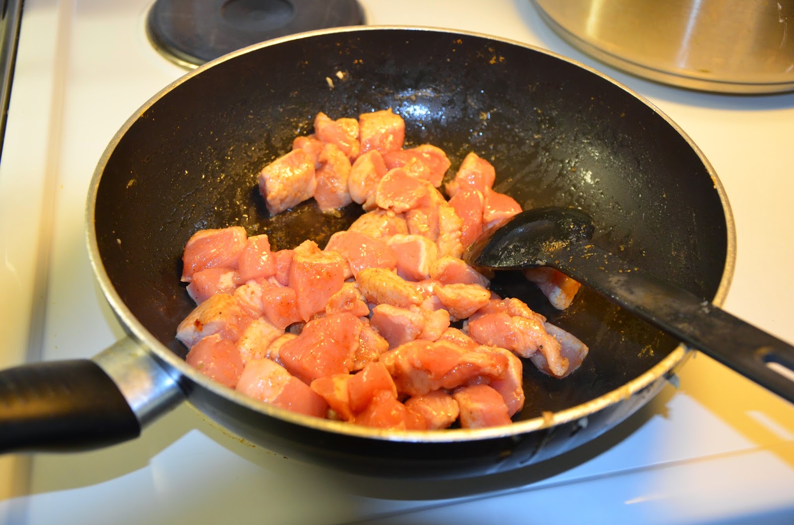 3 Heat a tablespoon or two of olive oil (enough to coat the bottom of the pan) in a large sauté pan on medium high heat. Pat the pork pieces dry with paper towels. Sprinkle them generously with salt. Working in batches, taking care not to crowd the pan or stir the meat much, brown the meat on all sides. Right at the end of browning the meat, add 4 cloves of roughly chopped garlic to the pan with the meat, let cook with the meat for about a minute.