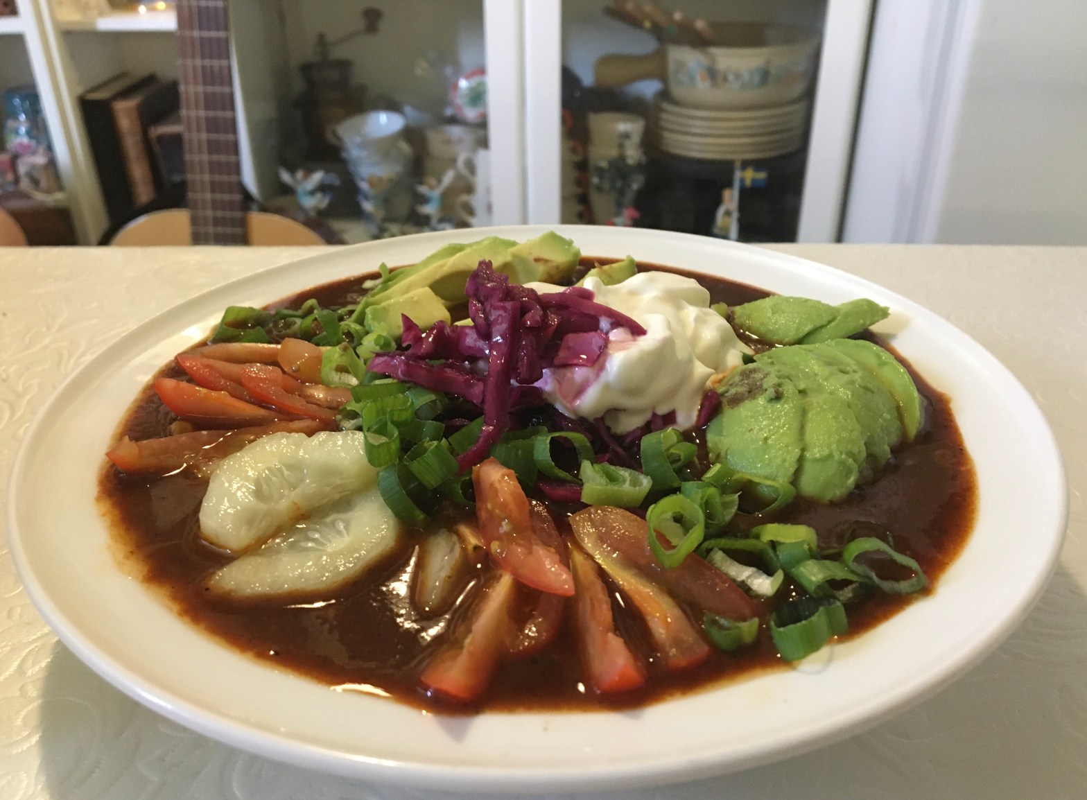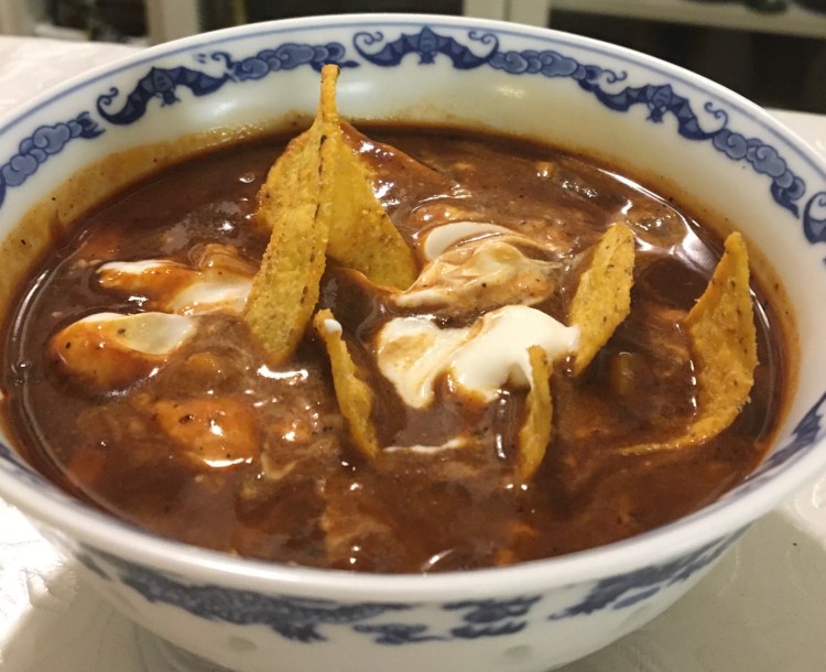 Enjoyed Posole Roja on a workday and Thursday! Looks festive, doesn’t it! Ready in five minutes! How is that possible since it needs to cook 3-5 hours?