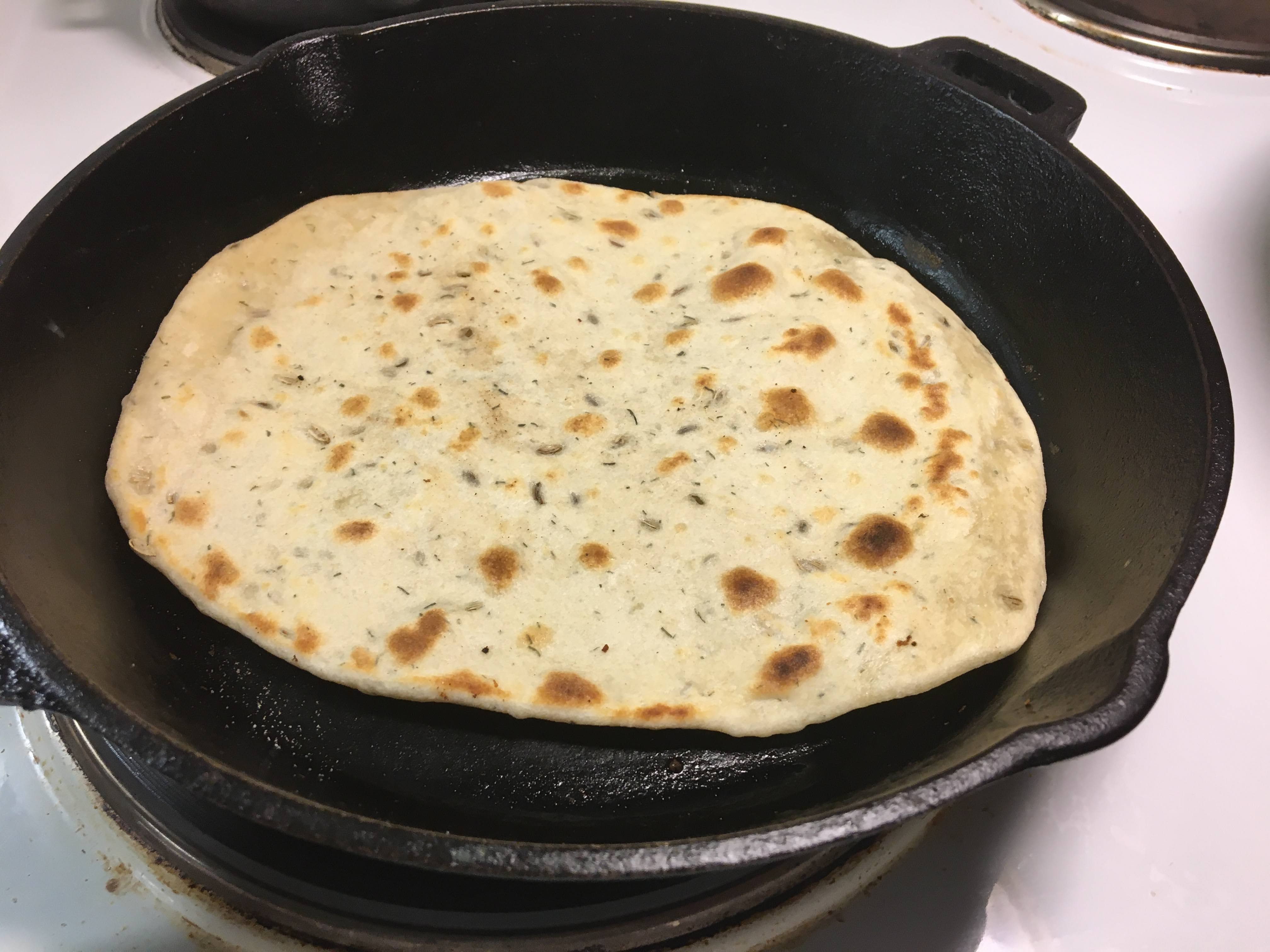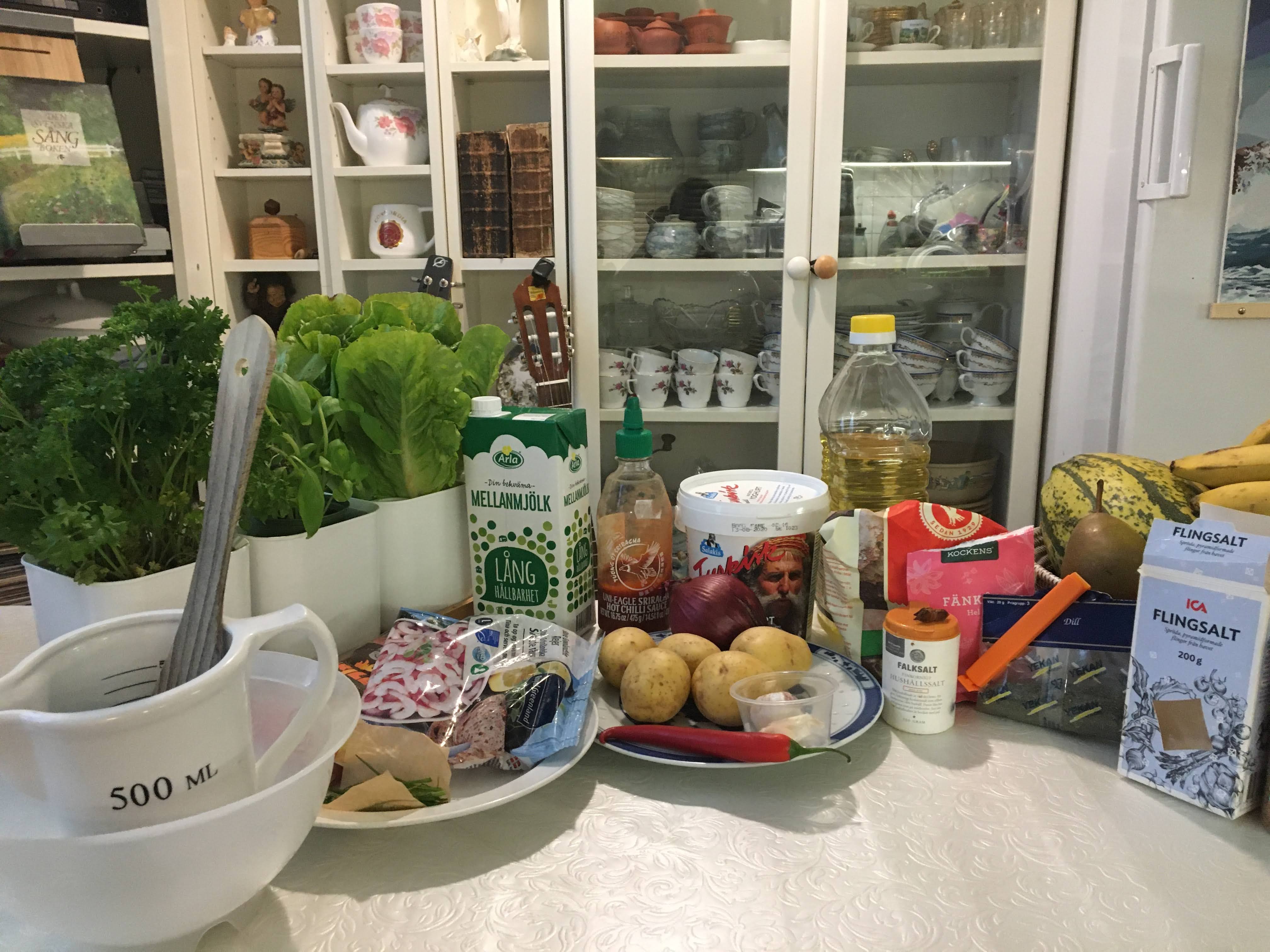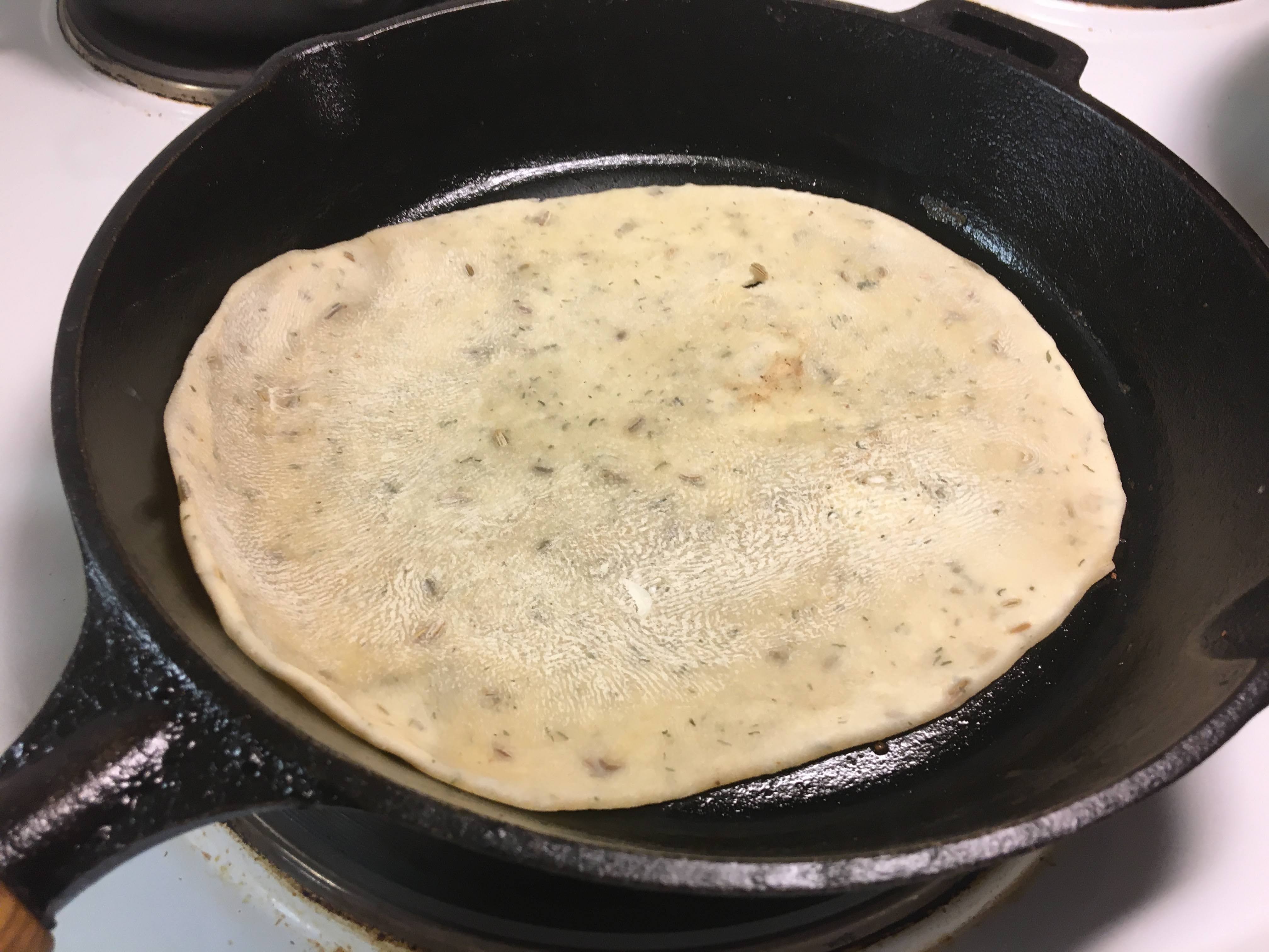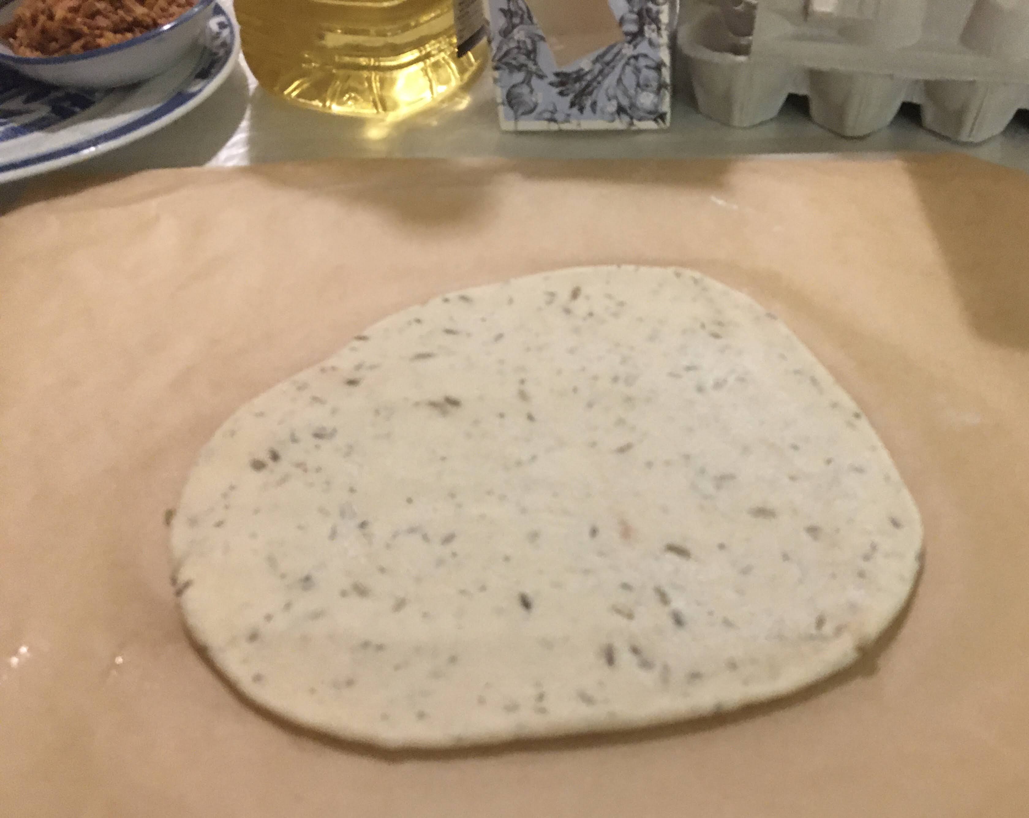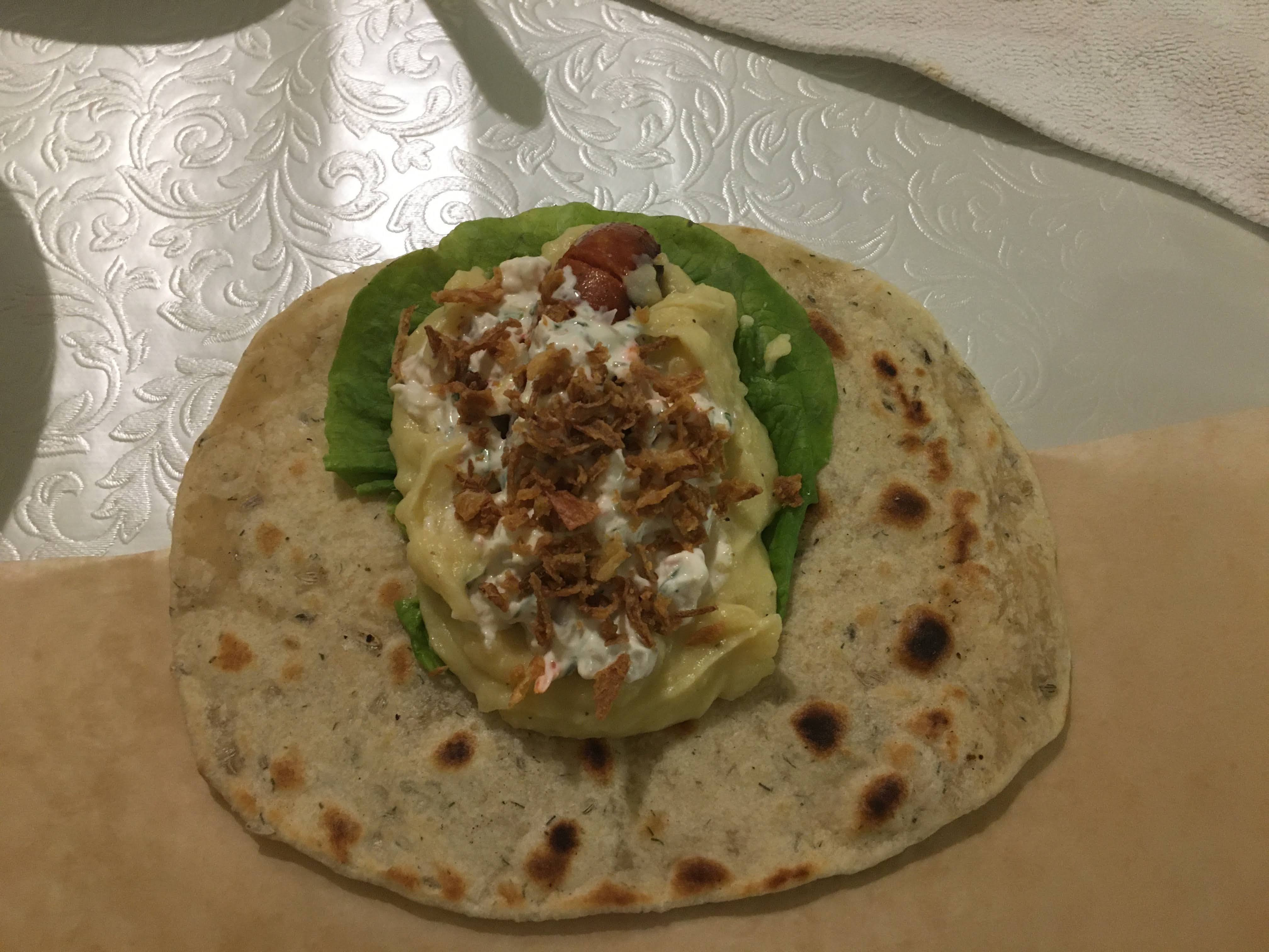 Place the flatbread on the table with parchmentpaper underneath 2/3 from the top. The paper should be large enough to wrap around the roll as it is done. Place fresh sallad, mashed potatoes, shrimpsalad, roasted onion, ketchup and senap in the middle and leave some of the bread free at the bottom. Than fold the bottom up over the filling and then fold the sides one at a time and make the roll. Wrap the roll with the paper and serve.