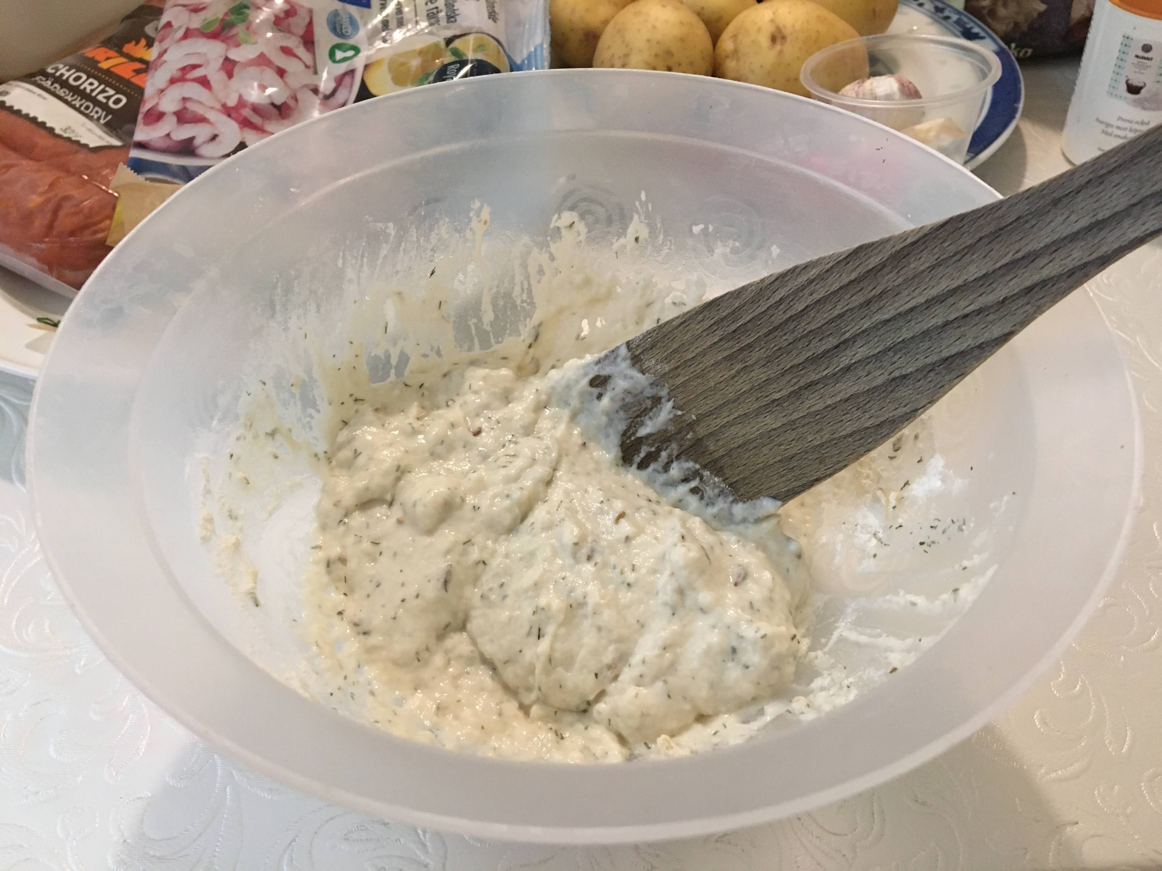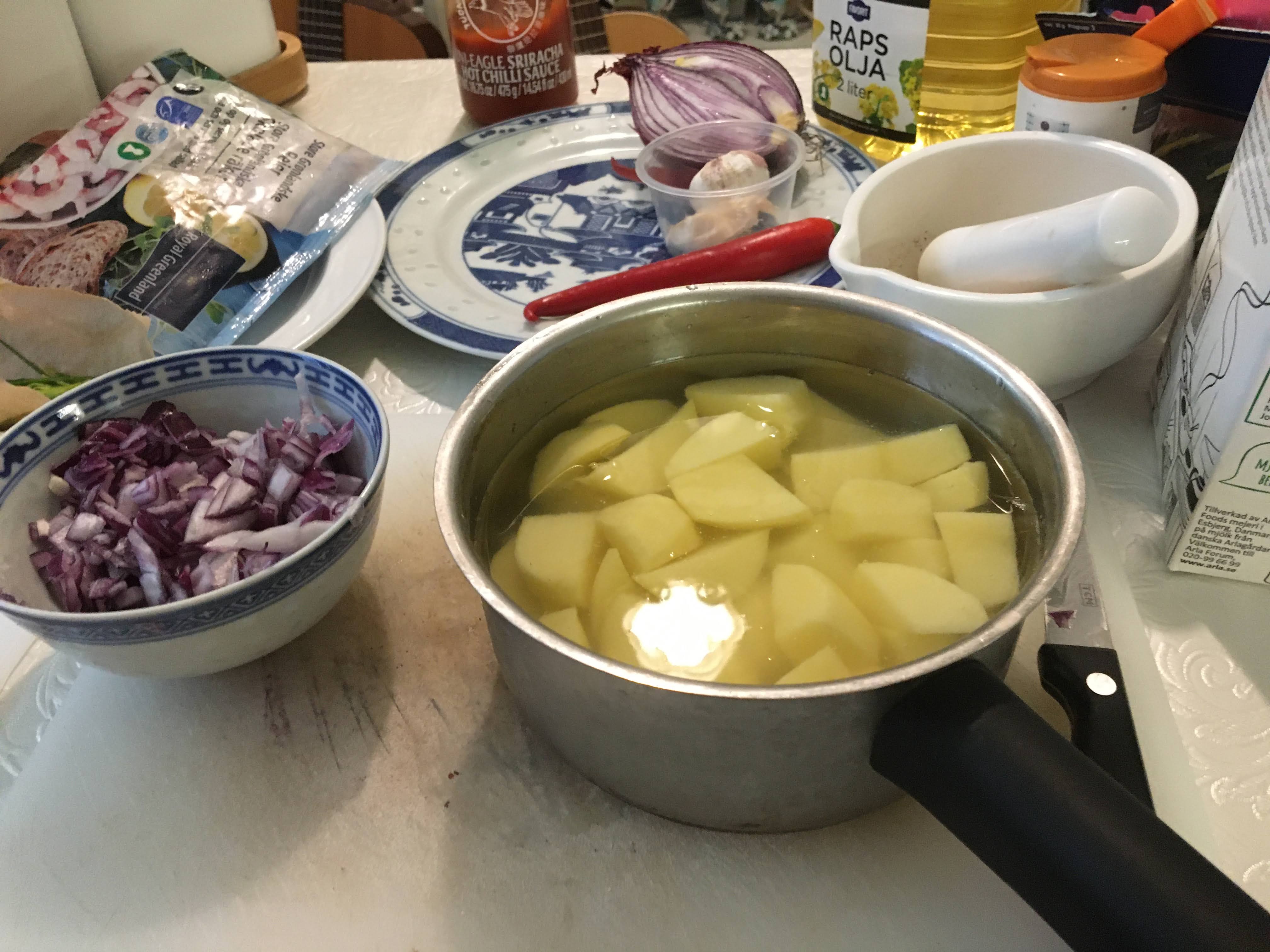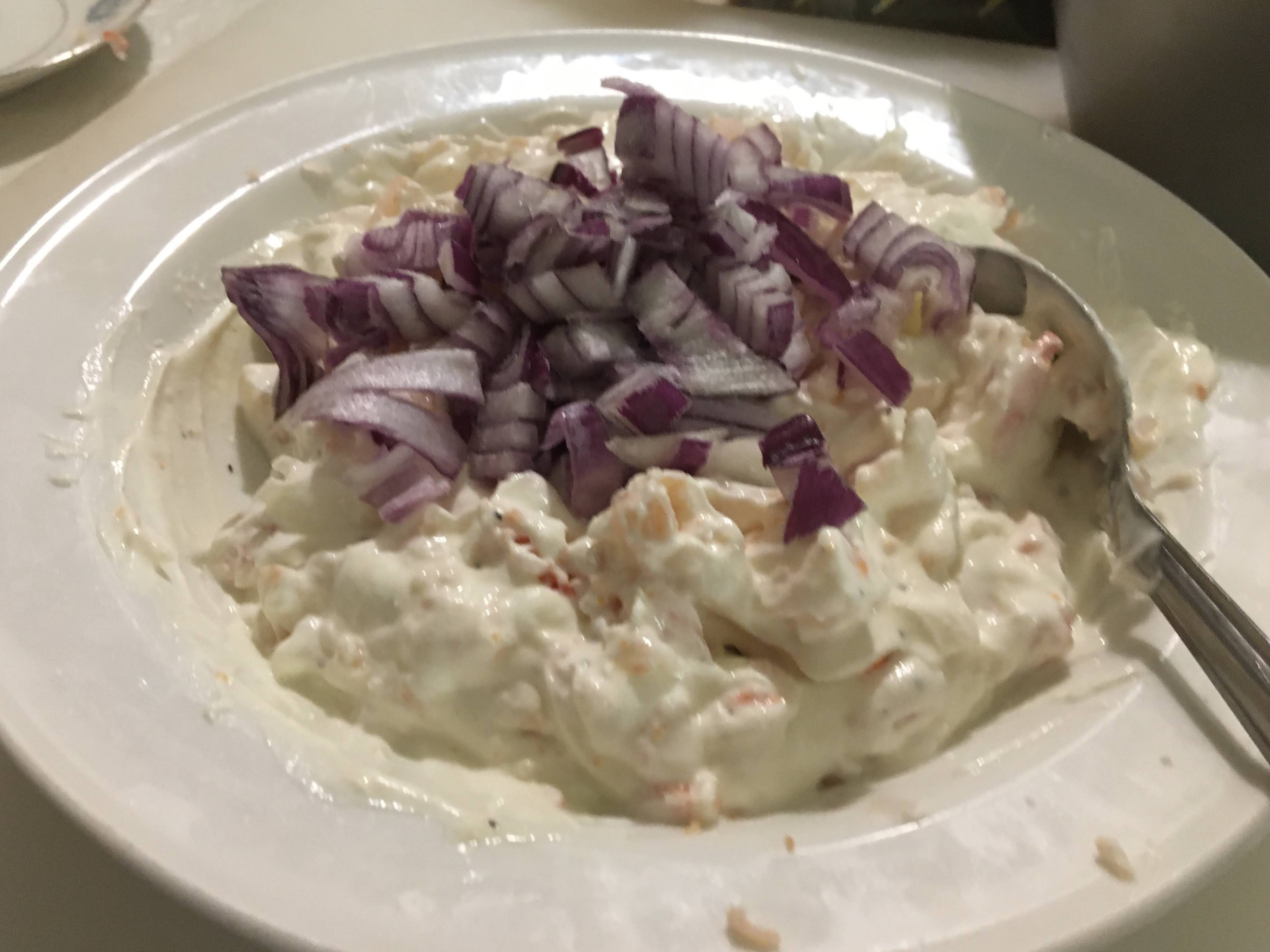 Chop the prawns and mix with rum, chopped red onion, mayonnaise, crème fraiche and chopped dill. Taste with lemon, salt and black pepper.