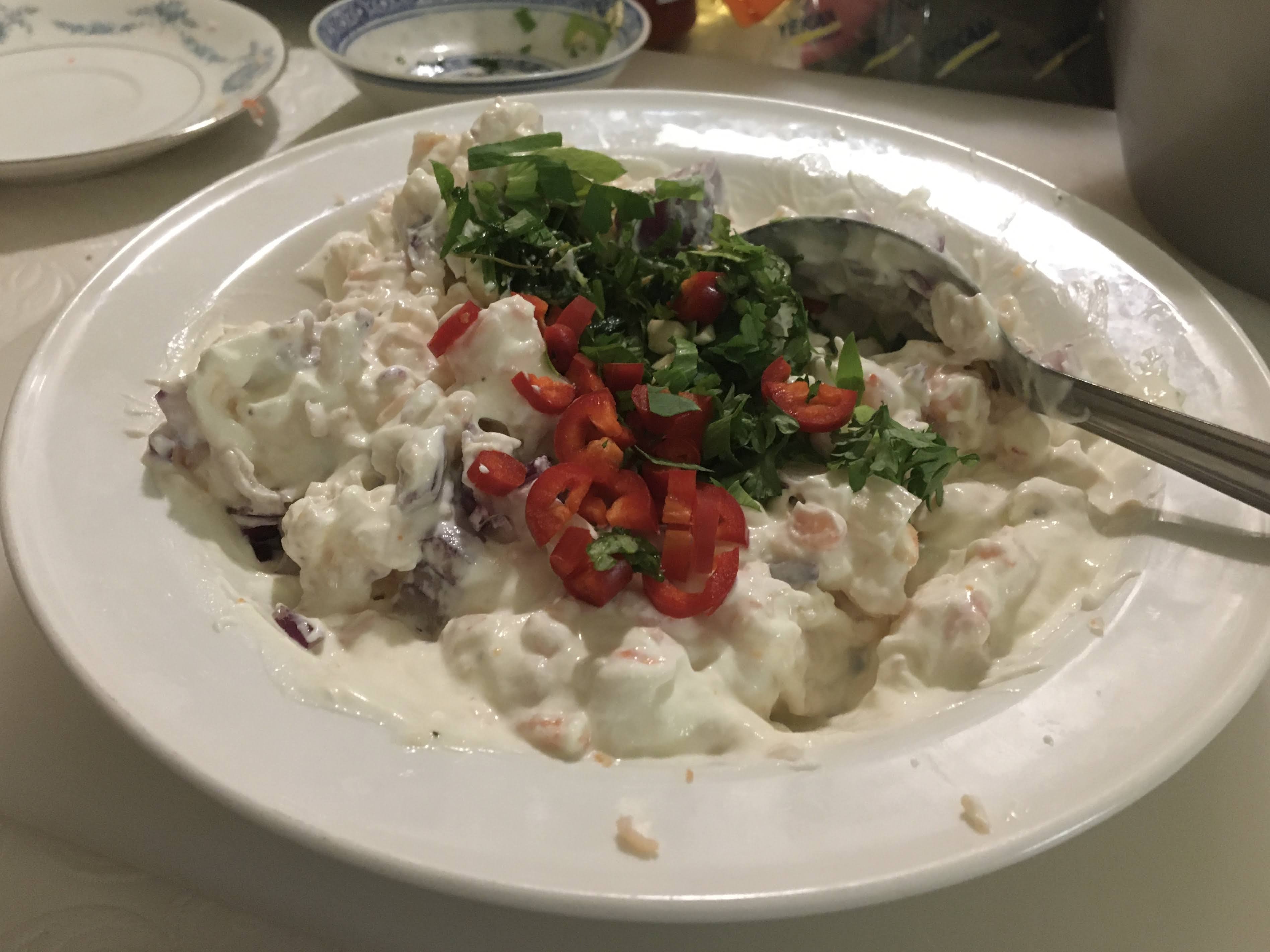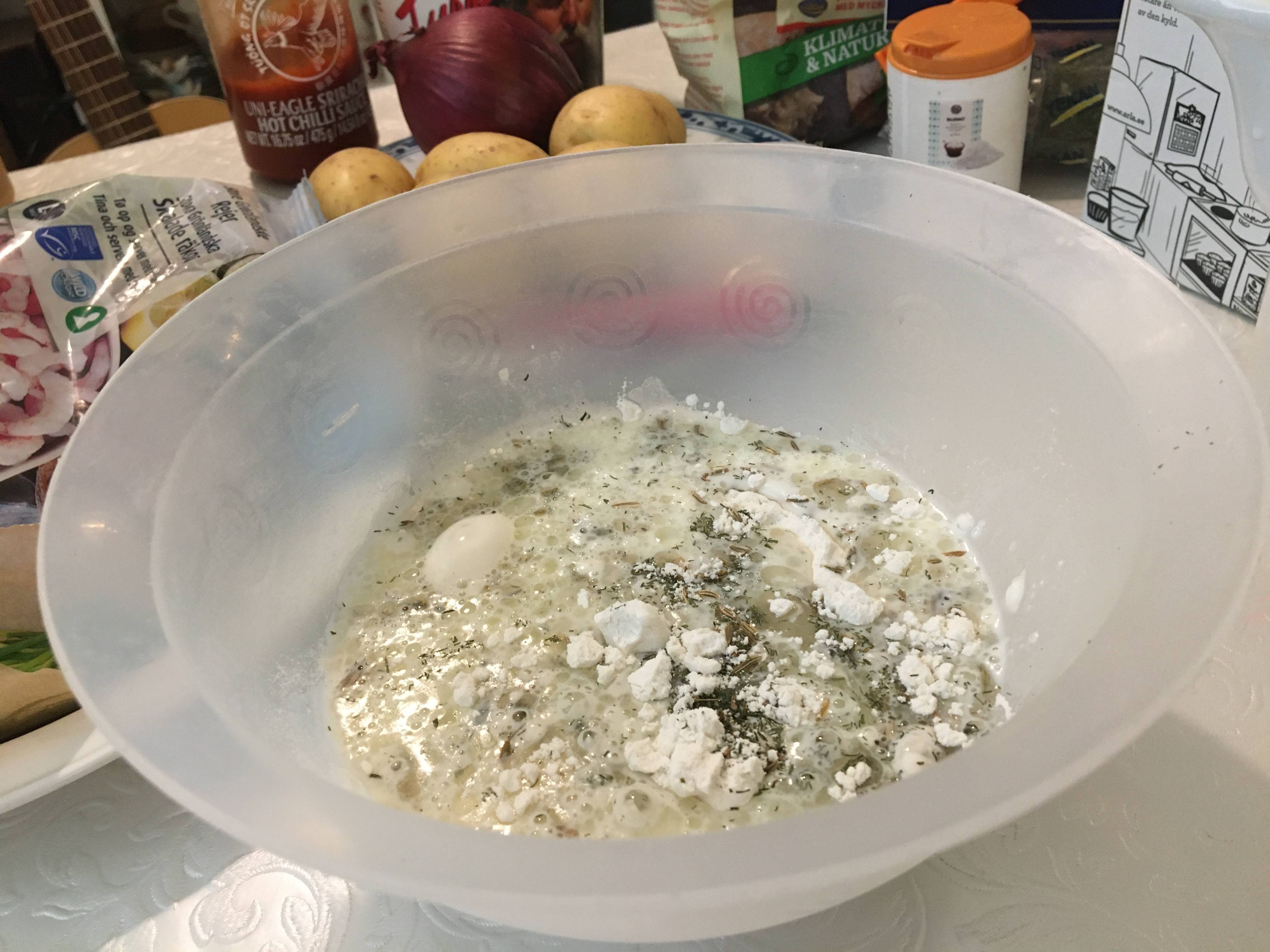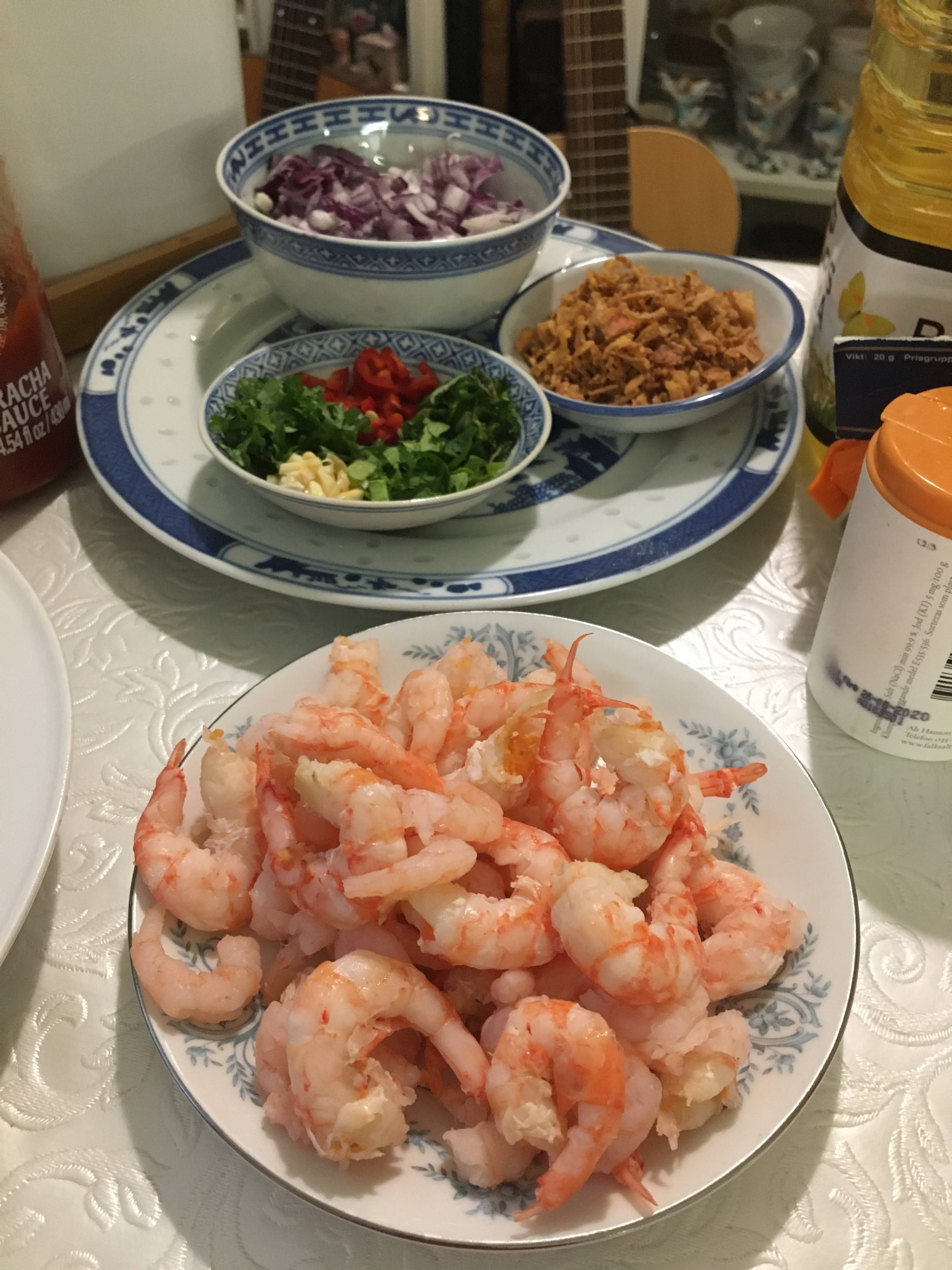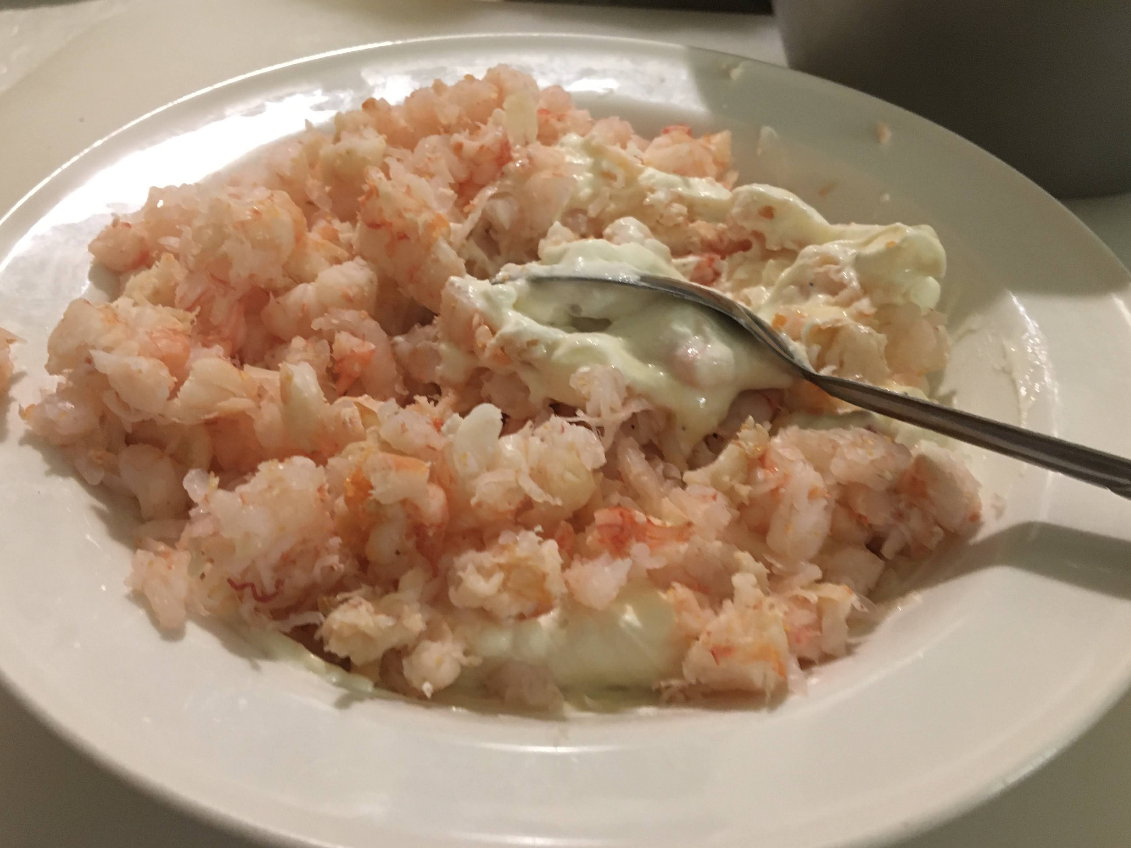 Chop the prawns and mix with rum, chopped red onion, mayonnaise, crème fraiche and chopped dill. Taste with lemon, salt and black pepper.