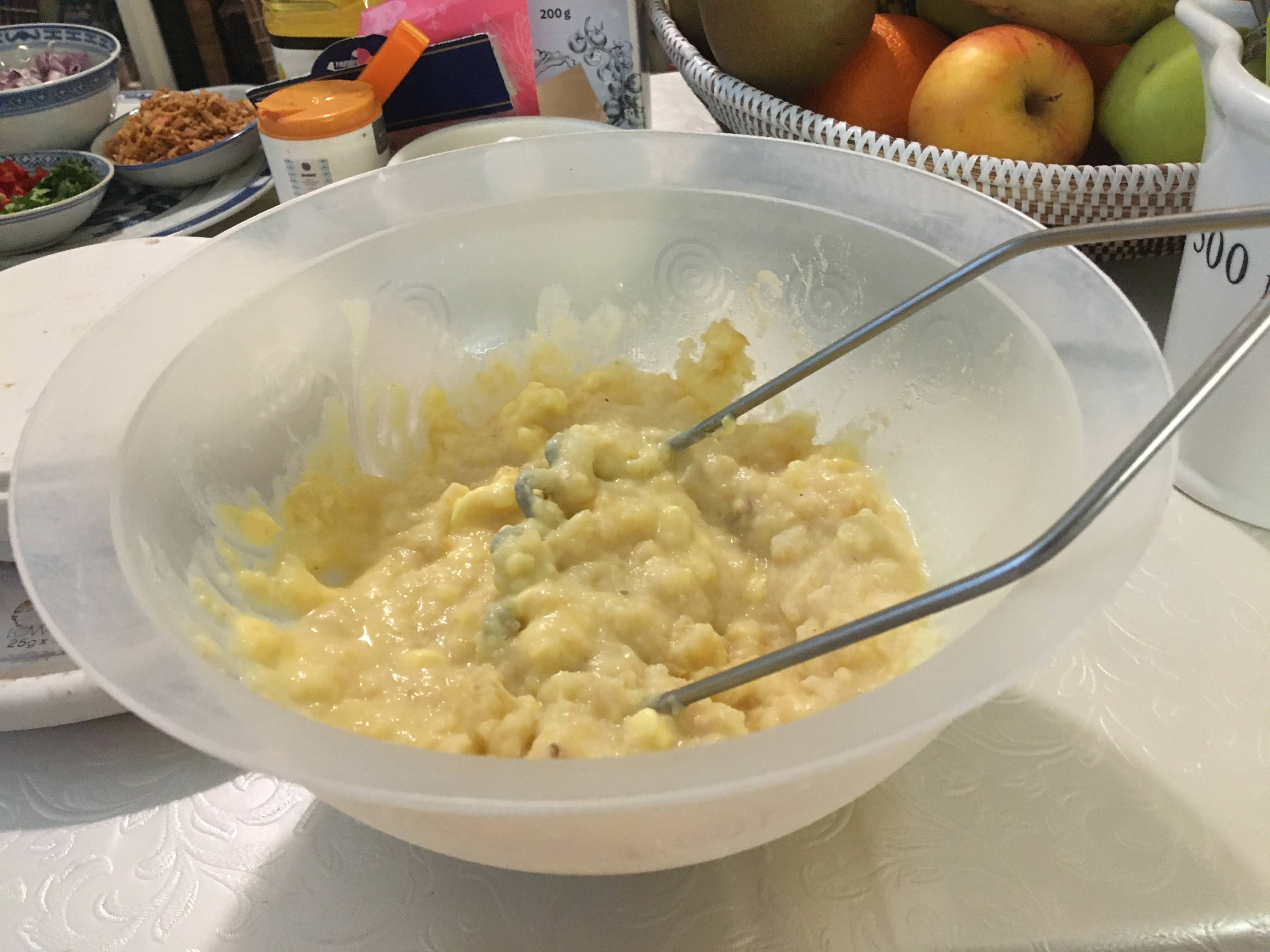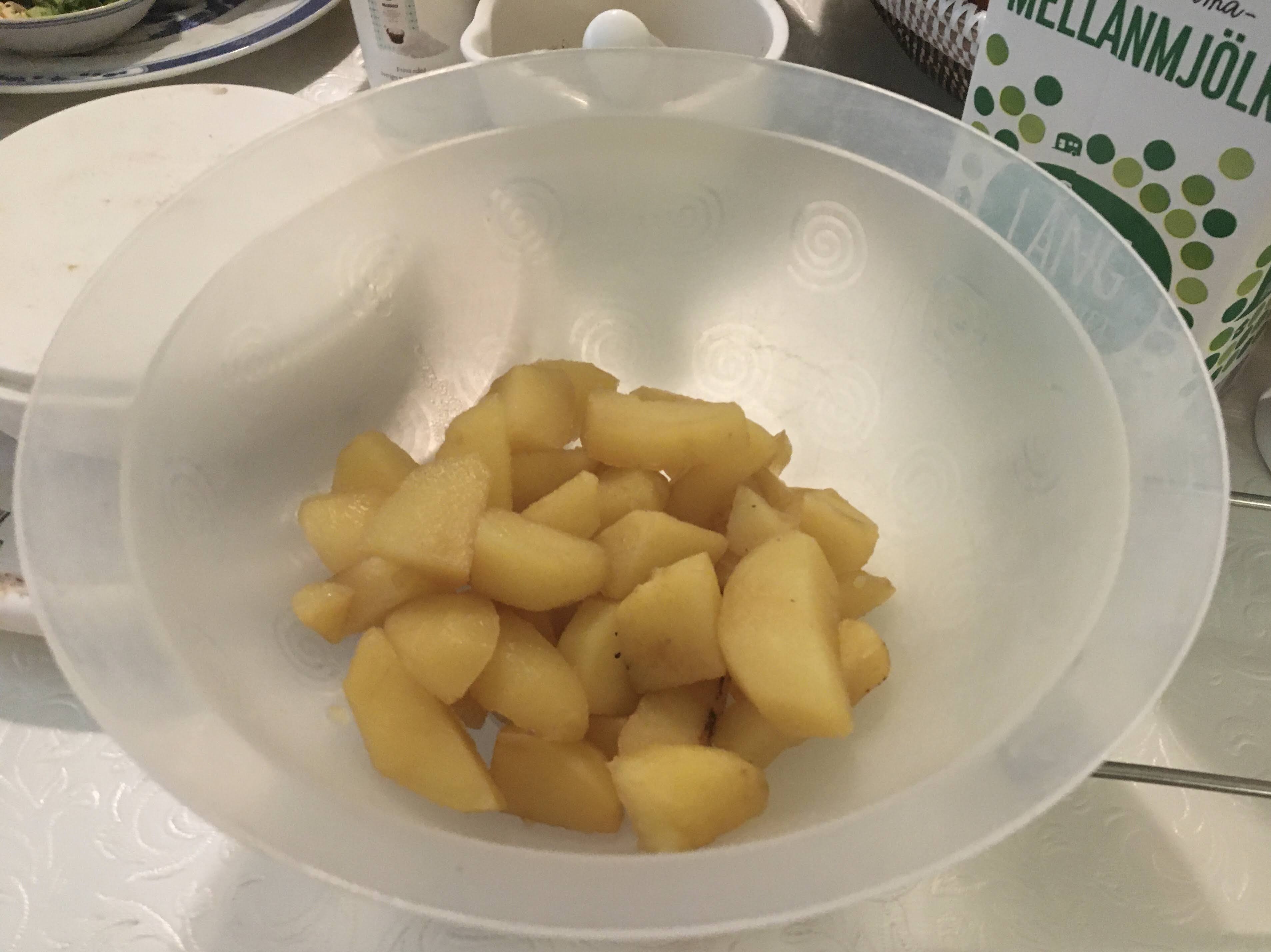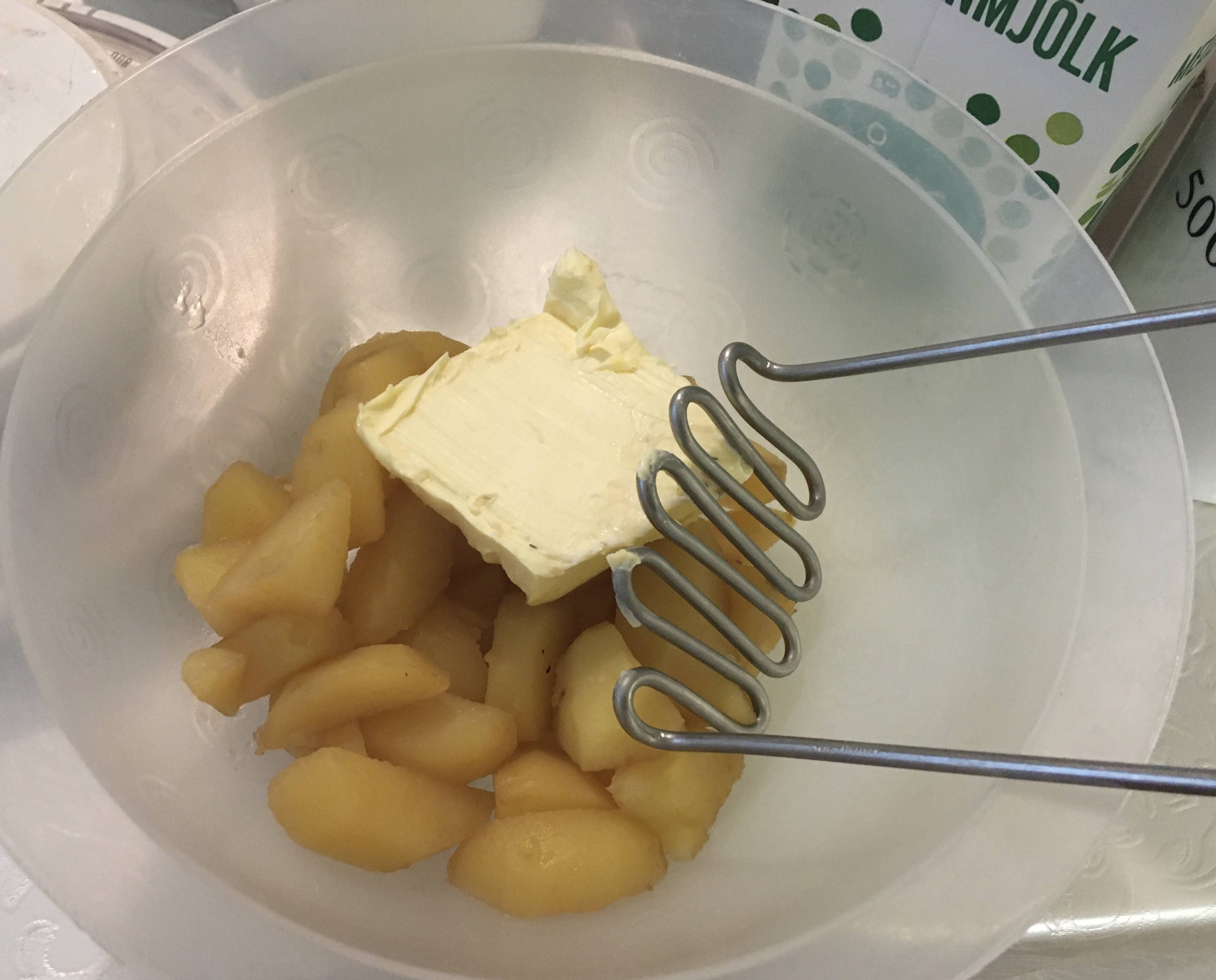 Press the potatoes and mix in the butter and salt. Then add wheat flour, a little at a time until you get a nice dough that does not stick. Roll out the dough thinly on a floured baking sheet and roll out reasonably large breads with a round shape, such as a bowl or plate. Fry the breads in a dry frying pan on medium heat for a minute or two on each side. Place directly in foil or towel so they stay soft. Allow to cool.