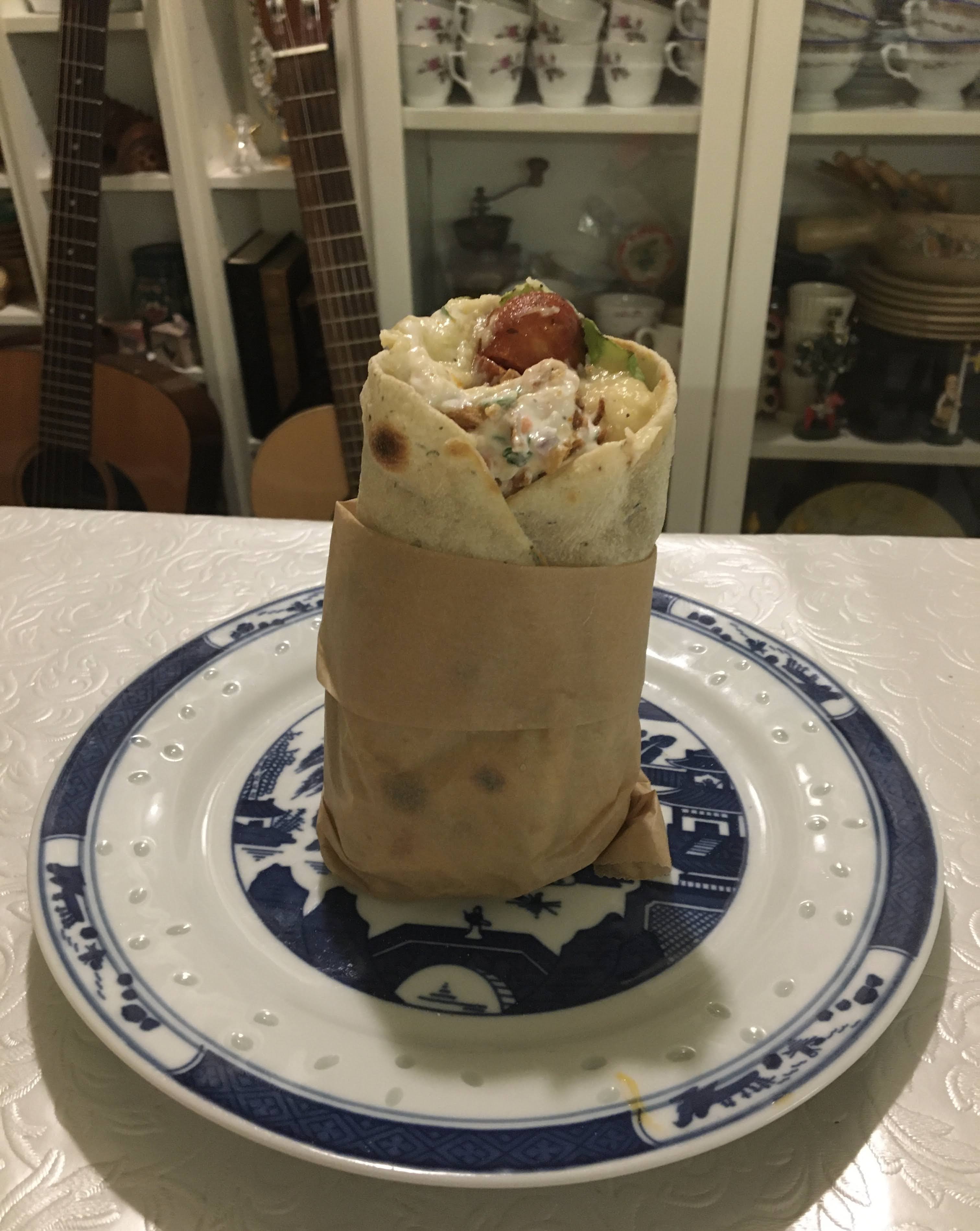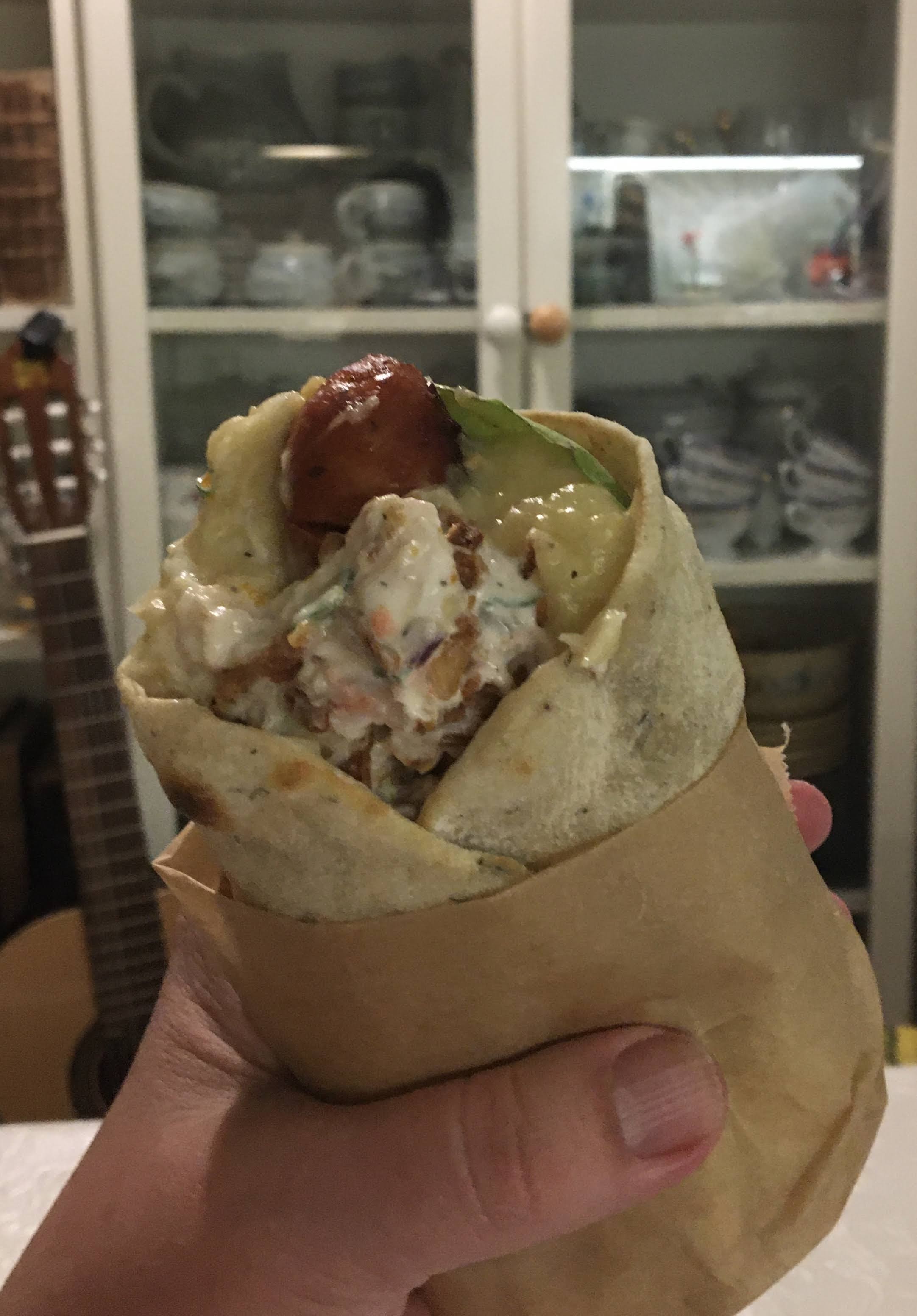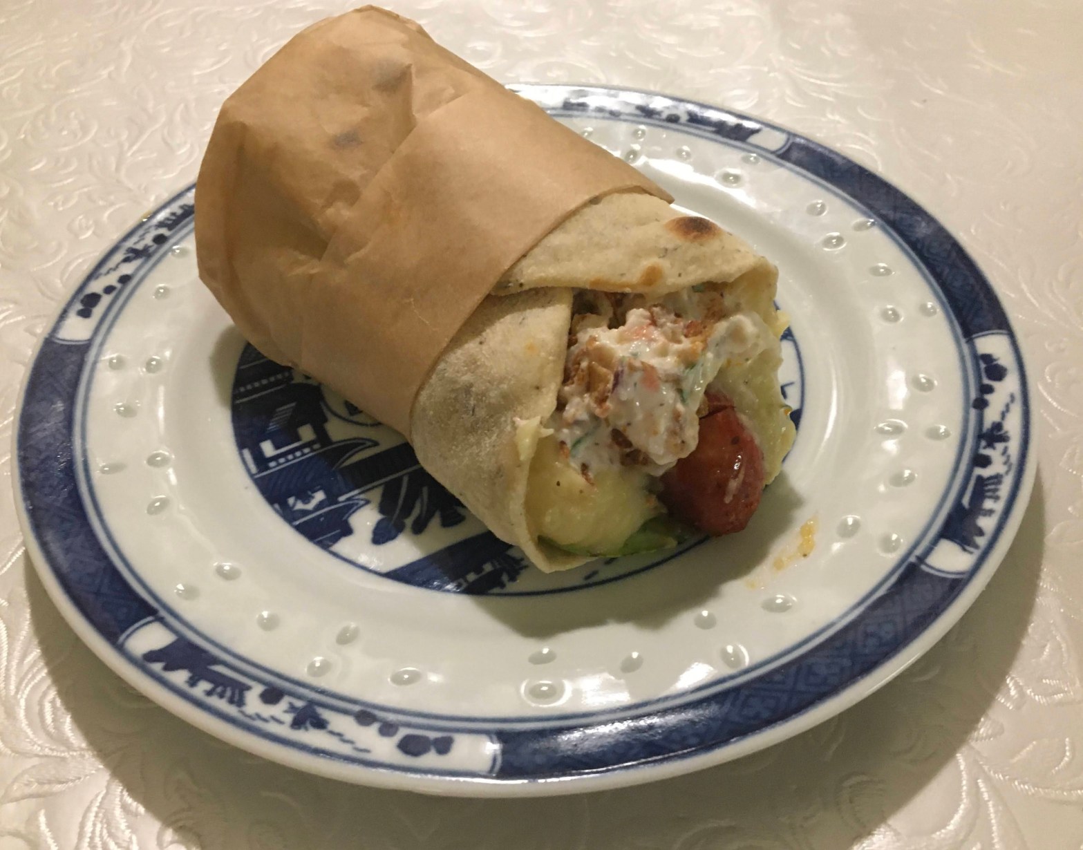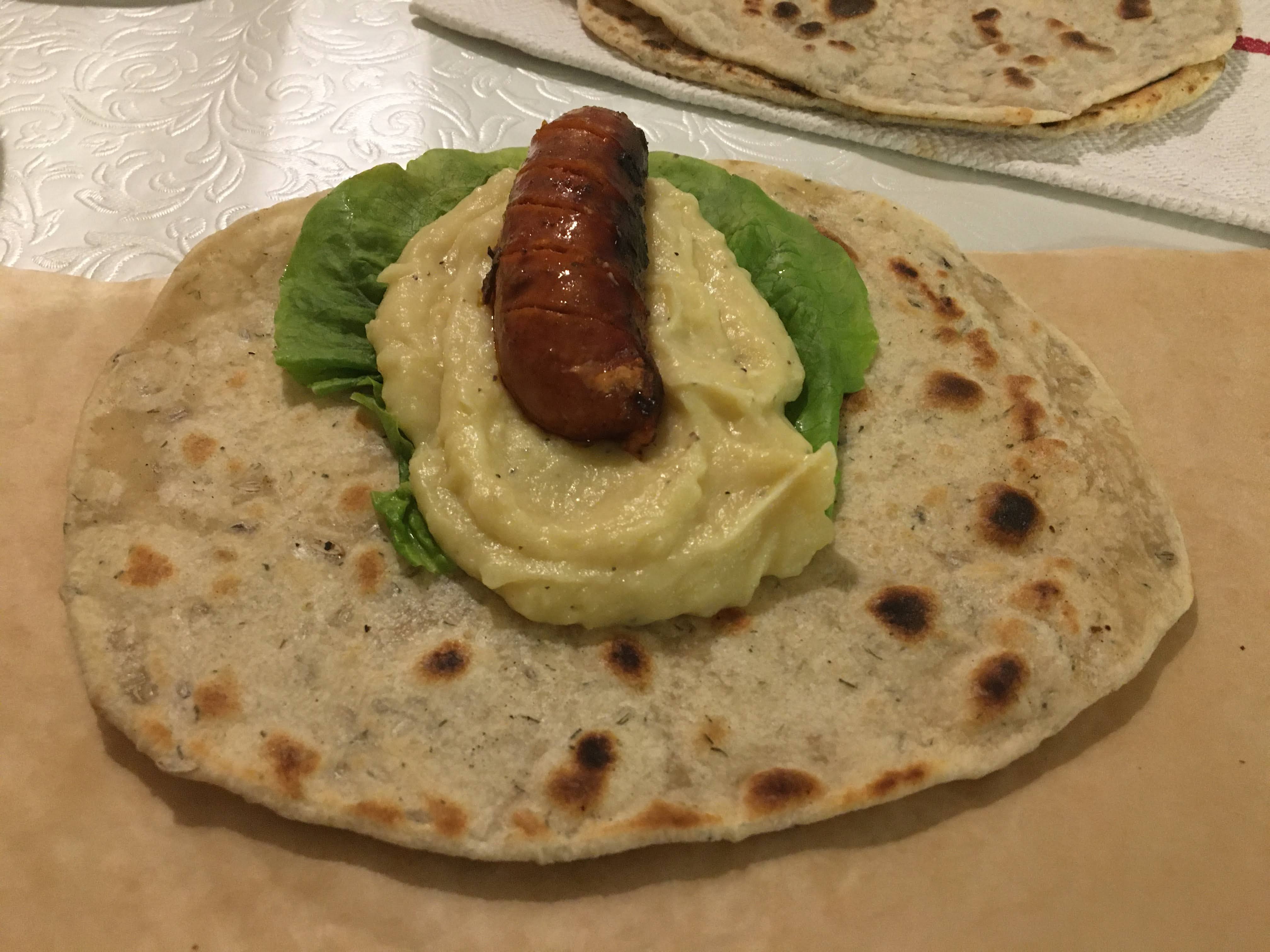 Swedish Flatbread Rolls (Flatbread Wraps) with filling is a traditional fast food meal. The filling usually consists of sausage, mashed potatoes, some form of cold salad such as cucumber, mayonnaise or shrimp salad and often also with roasted onions. As a rule, ketchup and mustard are included.