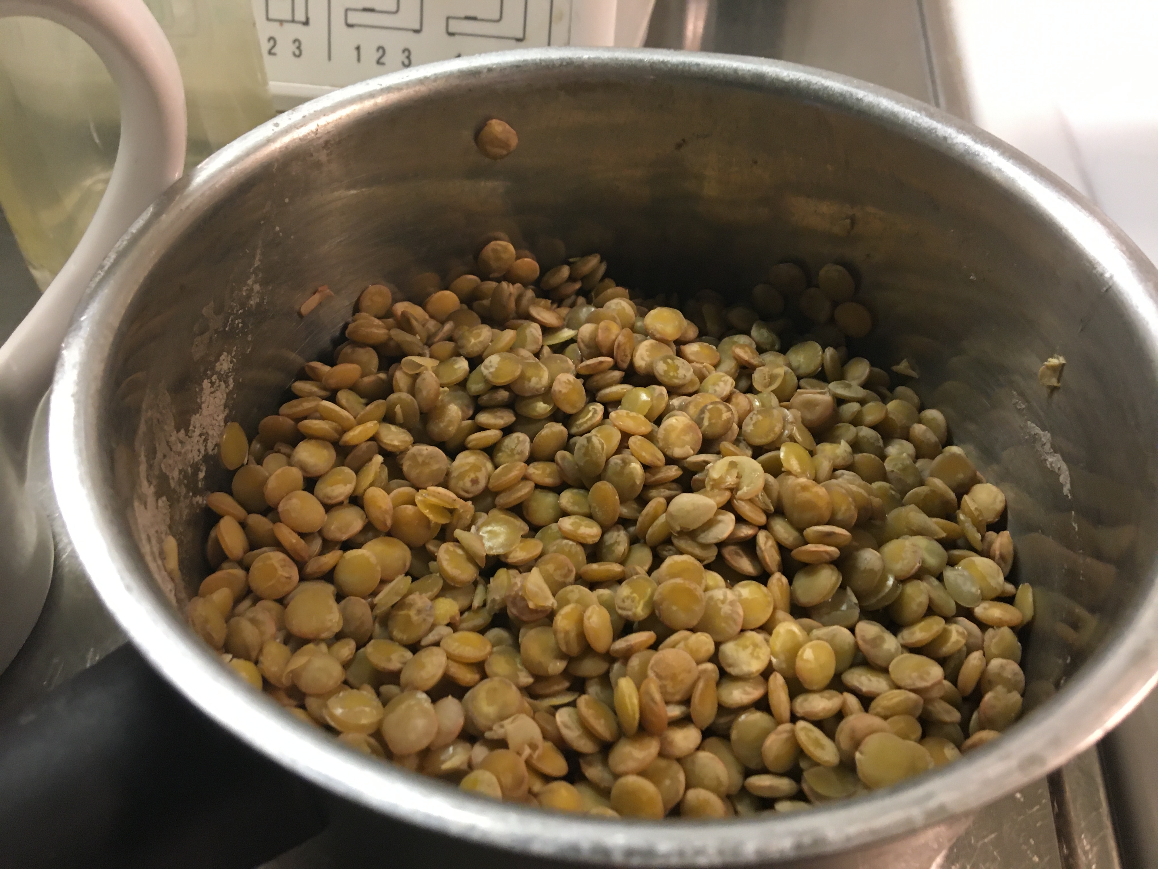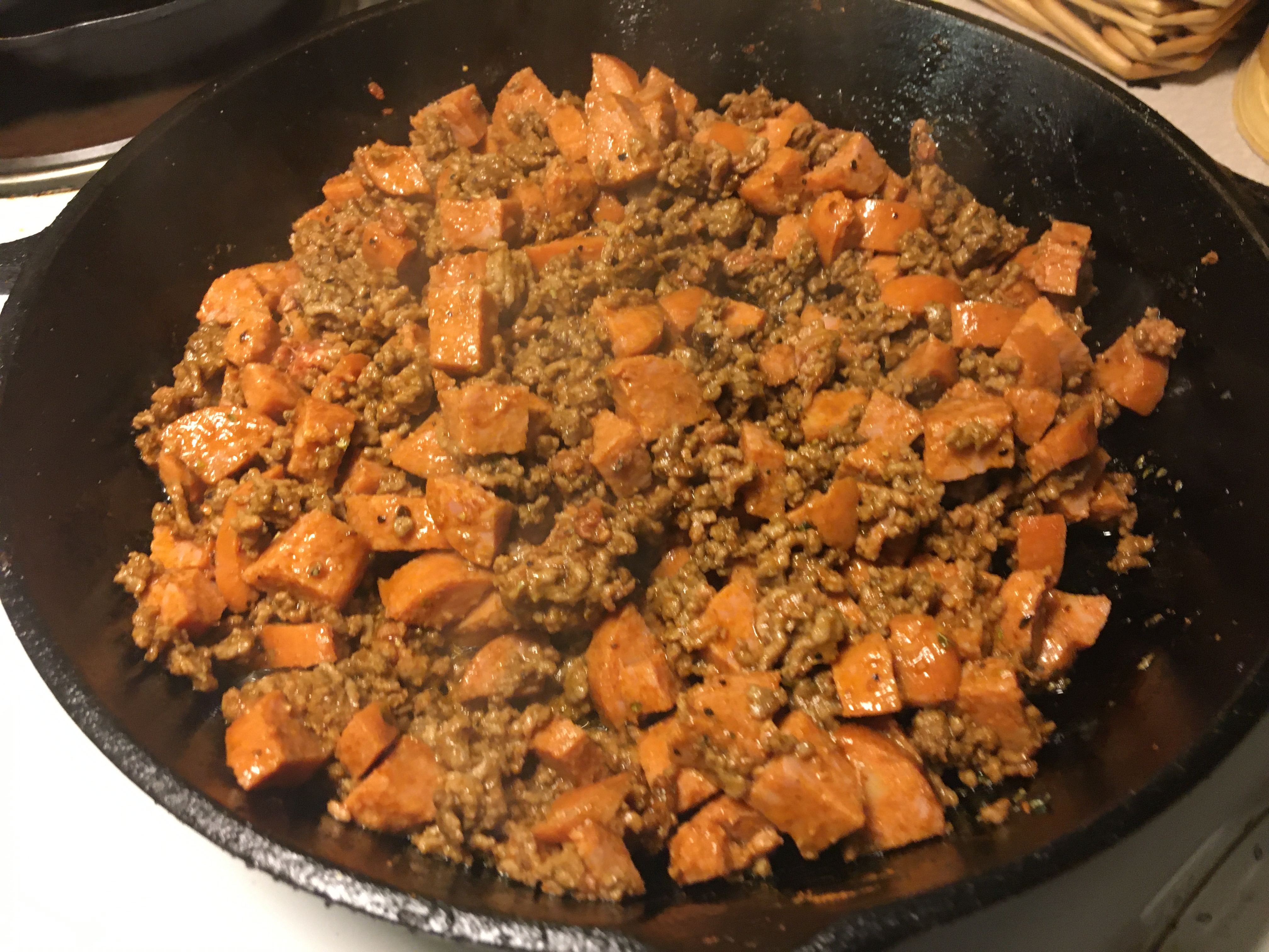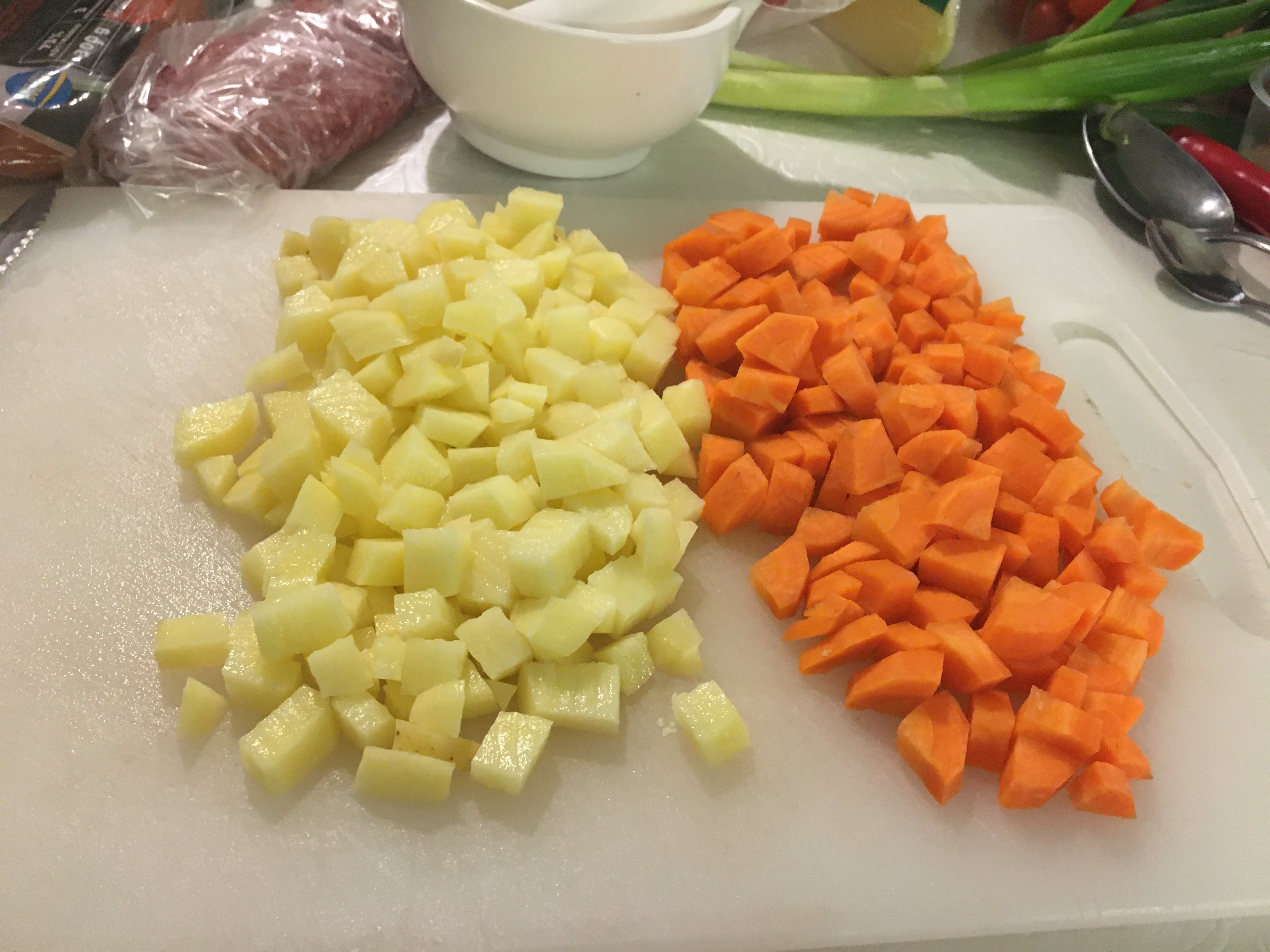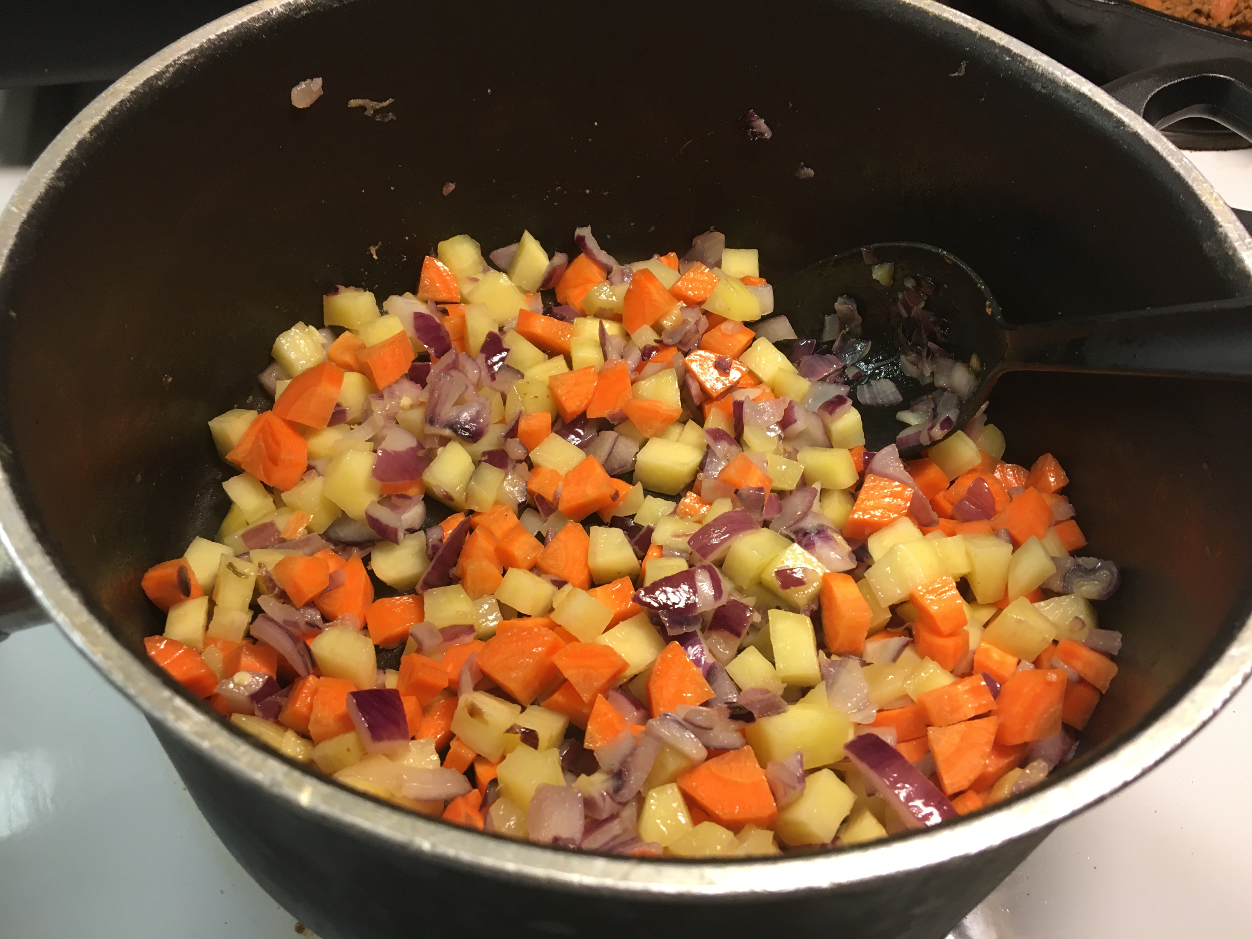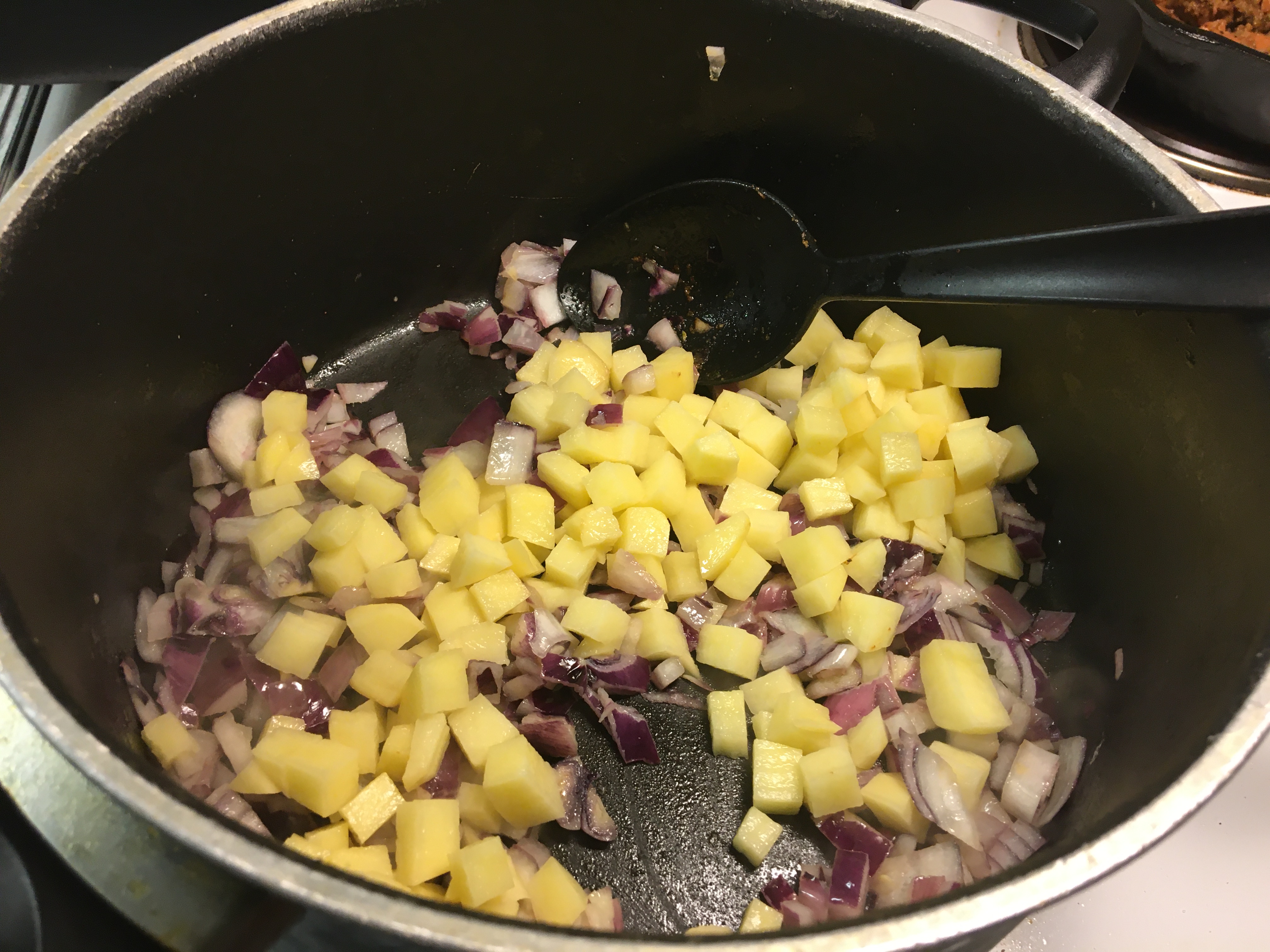 Reduce the heat to medium, add the remaining 1 tablespoon of oil, and heat until shimmering. Add the onion, pepper, and garlic and cook, stirring occasionally until softened, about 5 minutes. Add the cubed potatoes and carrots and saute for a couple minutes. Pre-boil the lentils for 10 minutes. Return the beef to the pan and stir in the lentils and the rest of the vegetables. Add the tomato paste, chili powder, cumin, oregano, salt, and pepper, and stir to combine. Cook for 2 minutes.