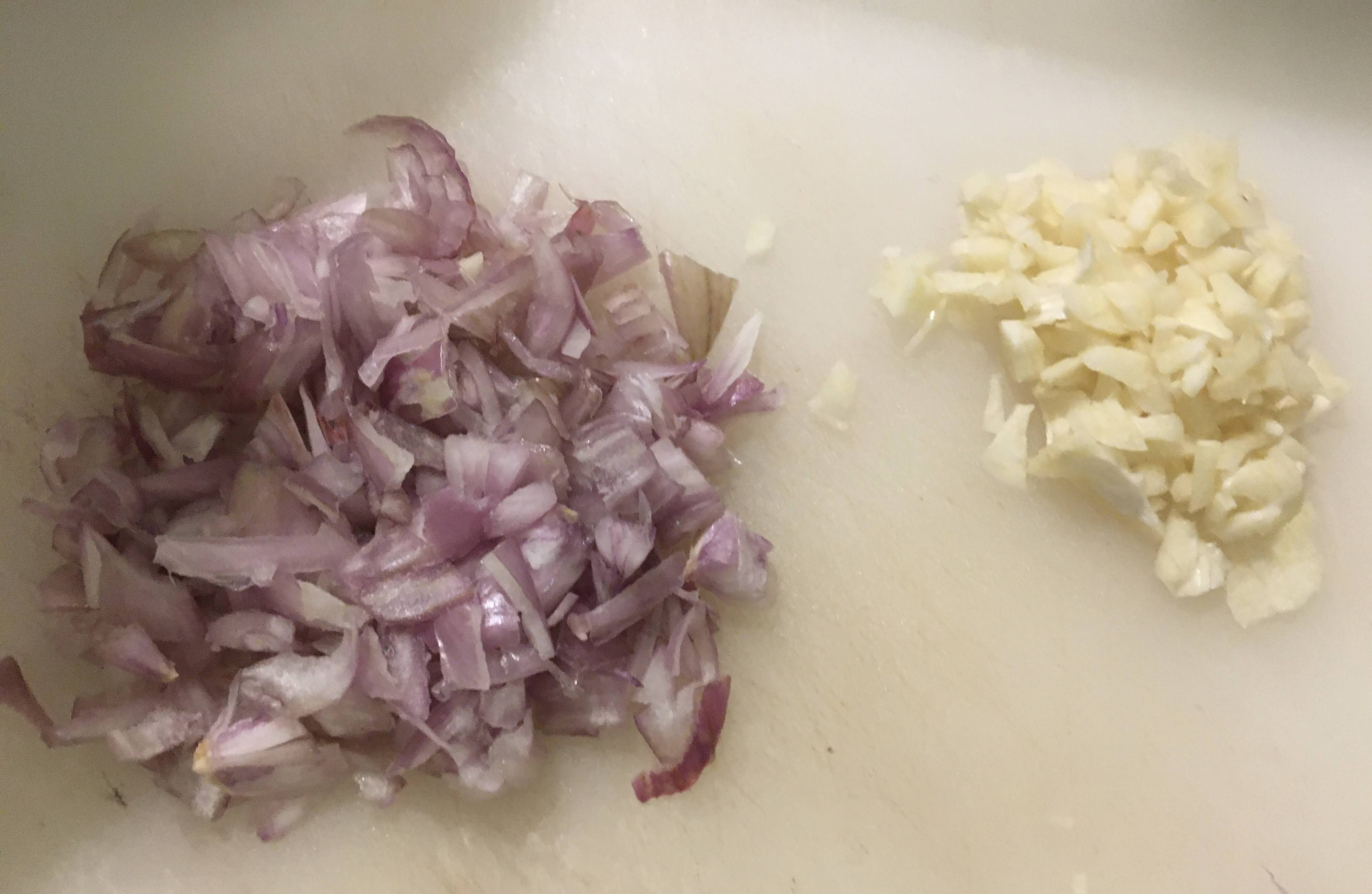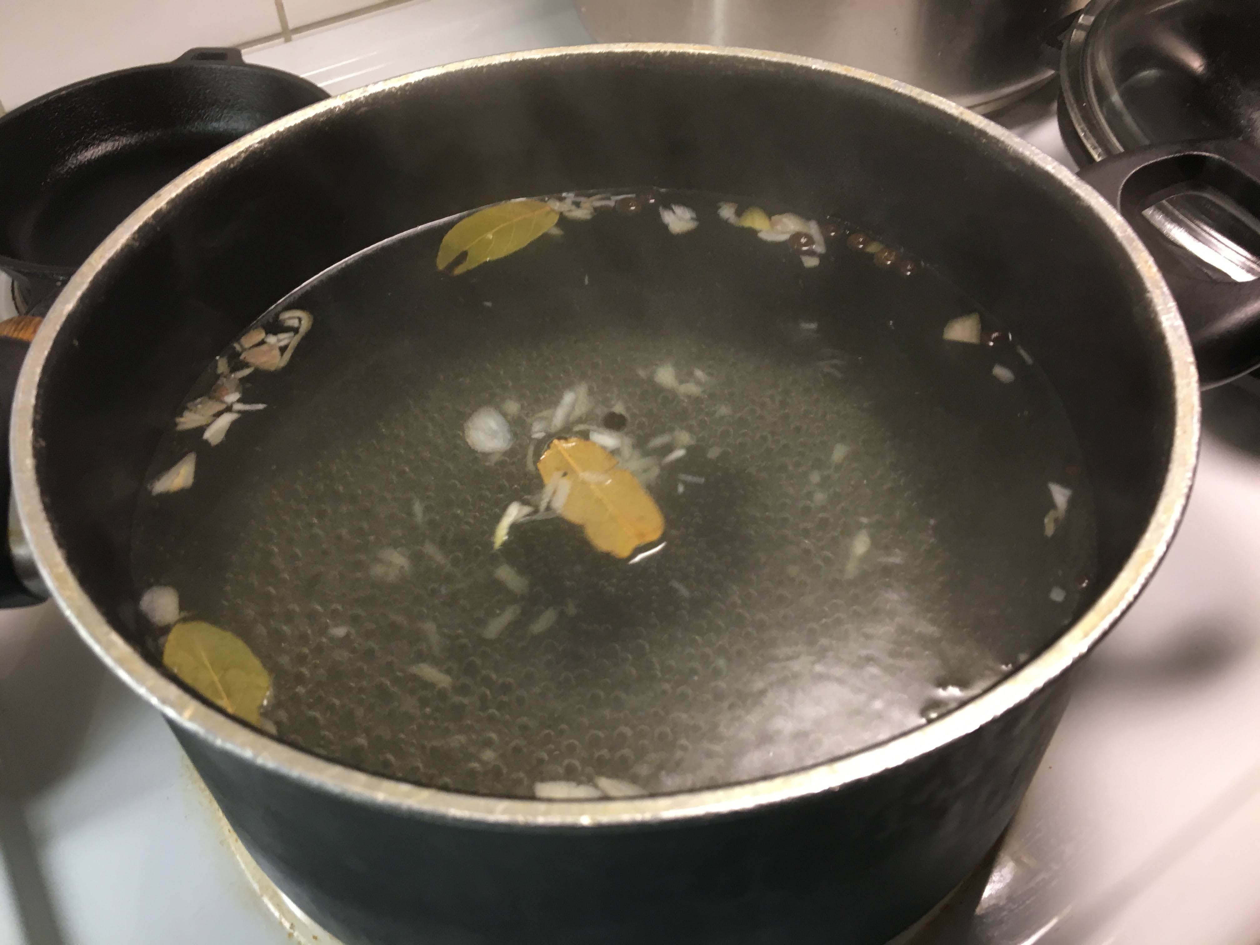 Peel and cut the onion and carrot into pieces. Boil the water together with the onion, carrot and bay leaves.