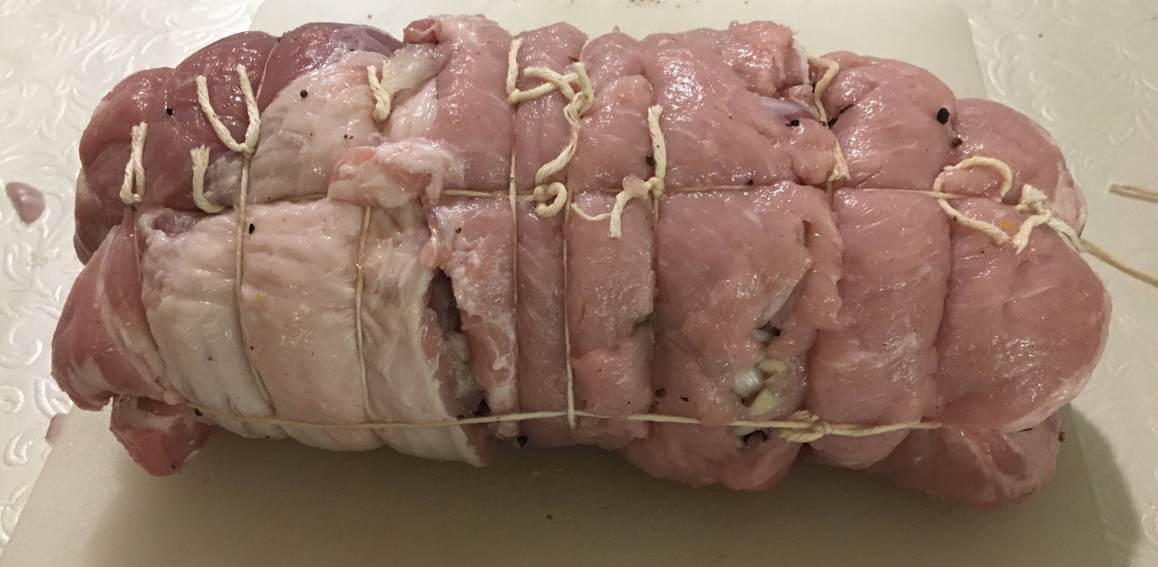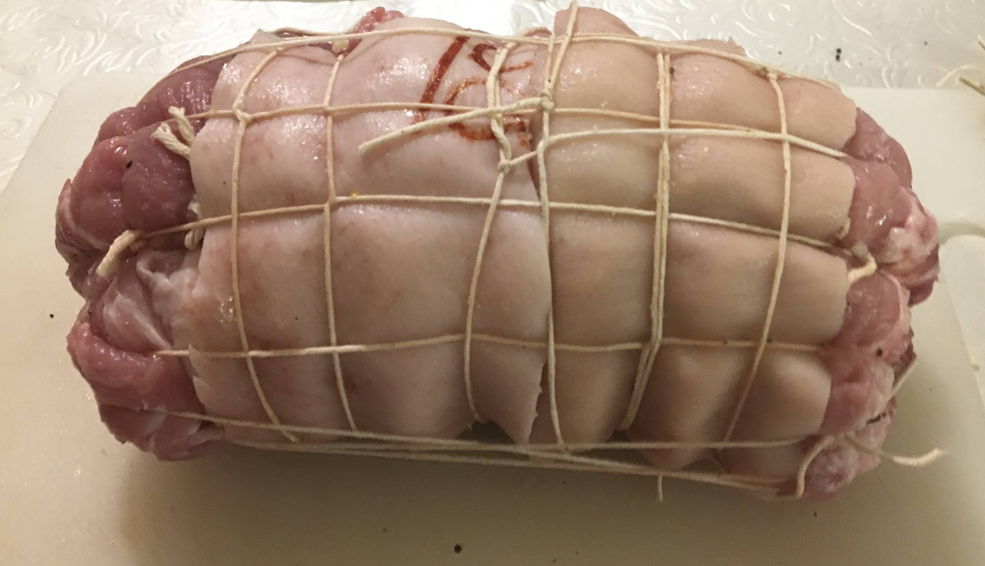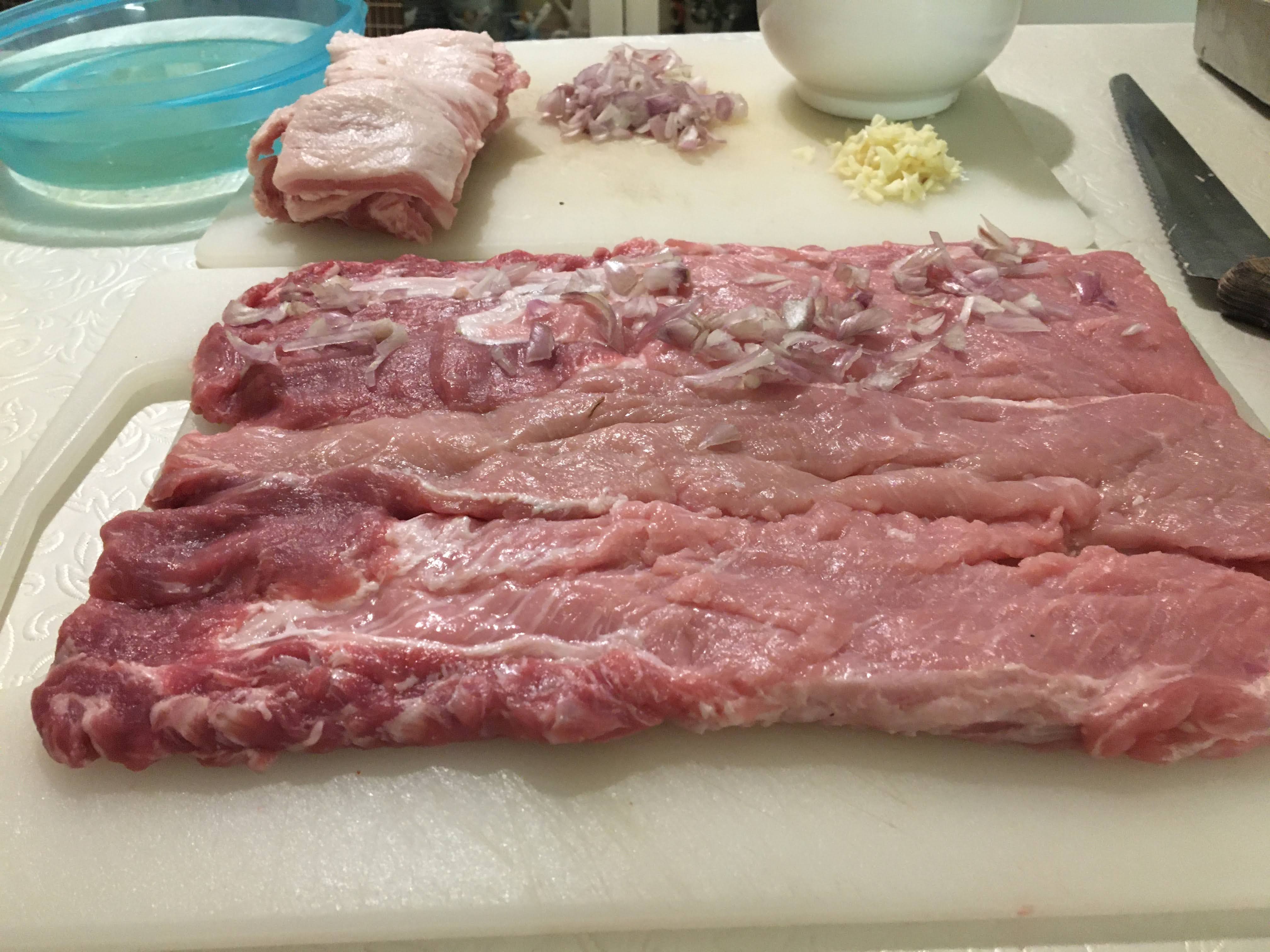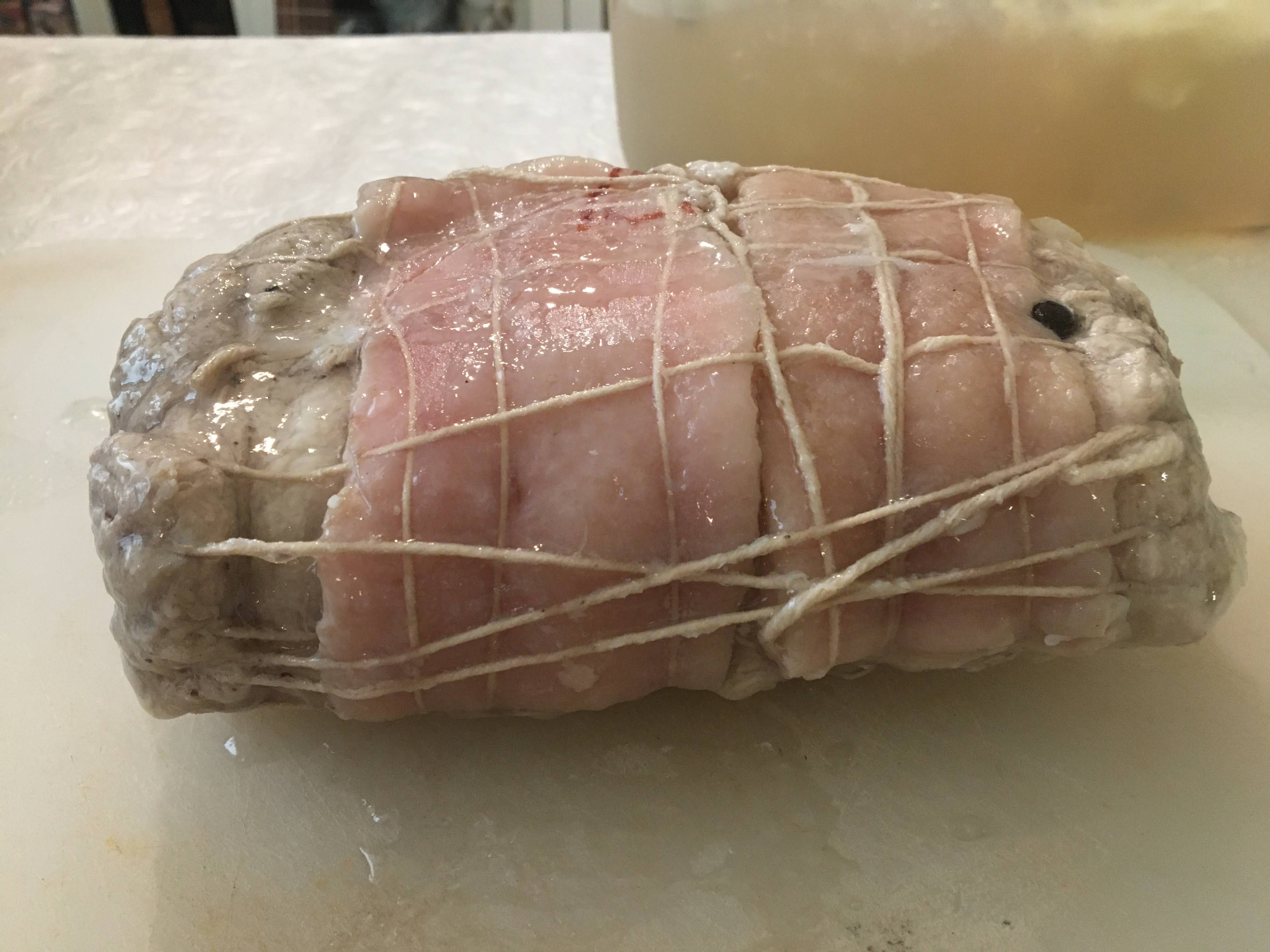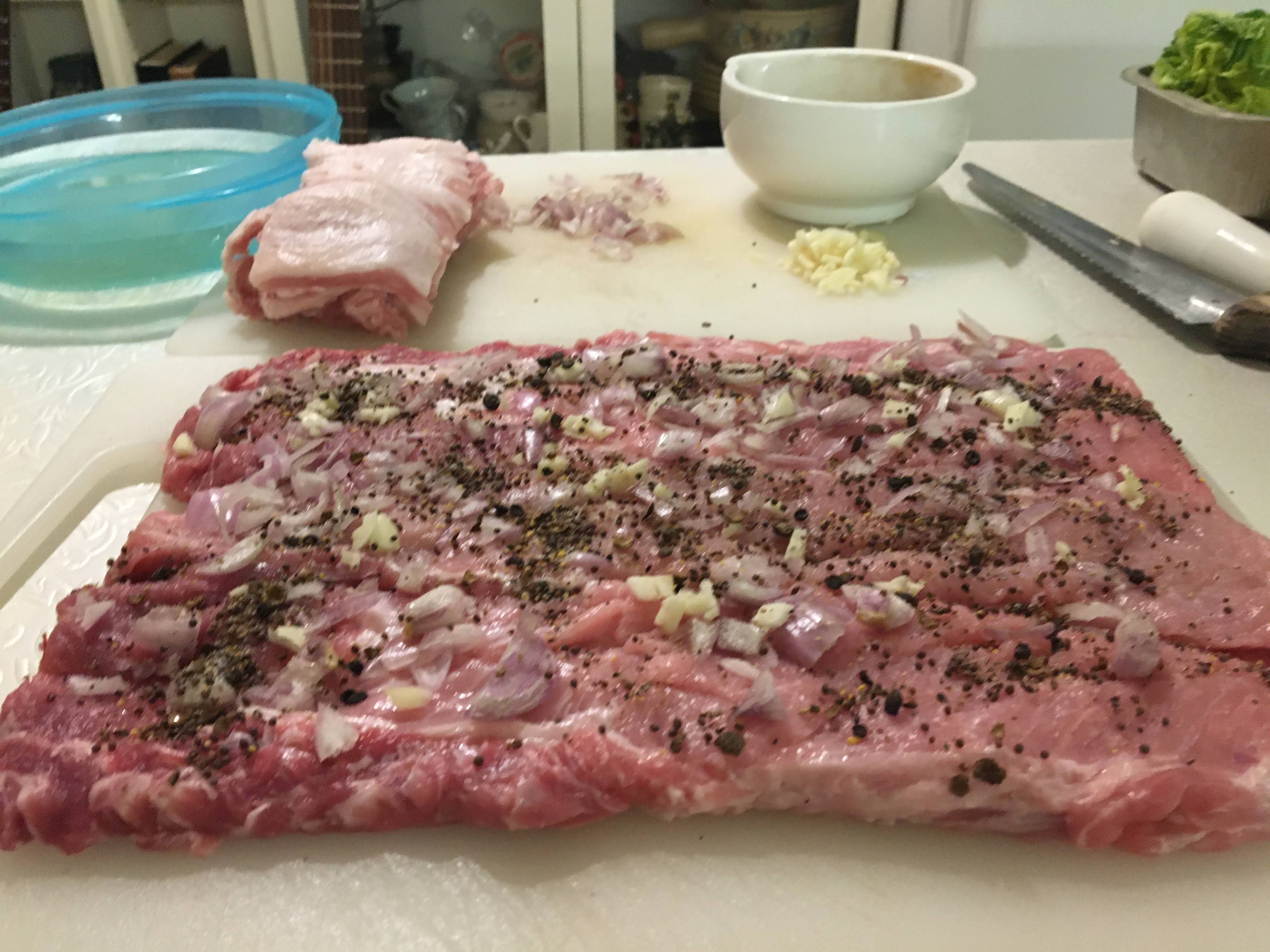 Lay out the pork with the rind side down towards the cutting board. Cut the meat into thin slices and lay out. Mortar the spices and spread over the meat. Cut the bacon into slices and place over and sprinkle spices over. Soak the gelatin sheets for five minutes. Squeeze water out of them and spread them over the meat slices and spices. Then roll all up into a hard roll. Tie together with meat string.