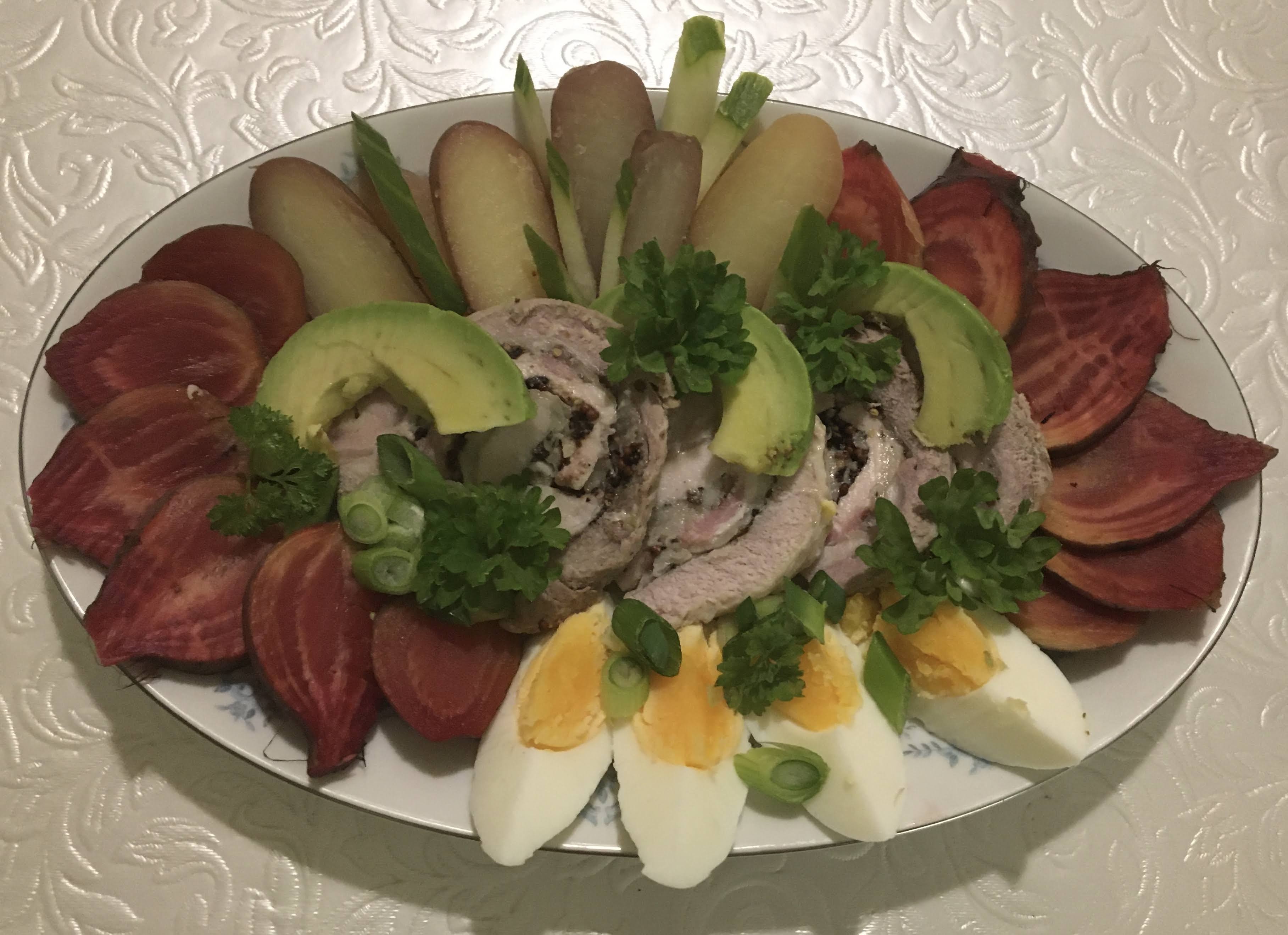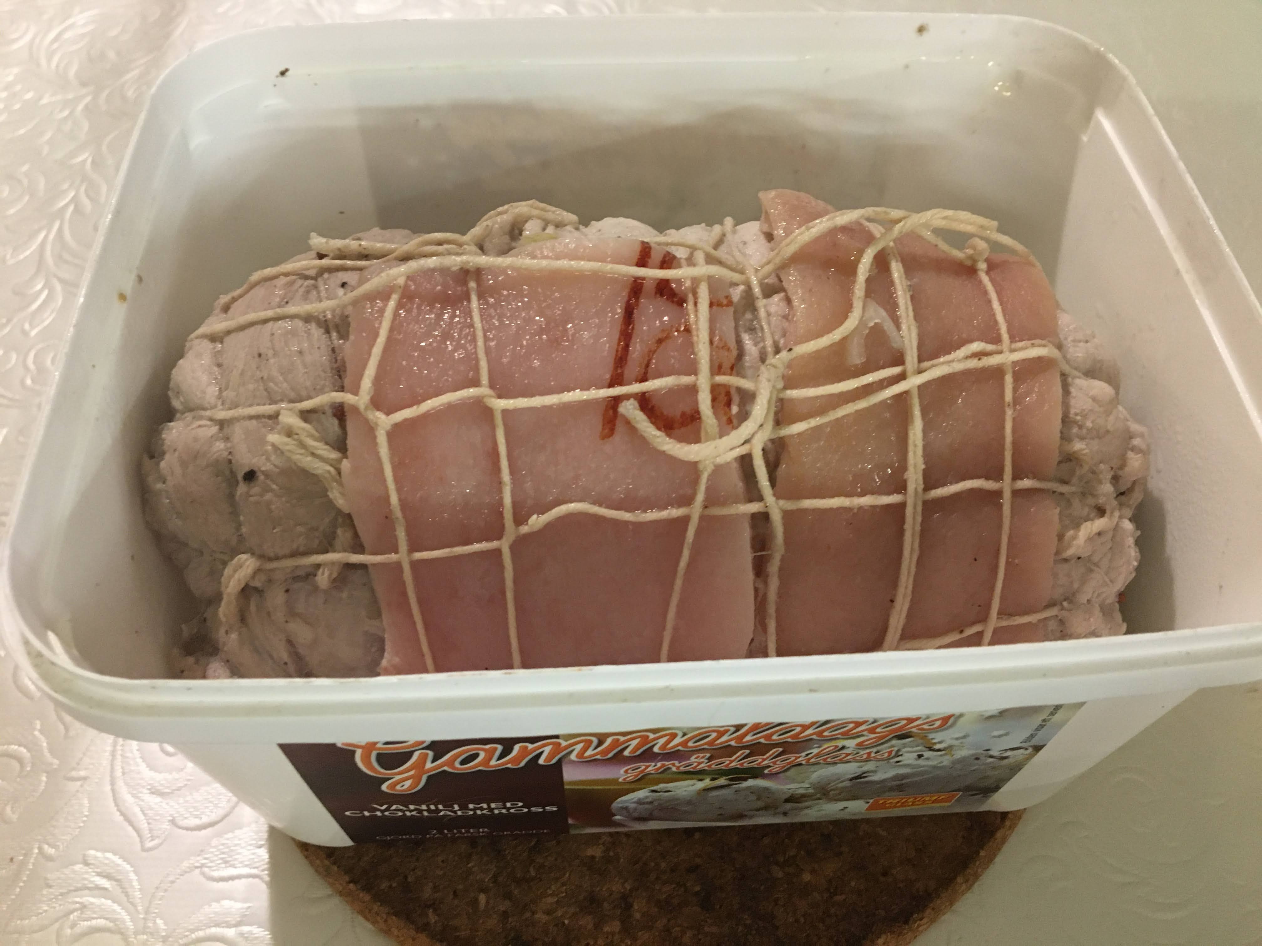 Place the roll in the water and simmer under lid 1 1 / 2–2 hours, until the meat feels tender and has reached a temperature of 70–75 ° C. Remove the roll from the pan. Put it in a mold and pour the broth around. Put pressure on top. When it has cooled completely, place the roll under pressure overnight in the refrigerator.